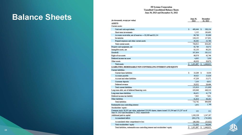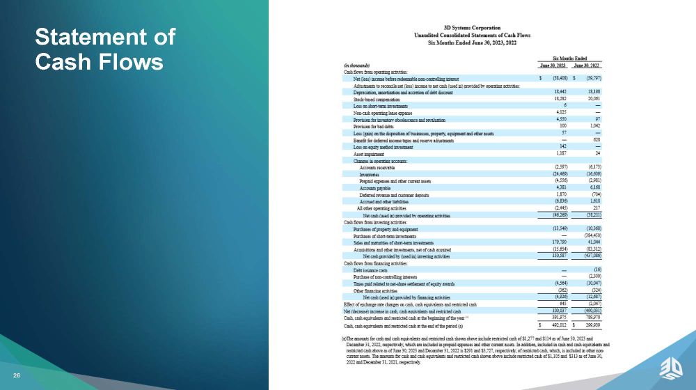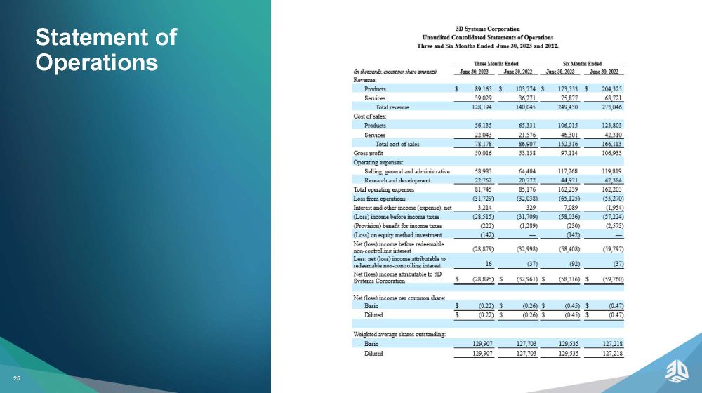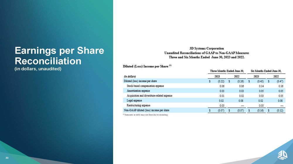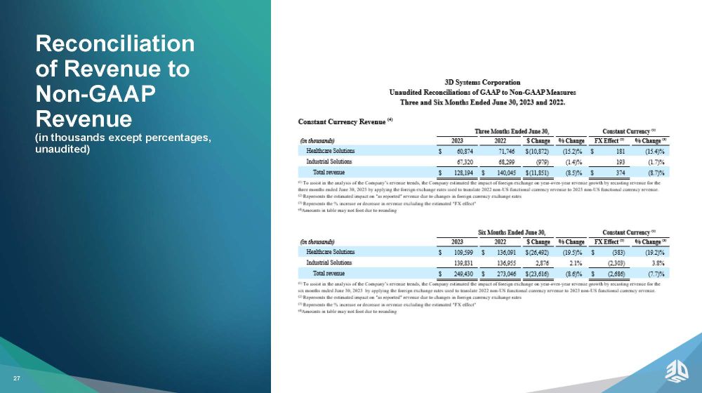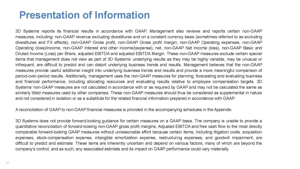 23 Presentation of Information 3 D Systems reports its financial results in accordance with GAAP . Management also reviews and reports certain non - GAAP measures, including : non - GAAP revenue excluding divestitures and on a constant currency basis (sometimes referred to as excluding divestitures and FX effects), non - GAAP Gross profit, non - GAAP Gross profit margin, non - GAAP Operating expenses, non - GAAP Operating (loss)/income, non - GAAP Interest and other income/(expense), net, non - GAAP Net income (loss), non - GAAP Basic and Diluted Income (Loss) per Share, adjusted EBITDA and adjusted EBITDA Margin . These non - GAAP measures exclude certain special items that management does not view as part of 3 D Systems’ underlying results as they may be highly variable, may be unusual or infrequent, are difficult to predict and can distort underlying business trends and results . Management believes that the non - GAAP measures provide useful additional insight into underlying business trends and results and provide a more meaningful comparison of period - over - period results . Additionally, management uses the non - GAAP measures for planning, forecasting and evaluating business and financial performance, including allocating resources and evaluating results relative to employee compensation targets . 3 D Systems’ non - GAAP measures are not calculated in accordance with or as required by GAAP and may not be calculated the same as similarly titled measures used by other companies . These non - GAAP measures should thus be considered as supplemental in nature and not considered in isolation or as a substitute for the related financial information prepared in accordance with GAAP . A reconciliation of GAAP to non - GAAP financial measures is provided in the accompanying schedules in the Appendix . 3 D Systems does not provide forward - looking guidance for certain measures on a GAAP basis . The company is unable to provide a quantitative reconciliation of forward - looking non - GAAP gross profit margins, Adjusted EBITDA and free cash flow to the most directly comparable forward - looking GAAP measures without unreasonable effort because certain items, including litigation costs, acquisition expenses, stock - compensation expense, intangible amortization expense, restructuring expenses, and goodwill impairment, are difficult to predict and estimate . These items are inherently uncertain and depend on various factors, many of which are beyond the company’s control, and as such, any associated estimate and its impact on GAAP performance could vary materially .