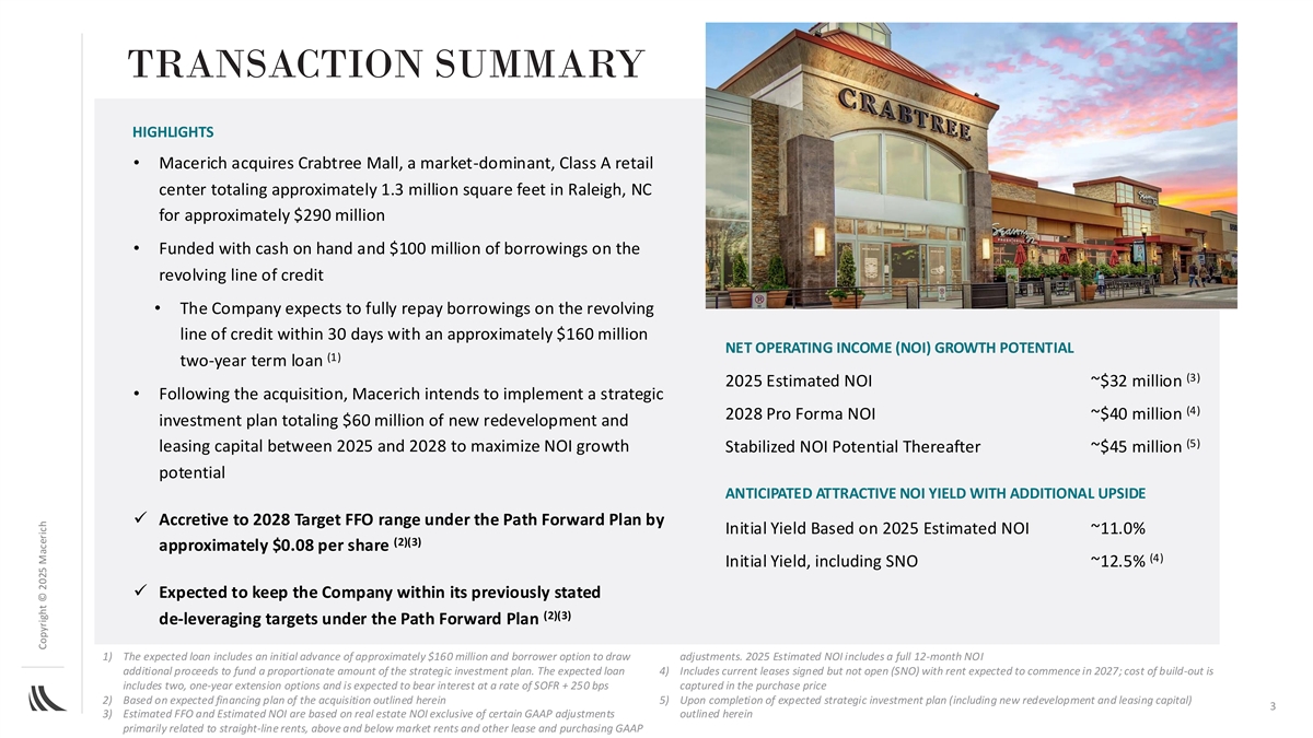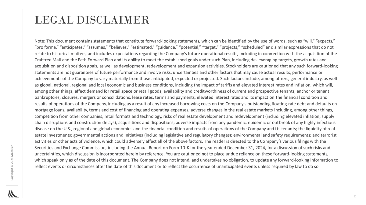 LEGAL DISCLAIMER Note: This document contains statements that constitute forward-looking statements, which can be identified by the use of words, such as “will,” “expects,” “pro forma,” “anticipates,” “assumes,” “believes,” “estimated,” “guidance,” “potential,” “target,” “projects,” “scheduled” and similar expressions that do not relate to historical matters, and includes expectations regarding the Company’s future operational results, including in connection with the acquisition of the Crabtree Mall and the Path Forward Plan and its ability to meet the established goals under such Plan, including de-leveraging targets, growth rates and acquisition and disposition goals, as well as development, redevelopment and expansion activities. Stockholders are cautioned that any such forward-looking statements are not guarantees of future performance and involve risks, uncertainties and other factors that may cause actual results, performance or achievements of the Company to vary materially from those anticipated, expected or projected. Such factors include, among others, general industry, as well as global, national, regional and local economic and business conditions, including the impact of tariffs and elevated interest rates and inflation, which will, among other things, affect demand for retail space or retail goods, availability and creditworthiness of current and prospective tenants, anchor or tenant bankruptcies, closures, mergers or consolidations, lease rates, terms and payments, elevated interest rates and its impact on the financial condition and results of operations of the Company, including as a result of any increased borrowing costs on the Company's outstanding floating-rate debt and defaults on mortgage loans, availability, terms and cost of financing and operating expenses; adverse changes in the real estate markets including, among other things, competition from other companies, retail formats and technology, risks of real estate development and redevelopment (including elevated inflation, supply chain disruptions and construction delays), acquisitions and dispositions; adverse impacts from any pandemic, epidemic or outbreak of any highly infectious disease on the U.S., regional and global economies and the financial condition and results of operations of the Company and its tenants; the liquidity of real estate investments; governmental actions and initiatives (including legislative and regulatory changes); environmental and safety requirements; and terrorist activities or other acts of violence, which could adversely affect all of the above factors. The reader is directed to the Company’s various filings with the Securities and Exchange Commission, including the Annual Report on Form 10-K for the year ended December 31, 2024, for a discussion of such risks and uncertainties, which discussion is incorporated herein by reference. You are cautioned not to place undue reliance on these forward-looking statements, which speak only as of the date of this document. The Company does not intend, and undertakes no obligation, to update any forward-looking information to reflect events or circumstances after the date of this document or to reflect the occurrence of unanticipated events unless required by law to do so. 2 Copyright © 2025 Macerich