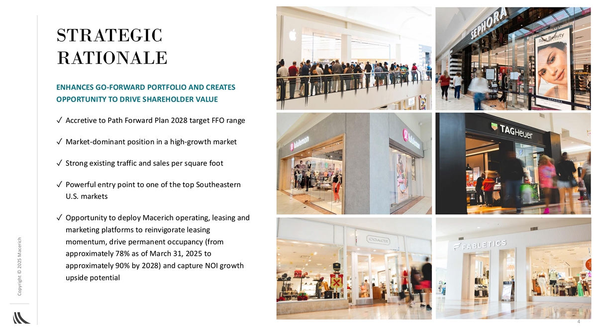 TRANSACTION SUMMARY HIGHLIGHTS • Macerich acquires Crabtree Mall, a market-dominant, Class A retail center totaling approximately 1.3 million square feet in Raleigh, NC for approximately $290 million • Funded with cash on hand and $100 million of borrowings on the revolving line of credit • The Company expects to fully repay borrowings on the revolving line of credit within 30 days with an approximately $160 million NET OPERATING INCOME (NOI) GROWTH POTENTIAL (1) two-year term loan (3) 2025 Estimated NOI ~$32 million • Following the acquisition, Macerich intends to implement a strategic (4) 2028 Pro Forma NOI ~$40 million investment plan totaling $60 million of new redevelopment and (5) leasing capital between 2025 and 2028 to maximize NOI growth Stabilized NOI Potential Thereafter ~$45 million potential ANTICIPATED ATTRACTIVE NOI YIELD WITH ADDITIONAL UPSIDE ✓ Accretive to 2028 Target FFO range under the Path Forward Plan by Initial Yield Based on 2025 Estimated NOI ~11.0% (2)(3) approximately $0.08 per share (4) Initial Yield, including SNO ~12.5% ✓ Expected to keep the Company within its previously stated (2)(3) de-leveraging targets under the Path Forward Plan 1) The expected loan includes an initial advance of approximately $160 million and borrower option to draw adjustments. 2025 Estimated NOI includes a full 12-month NOI additional proceeds to fund a proportionate amount of the strategic investment plan. The expected loan 4) Includes current leases signed but not open (SNO) with rent expected to commence in 2027; cost of build-out is includes two, one-year extension options and is expected to bear interest at a rate of SOFR + 250 bps captured in the purchase price 2) Based on expected financing plan of the acquisition outlined herein 5) Upon completion of expected strategic investment plan (including new redevelopment and leasing capital) 3 3) Estimated FFO and Estimated NOI are based on real estate NOI exclusive of certain GAAP adjustments outlined herein primarily related to straight-line rents, above and below market rents and other lease and purchasing GAAP Copyright © 2025 Macerich