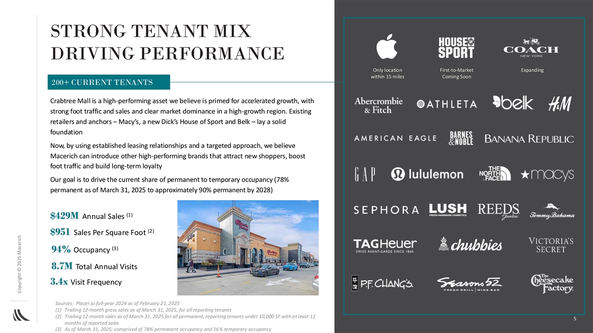 STRATEGIC RATIONALE ENHANCES GO-FORWARD PORTFOLIO AND CREATES OPPORTUNITY TO DRIVE SHAREHOLDER VALUE ✓ Accretive to Path Forward Plan 2028 target FFO range ✓ Market-dominant position in a high-growth market ✓ Strong existing traffic and sales per square foot ✓ Powerful entry point to one of the top Southeastern U.S. markets ✓ Opportunity to deploy Macerich operating, leasing and marketing platforms to reinvigorate leasing momentum, drive permanent occupancy (from approximately 78% as of March 31, 2025 to approximately 90% by 2028) and capture NOI growth upside potential 4 Copyright © 2025 Macerich