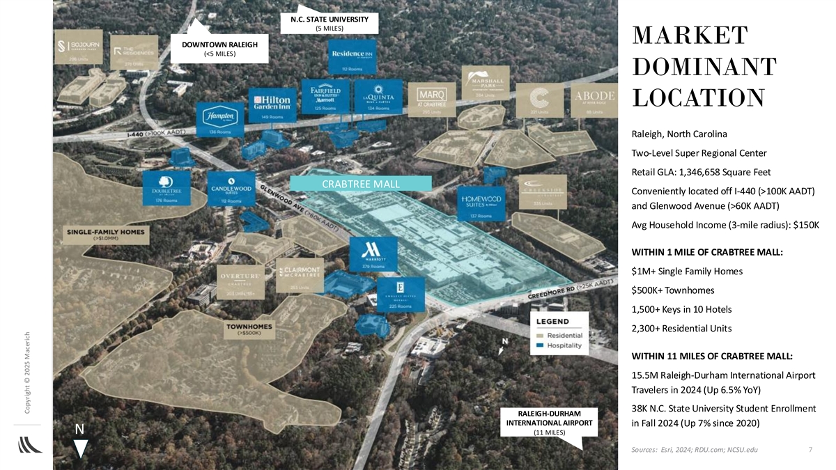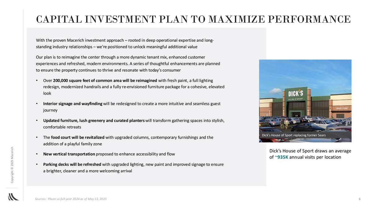 STRONG TENANT MIX DRIVING PERFORMANCE Only location First-to-Market Expanding within 15 miles Coming Soon 200+ CURRENT TENANTS Crabtree Mall is a high-performing asset we believe is primed for accelerated growth, with strong foot traffic and sales and clear market dominance in a high-growth region. Existing retailers and anchors – Macy’s, a new Dick’s House of Sport and Belk – lay a solid foundation Now, by using established leasing relationships and a targeted approach, we believe Macerich can introduce other high-performing brands that attract new shoppers, boost foot traffic and build long-term loyalty Our goal is to drive the current share of permanent to temporary occupancy (78% permanent as of March 31, 2025 to approximately 90% permanent by 2028) (1) $429M Annual Sales (2) $951 Sales Per Square Foot (3) 94% Occupancy 8.7M Total Annual Visits 3.4x Visit Frequency Sources: Placer.ai full-year 2024 as of February 21, 2025 (1) Trailing 12-month gross sales as of March 31, 2025, for all reporting tenants (2) Trailing 12-month sales as of March 31, 2025 for all permanent, reporting tenants under 10,000 SF with at least 12 5 months of reported sales (3) As of March 31, 2025; comprised of 78% permanent occupancy and 16% temporary occupancy Copyright © 2025 Macerich