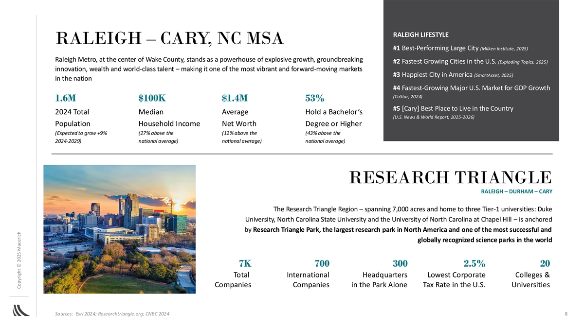 RALEIGH LIFESTYLE RALEIGH – CARY, NC MSA #1 Best-Performing Large City (Milken Institute, 2025) Raleigh Metro, at the center of Wake County, stands as a powerhouse of explosive growth, groundbreaking #2 Fastest Growing Cities in the U.S. (Exploding Topics, 2025) innovation, wealth and world-class talent – making it one of the most vibrant and forward-moving markets #3 Happiest City in America (SmartAsset, 2025) in the nation #4 Fastest-Growing Major U.S. Market for GDP Growth (CoStar, 2024) 1.6M $100K $1.4M 53% #5 [Cary] Best Place to Live in the Country 2024 Total Median Average Hold a Bachelor’s (U.S. News & World Report, 2025-2026) Population Household Income Net Worth Degree or Higher (Expected to grow +9% (27% above the (12% above the (43% above the 2024-2029) national average) national average) national average) RESEARCH TRIANGLE RALEIGH – DURHAM – CARY The Research Triangle Region – spanning 7,000 acres and home to three Tier-1 universities: Duke University, North Carolina State University and the University of North Carolina at Chapel Hill – is anchored by Research Triangle Park, the largest research park in North America and one of the most successful and globally recognized science parks in the world 7K 700 300 2.5% 20 Total International Headquarters Lowest Corporate Colleges & Companies Companies in the Park Alone Tax Rate in the U.S. Universities Sources: Esri 2024; Researchtriangle.org; CNBC 2024 8 Copyright © 2025 Macerich