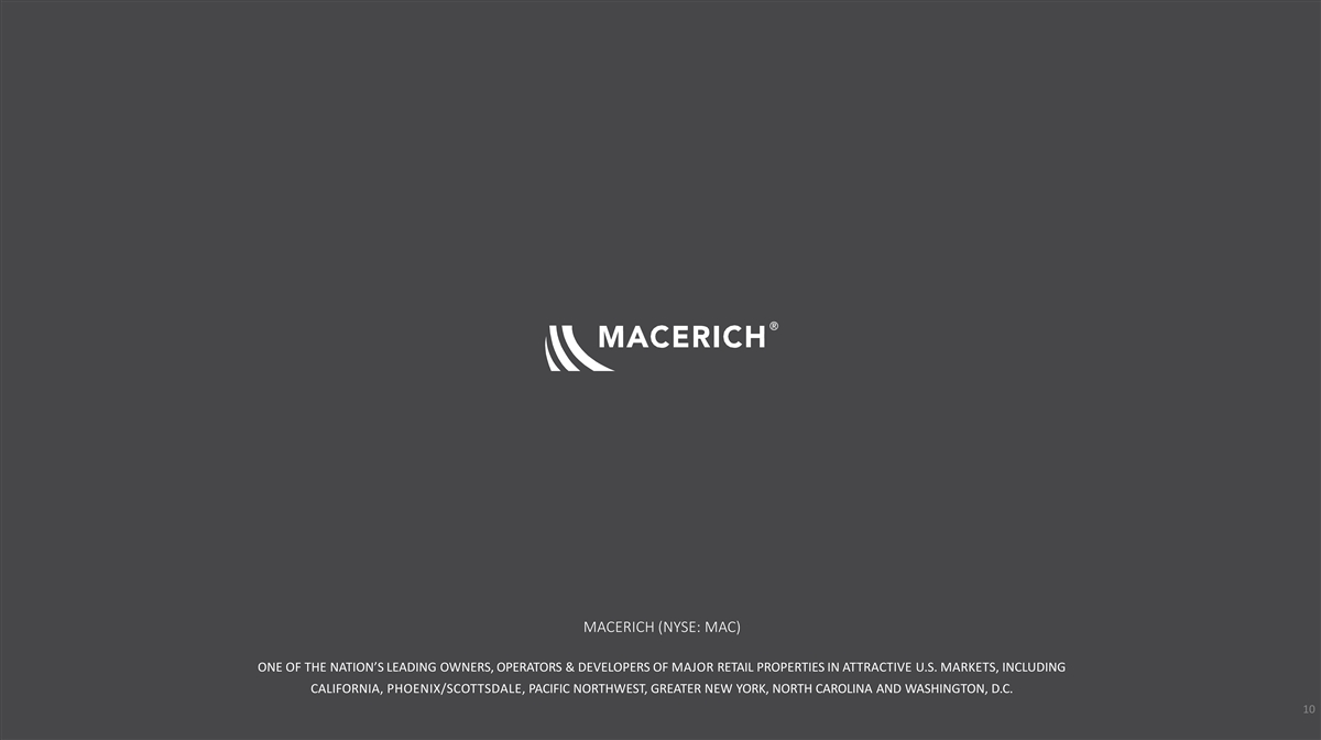 MACERICH (NYSE: MAC) ONE OF THE NATION’S LEADING OWNERS, OPERATORS & DEVELOPERS OF MAJOR RETAIL PROPERTIES IN ATTRACTIVE U.S. MARKETS, INCLUDING CALIFORNIA, PHOENIX/SCOTTSDALE, PACIFIC NORTHWEST, GREATER NEW YORK, NORTH CAROLINA AND WASHINGTON, D.C. 10