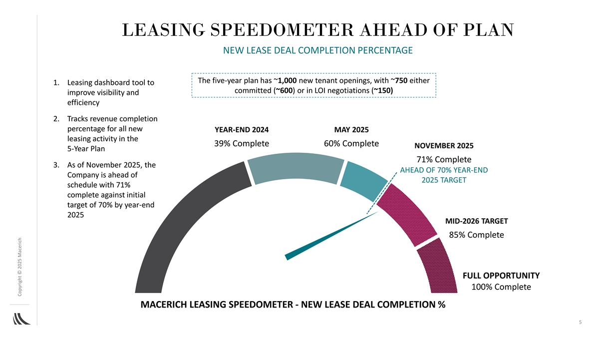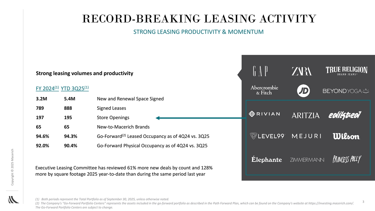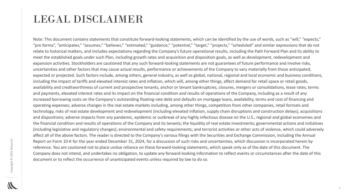 LEGAL DISCLAIMER Note: This document contains statements that constitute forward-looking statements, which can be identified by the use of words, such as “will,” “expects,” “pro forma”, “anticipates,” “assumes,” “believes,” “estimated,” “guidance,” “potential,” “target,” “projects,” “scheduled” and similar expressions that do not relate to historical matters, and includes expectations regarding the Company’s future operational results, including the Path Forward Plan and its ability to meet the established goals under such Plan, including growth rates and acquisition and disposition goals, as well as development, redevelopment and expansion activities. Stockholders are cautioned that any such forward-looking statements are not guarantees of future performance and involve risks, uncertainties and other factors that may cause actual results, performance or achievements of the Company to vary materially from those anticipated, expected or projected. Such factors include, among others, general industry, as well as global, national, regional and local economic and business conditions, including the impact of tariffs and elevated interest rates and inflation, which will, among other things, affect demand for retail space or retail goods, availability and creditworthiness of current and prospective tenants, anchor or tenant bankruptcies, closures, mergers or consolidations, lease rates, terms and payments, elevated interest rates and its impact on the financial condition and results of operations of the Company, including as a result of any increased borrowing costs on the Company's outstanding floating-rate debt and defaults on mortgage loans, availability, terms and cost of financing and operating expenses; adverse changes in the real estate markets including, among other things, competition from other companies, retail formats and technology, risks of real estate development and redevelopment (including elevated inflation, supply chain disruptions and construction delays), acquisitions and dispositions; adverse impacts from any pandemic, epidemic or outbreak of any highly infectious disease on the U.S., regional and global economies and the financial condition and results of operations of the Company and its tenants; the liquidity of real estate investments; governmental actions and initiatives (including legislative and regulatory changes); environmental and safety requirements; and terrorist activities or other acts of violence, which could adversely affect all of the above factors. The reader is directed to the Company’s various filings with the Securities and Exchange Commission, including the Annual Report on Form 10-K for the year ended December 31, 2024, for a discussion of such risks and uncertainties, which discussion is incorporated herein by reference. You are cautioned not to place undue reliance on these forward-looking statements, which speak only as of the date of this document. The Company does not intend, and undertakes no obligation, to update any forward-looking information to reflect events or circumstances after the date of this document or to reflect the occurrence of unanticipated events unless required by law to do so. 2 Copyright © 2025 Macerich