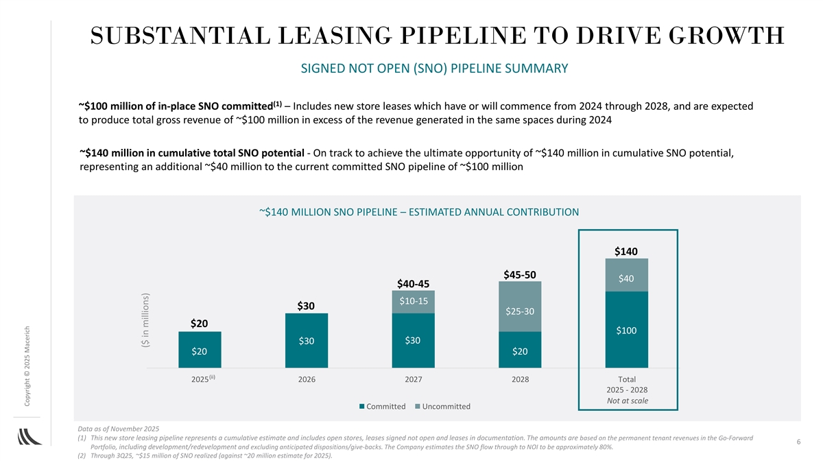 SUBSTANTIAL LEASING PIPELINE TO DRIVE GROWTH SIGNED NOT OPEN (SNO) PIPELINE SUMMARY (1) ~$100 million of in-place SNO committed – Includes new store leases which have or will commence from 2024 through 2028, and are expected to produce total gross revenue of ~$100 million in excess of the revenue generated in the same spaces during 2024 ~$140 million in cumulative total SNO potential - On track to achieve the ultimate opportunity of ~$140 million in cumulative SNO potential, representing an additional ~$40 million to the current committed SNO pipeline of ~$100 million ~$140 MILLION SNO PIPELINE – ESTIMATED ANNUAL CONTRIBUTION $140 $45-50 $40 $40-45 $10-15 $30 $25-30 $20 $100 $30 $30 $20 $20 (ii) 2025 2026 2027 2028 Total 2025 - 2028 Not at scale Committed Uncommitted Data as of November 2025 (1) This new store leasing pipeline represents a cumulative estimate and includes open stores, leases signed not open and leases in documentation. The amounts are based on the permanent tenant revenues in the Go-Forward 6 Portfolio, including development/redevelopment and excluding anticipated dispositions/give-backs. The Company estimates the SNO flow through to NOI to be approximately 80%. (2) Through 3Q25, ~$15 million of SNO realized (against ~20 million estimate for 2025). Copyright © 2025 Macerich ($ in millions)
