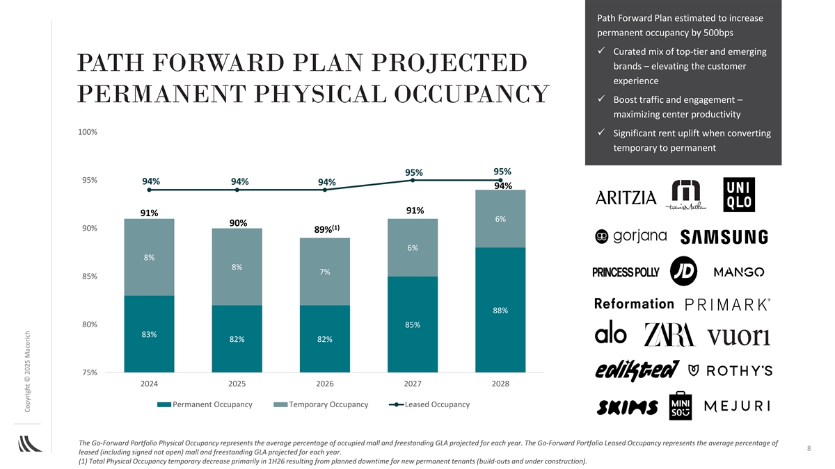 NEW ANCHORS EXPECTED TO DRIVE TRAFFIC, SALES & INLINE LEASING ANCHORS OPENING BY YEAR 12 Committed or in LOI negotiations for 30 out of 30 anchor and big box replacements ~1.3M SF (1) • 30 anchors totaling 2.9 million square feet to replace outdated or vacant retail 7 7 • Estimated $750 million in annual sales ~700K SF ~600K SF 4 ~300K SF 2025 2026 2027 2028 Dick’s House of Sport at Freehold replacing Level99 at Tysons replacing Barnes & Noble Lord & Taylor and Old Navy Opened September 2025 Opened October 2025 Most successful opening among all Level99 Strongest opening out of 34 Dick’s House of locations Sport locations 7 (1) Tenants > 40K Square Feet; 30 anchors projected to open in Path Forward Plan between 2025 to 2028 Copyright © 2025 Macerich