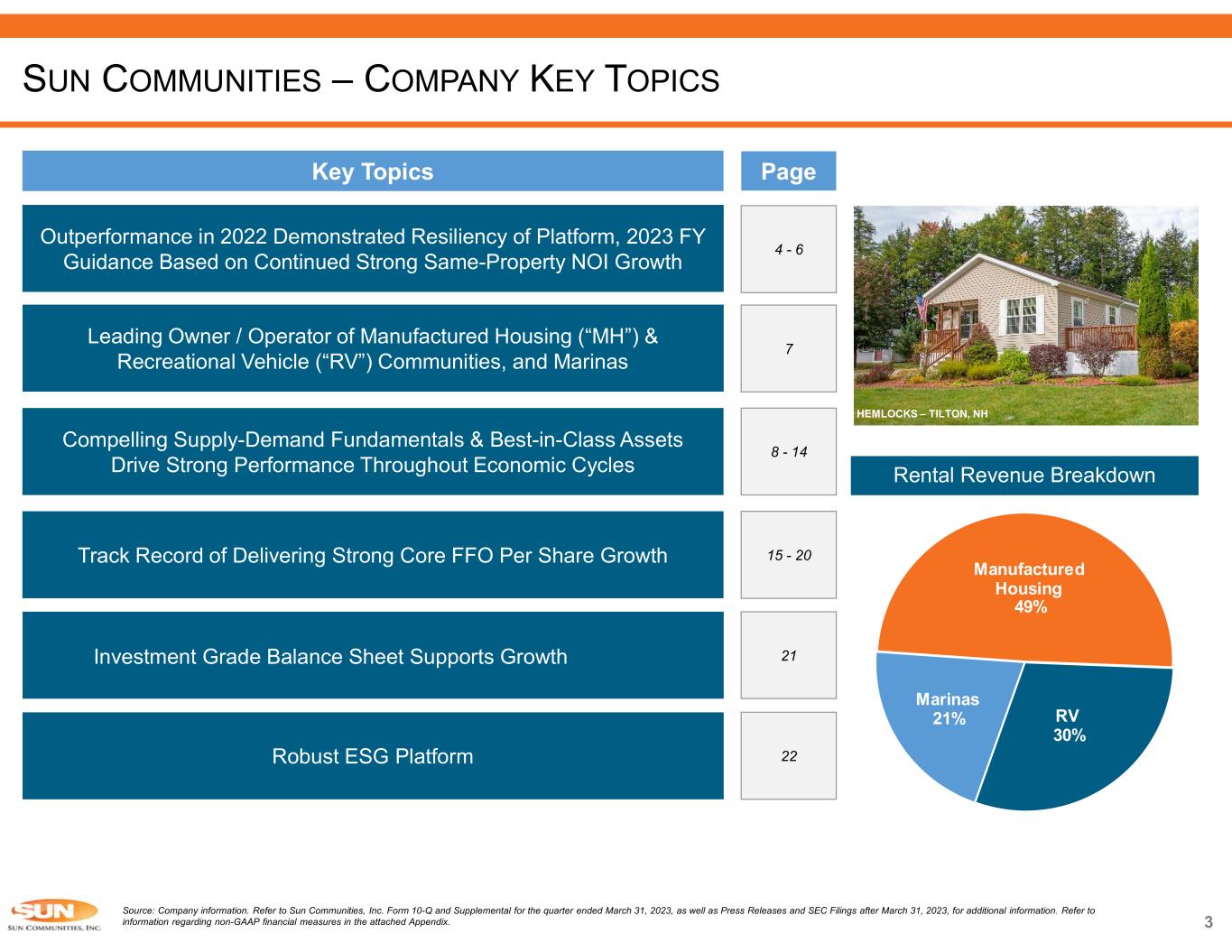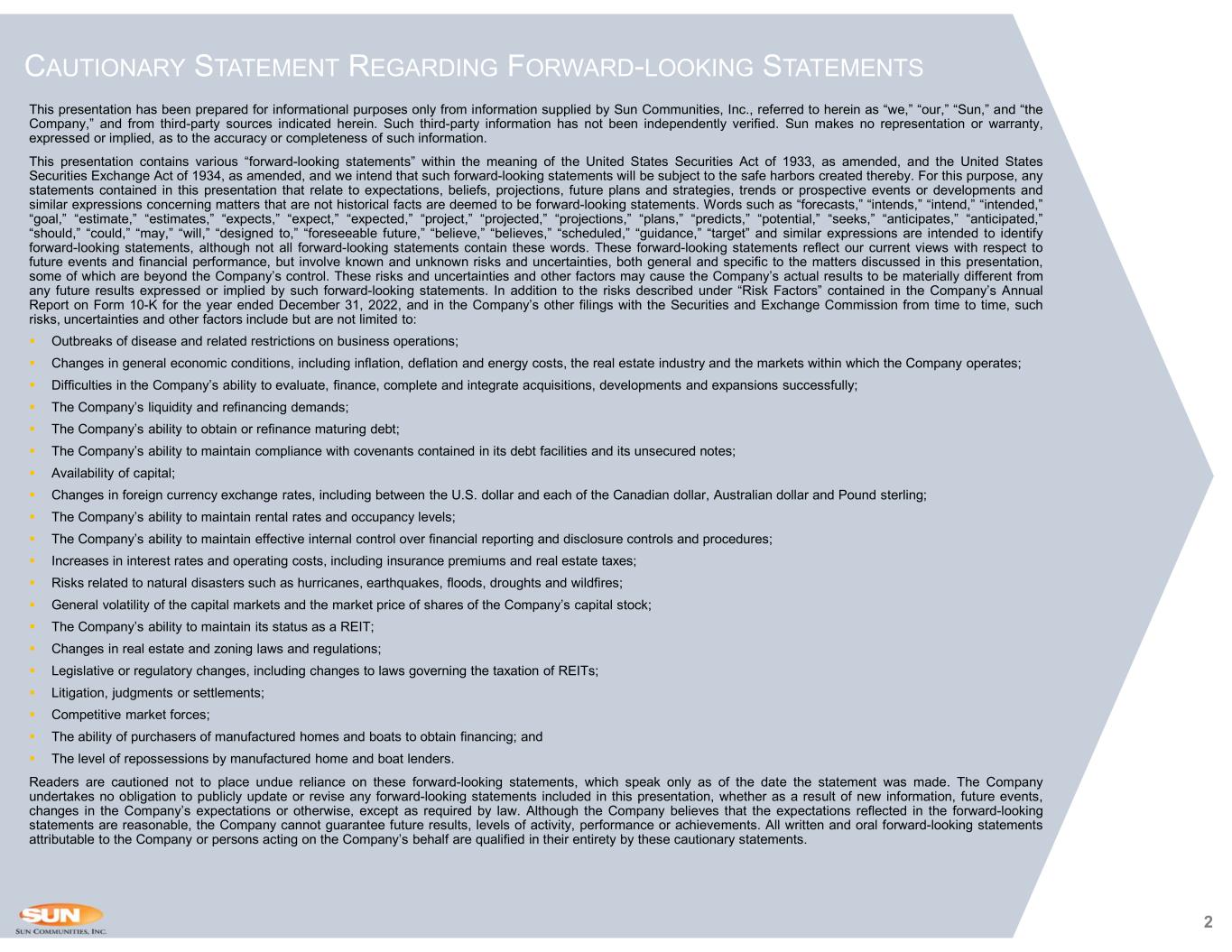 2 This presentation has been prepared for informational purposes only from information supplied by Sun Communities, Inc., referred to herein as “we,” “our,” “Sun,” and “the Company,” and from third-party sources indicated herein. Such third-party information has not been independently verified. Sun makes no representation or warranty, expressed or implied, as to the accuracy or completeness of such information. This presentation contains various “forward-looking statements” within the meaning of the United States Securities Act of 1933, as amended, and the United States Securities Exchange Act of 1934, as amended, and we intend that such forward-looking statements will be subject to the safe harbors created thereby. For this purpose, any statements contained in this presentation that relate to expectations, beliefs, projections, future plans and strategies, trends or prospective events or developments and similar expressions concerning matters that are not historical facts are deemed to be forward-looking statements. Words such as “forecasts,” “intends,” “intend,” “intended,” “goal,” “estimate,” “estimates,” “expects,” “expect,” “expected,” “project,” “projected,” “projections,” “plans,” “predicts,” “potential,” “seeks,” “anticipates,” “anticipated,” “should,” “could,” “may,” “will,” “designed to,” “foreseeable future,” “believe,” “believes,” “scheduled,” “guidance,” “target” and similar expressions are intended to identify forward-looking statements, although not all forward-looking statements contain these words. These forward-looking statements reflect our current views with respect to future events and financial performance, but involve known and unknown risks and uncertainties, both general and specific to the matters discussed in this presentation, some of which are beyond the Company’s control. These risks and uncertainties and other factors may cause the Company’s actual results to be materially different from any future results expressed or implied by such forward-looking statements. In addition to the risks described under “Risk Factors” contained in the Company’s Annual Report on Form 10-K for the year ended December 31, 2022, and in the Company’s other filings with the Securities and Exchange Commission from time to time, such risks, uncertainties and other factors include but are not limited to:  Outbreaks of disease and related restrictions on business operations;  Changes in general economic conditions, including inflation, deflation and energy costs, the real estate industry and the markets within which the Company operates;  Difficulties in the Company’s ability to evaluate, finance, complete and integrate acquisitions, developments and expansions successfully;  The Company’s liquidity and refinancing demands;  The Company’s ability to obtain or refinance maturing debt;  The Company’s ability to maintain compliance with covenants contained in its debt facilities and its unsecured notes;  Availability of capital;  Changes in foreign currency exchange rates, including between the U.S. dollar and each of the Canadian dollar, Australian dollar and Pound sterling;  The Company’s ability to maintain rental rates and occupancy levels;  The Company’s ability to maintain effective internal control over financial reporting and disclosure controls and procedures;  Increases in interest rates and operating costs, including insurance premiums and real estate taxes;  Risks related to natural disasters such as hurricanes, earthquakes, floods, droughts and wildfires;  General volatility of the capital markets and the market price of shares of the Company’s capital stock;  The Company’s ability to maintain its status as a REIT;  Changes in real estate and zoning laws and regulations;  Legislative or regulatory changes, including changes to laws governing the taxation of REITs;  Litigation, judgments or settlements;  Competitive market forces;  The ability of purchasers of manufactured homes and boats to obtain financing; and  The level of repossessions by manufactured home and boat lenders. Readers are cautioned not to place undue reliance on these forward-looking statements, which speak only as of the date the statement was made. The Company undertakes no obligation to publicly update or revise any forward-looking statements included in this presentation, whether as a result of new information, future events, changes in the Company’s expectations or otherwise, except as required by law. Although the Company believes that the expectations reflected in the forward-looking statements are reasonable, the Company cannot guarantee future results, levels of activity, performance or achievements. All written and oral forward-looking statements attributable to the Company or persons acting on the Company’s behalf are qualified in their entirety by these cautionary statements. CAUTIONARY STATEMENT REGARDING FORWARD-LOOKING STATEMENTS
