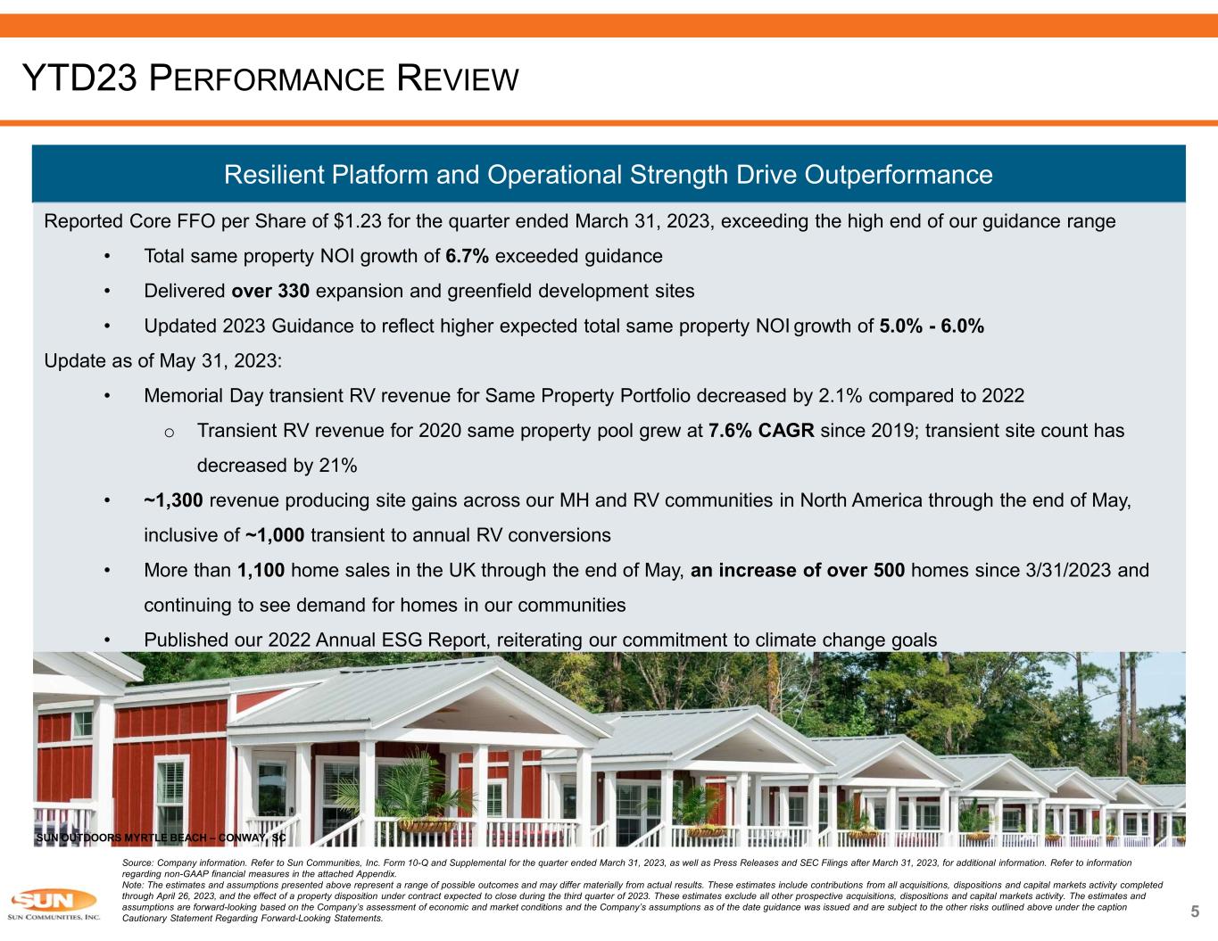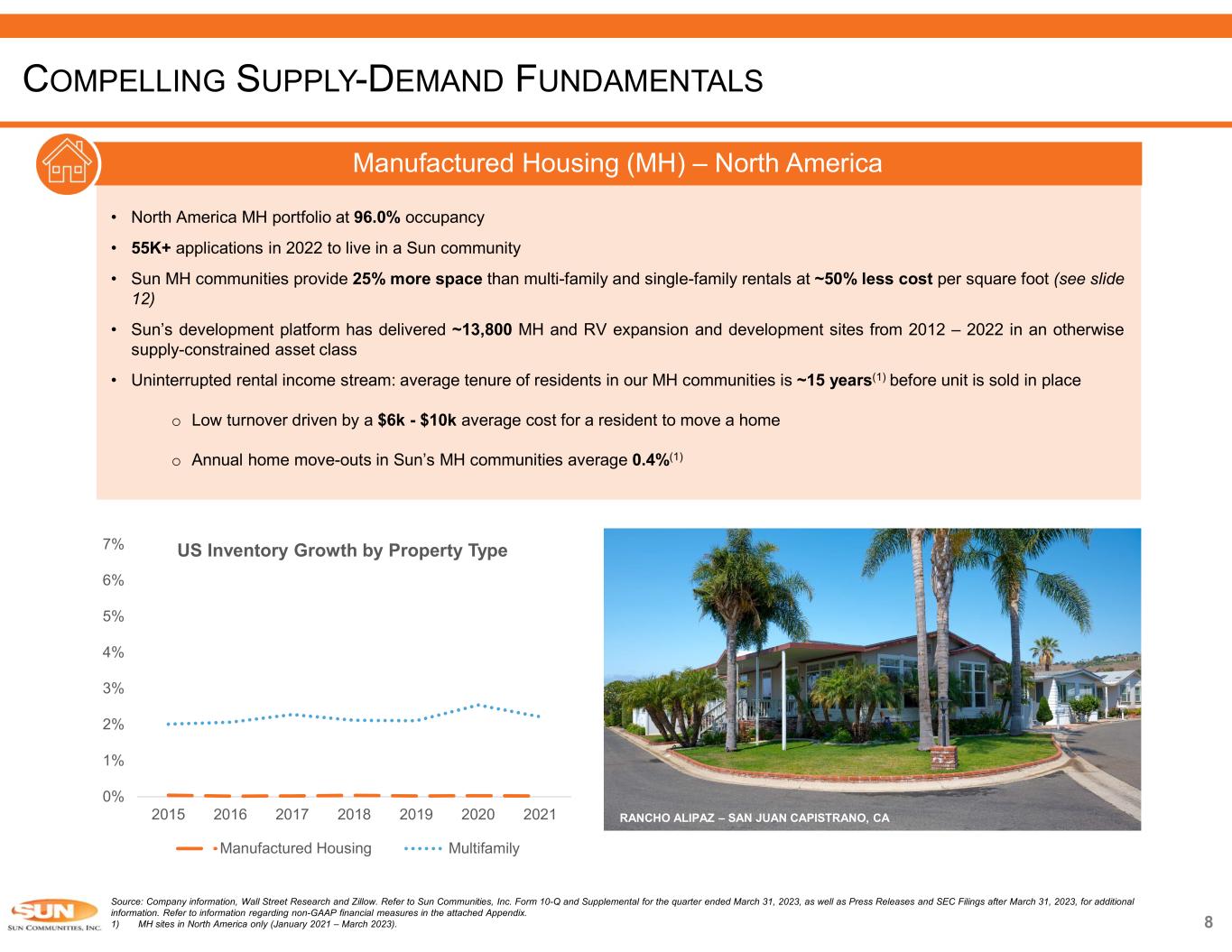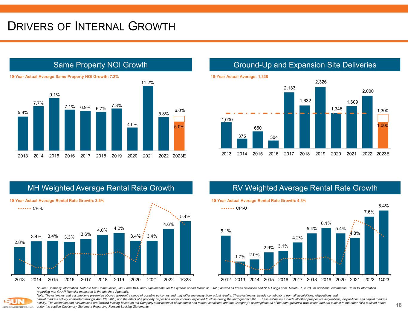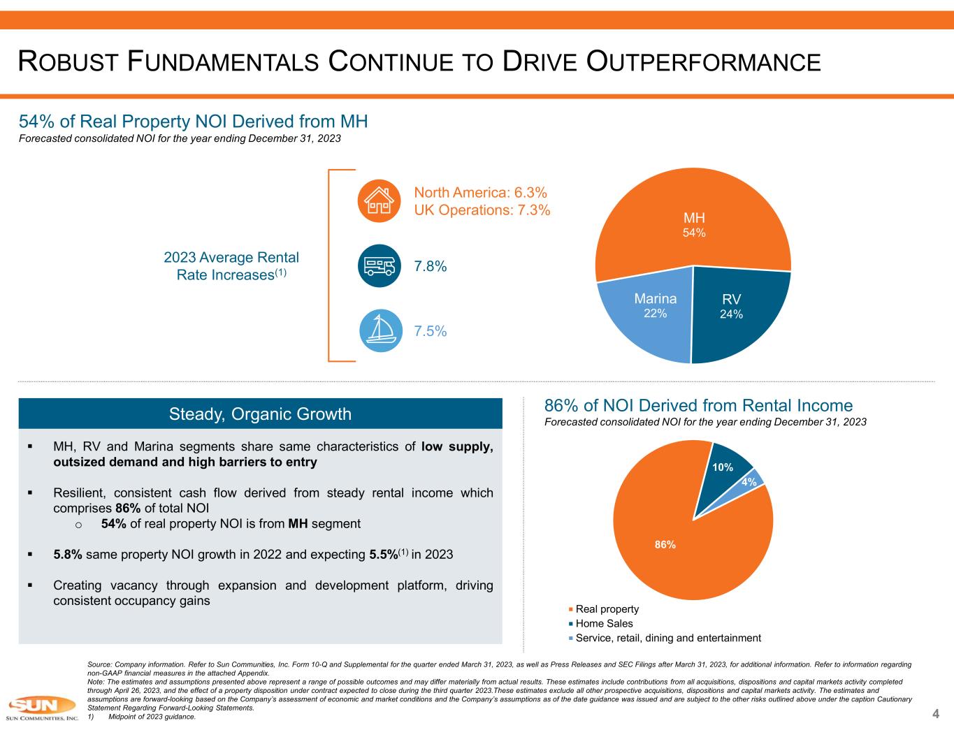 Source: Company information. Refer to Sun Communities, Inc. Form 10-Q and Supplemental for the quarter ended March 31, 2023, as well as Press Releases and SEC Filings after March 31, 2023, for additional information. Refer to information regarding non-GAAP financial measures in the attached Appendix. Note: The estimates and assumptions presented above represent a range of possible outcomes and may differ materially from actual results. These estimates include contributions from all acquisitions, dispositions and capital markets activity completed through April 26, 2023, and the effect of a property disposition under contract expected to close during the third quarter 2023.These estimates exclude all other prospective acquisitions, dispositions and capital markets activity. The estimates and assumptions are forward-looking based on the Company’s assessment of economic and market conditions and the Company’s assumptions as of the date guidance was issued and are subject to the other risks outlined above under the caption Cautionary Statement Regarding Forward-Looking Statements. 1) Midpoint of 2023 guidance. ROBUST FUNDAMENTALS CONTINUE TO DRIVE OUTPERFORMANCE 86% 10% 4% Real property Home Sales Service, retail, dining and entertainment 54% of Real Property NOI Derived from MH Forecasted consolidated NOI for the year ending December 31, 2023 86% of NOI Derived from Rental Income Forecasted consolidated NOI for the year ending December 31, 2023Steady, Organic Growth  MH, RV and Marina segments share same characteristics of low supply, outsized demand and high barriers to entry  Resilient, consistent cash flow derived from steady rental income which comprises 86% of total NOI o 54% of real property NOI is from MH segment  5.8% same property NOI growth in 2022 and expecting 5.5%(1) in 2023  Creating vacancy through expansion and development platform, driving consistent occupancy gains MH 54% RV 24% Marina 22% 2023 Average Rental Rate Increases(1) North America: 6.3% UK Operations: 7.3% 7.8% 7.5% 4