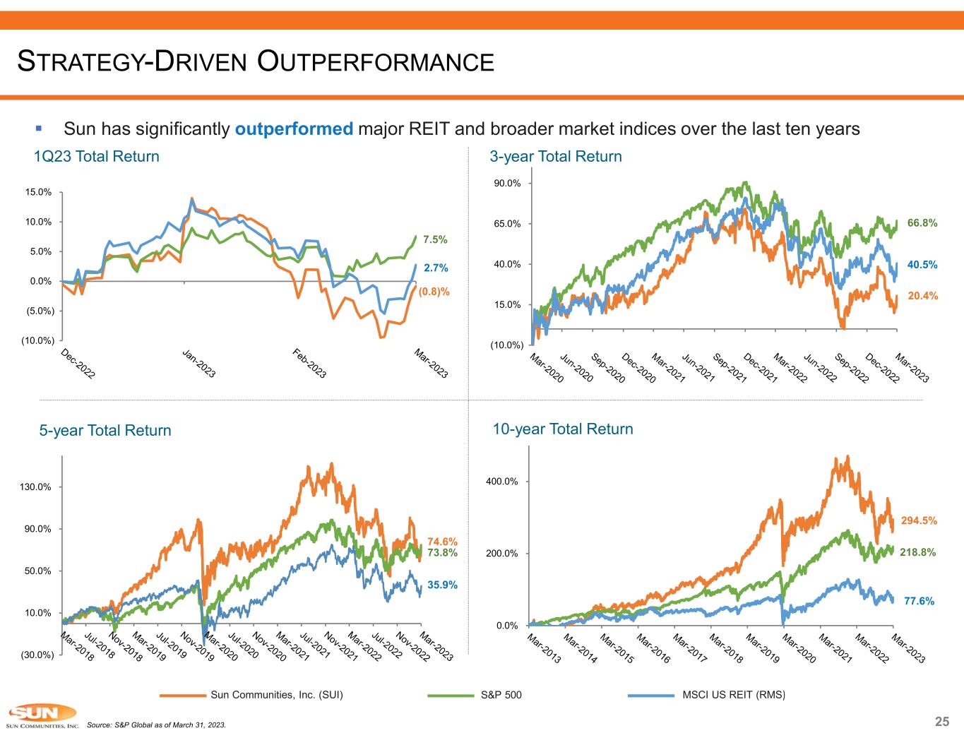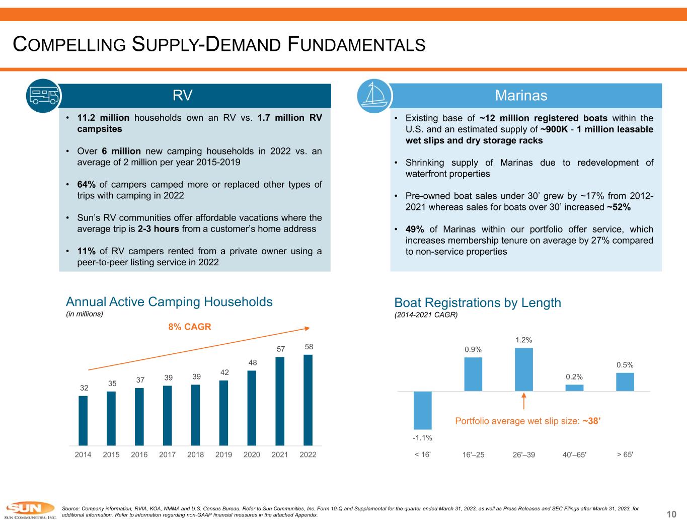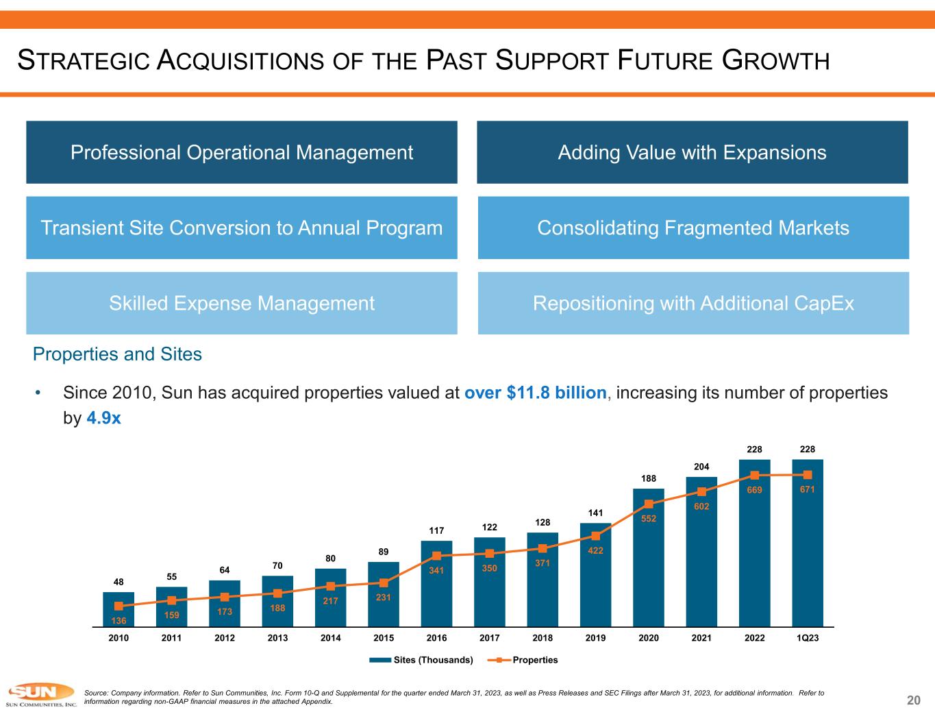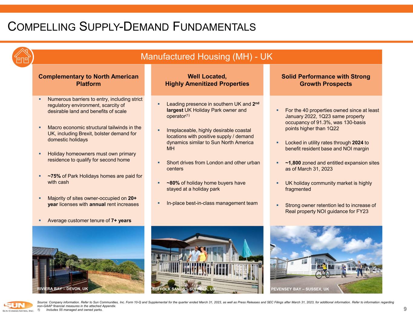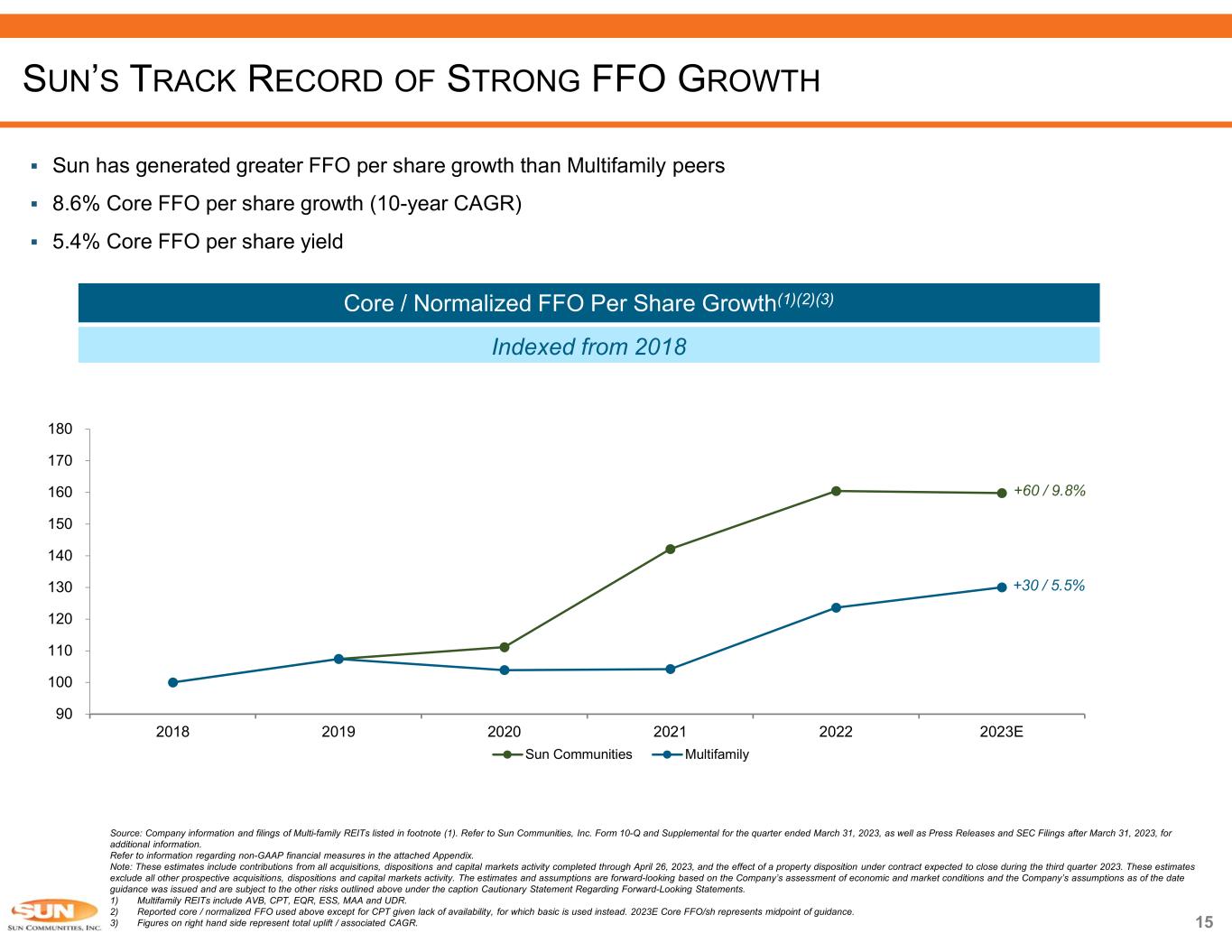 Source: Company information. Refer to Sun Communities, Inc. Form 10-Q and Supplemental for the quarter ended March 31, 2023, as well as Press Releases and SEC Filings after March 31, 2023, for additional information. Refer to information regarding non-GAAP financial measures in the attached Appendix. Note: The estimates and assumptions presented above represent a range of possible outcomes and may differ materially from actual results. These estimates include contributions from all acquisitions, dispositions and capital markets activity completed through April 26, 2023, and the effect of a property disposition under contract expected to close during the third quarter 2023.These estimates exclude all other prospective acquisitions, dispositions and capital markets activity. The estimates and assumptions are forward-looking based on the Company’s assessment of economic and market conditions and the Company’s assumptions as of the date guidance was issued and are subject to the other risks outlined above under the caption Cautionary Statement Regarding Forward-Looking Statements. 1) Midpoint of 2023 guidance. ROBUST FUNDAMENTALS CONTINUE TO DRIVE OUTPERFORMANCE 86% 10% 4% Real property Home Sales Service, retail, dining and entertainment 54% of Real Property NOI Derived from MH Forecasted consolidated NOI for the year ending December 31, 2023 86% of NOI Derived from Rental Income Forecasted consolidated NOI for the year ending December 31, 2023Steady, Organic Growth  MH, RV and Marina segments share same characteristics of low supply, outsized demand and high barriers to entry  Resilient, consistent cash flow derived from steady rental income which comprises 86% of total NOI o 54% of real property NOI is from MH segment  5.8% same property NOI growth in 2022 and expecting 5.5%(1) in 2023  Creating vacancy through expansion and development platform, driving consistent occupancy gains MH 54% RV 24% Marina 22% 2023 Average Rental Rate Increases(1) North America: 6.3% UK Operations: 7.3% 7.8% 7.5% 4