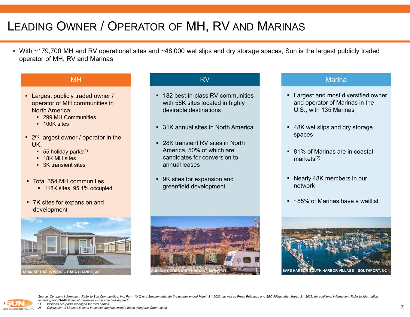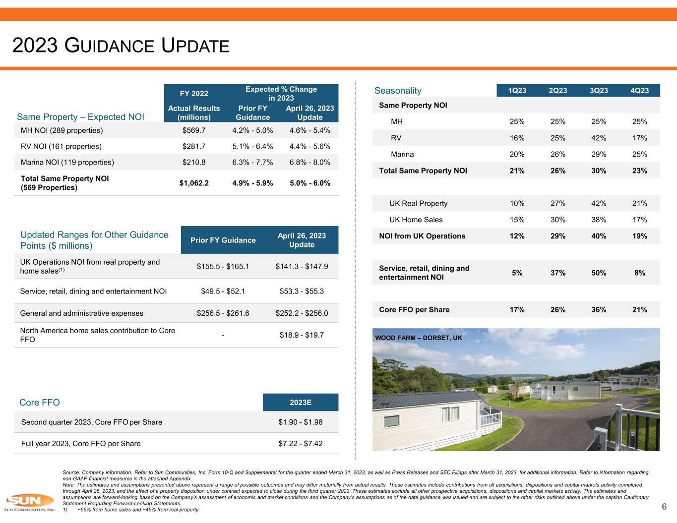Source: Company information. Refer to Sun Communities, Inc. Form 10-Q and Supplemental for the quarter ended March 31, 2023, as well as Press Releases and SEC Filings after March 31, 2023, for additional information. Refer to information regarding non-GAAP financial measures in the attached Appendix. Note: The estimates and assumptions presented above represent a range of possible outcomes and may differ materially from actual results. These estimates include contributions from all acquisitions, dispositions and capital markets activity completed through April 26, 2023, and the effect of a property disposition under contract expected to close during the third quarter 2023. These estimates exclude all other prospective acquisitions, dispositions and capital markets activity. The estimates and assumptions are forward-looking based on the Company’s assessment of economic and market conditions and the Company’s assumptions as of the date guidance was issued and are subject to the other risks outlined above under the caption Cautionary Statement Regarding Forward-Looking Statements. 1) ~55% from home sales and ~45% from real property. 4Q233Q232Q231Q23Seasonality Same Property NOI 25%25%25%25%MH 17%42%25%16%RV 25%29%26%20%Marina 23%30%26%21%Total Same Property NOI 21%42%27%10%UK Real Property 17%38%30%15%UK Home Sales 19%40%29%12%NOI from UK Operations 8%50%37%5% Service, retail, dining and entertainment NOI 21%36%26%17%Core FFO per Share 2023ECore FFO $1.90 - $1.98Second quarter 2023, Core FFO per Share $7.22 - $7.42Full year 2023, Core FFO per Share Expected % Change in 2023 FY 2022 Same Property – Expected NOI April 26, 2023 Update Prior FY Guidance Actual Results (millions) 4.6% - 5.4%4.2% - 5.0%$569.7MH NOI (289 properties) 4.4% - 5.6%5.1% - 6.4%$281.7RV NOI (161 properties) 6.8% - 8.0%6.3% - 7.7%$210.8Marina NOI (119 properties) 5.0% - 6.0%4.9% - 5.9%$1,062.2 Total Same Property NOI (569 Properties) 2023 GUIDANCE UPDATE April 26, 2023 Update Prior FY Guidance Updated Ranges for Other Guidance Points ($ millions)ted $141.3 - $147.9$155.5 - $165.1 UK Operations NOI from real property and home sales(1) $53.3 - $55.3$49.5 - $52.1Service, retail, dining and entertainment NOI $252.2 - $256.0$256.5 - $261.6General and administrative expenses $18.9 - $19.7- North America home sales contribution to Core FFO WOOD FARM – DORSET, UK 6
