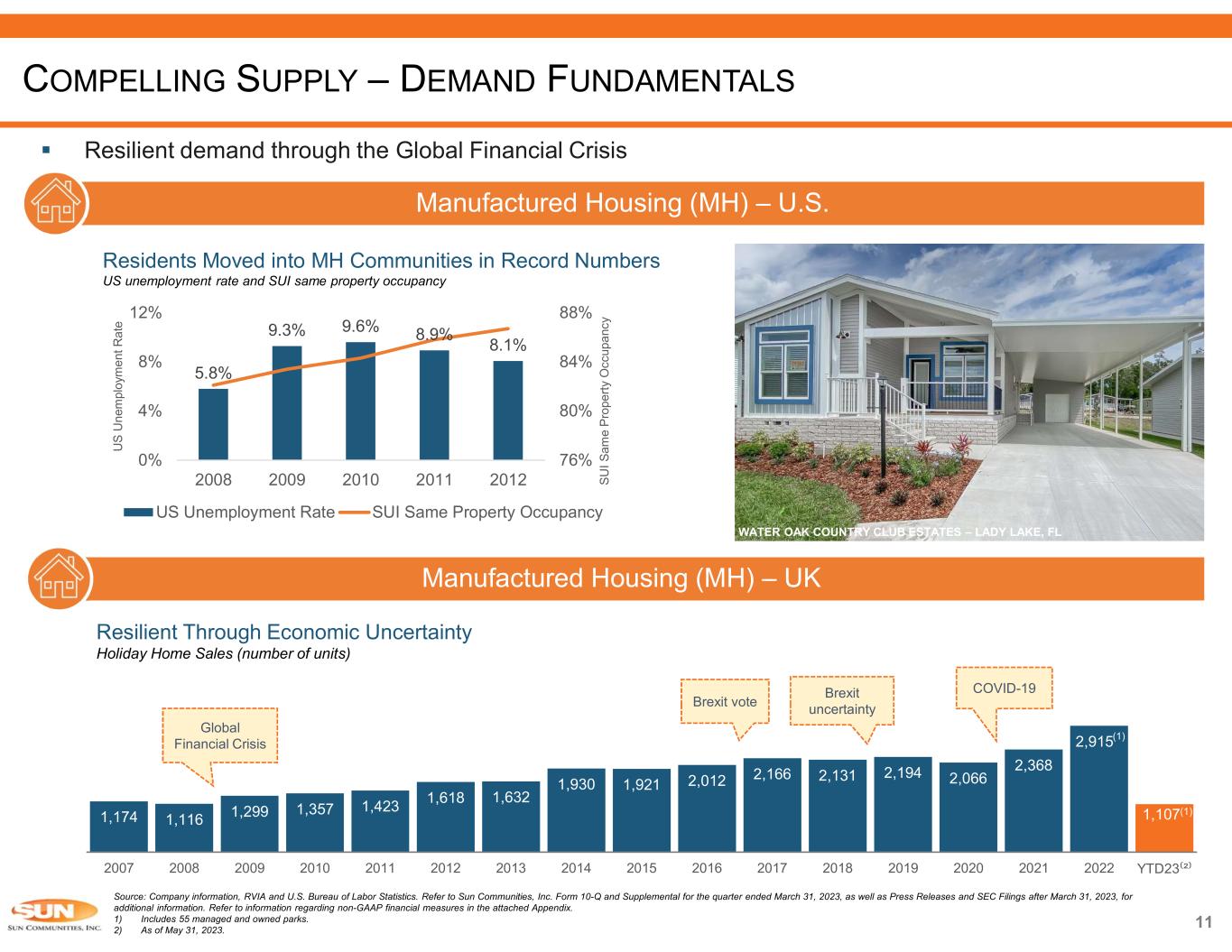 10 Source: Company information, RVIA, KOA, NMMA and U.S. Census Bureau. Refer to Sun Communities, Inc. Form 10-Q and Supplemental for the quarter ended March 31, 2023, as well as Press Releases and SEC Filings after March 31, 2023, for additional information. Refer to information regarding non-GAAP financial measures in the attached Appendix. RV • 11.2 million households own an RV vs. 1.7 million RV campsites • Over 6 million new camping households in 2022 vs. an average of 2 million per year 2015-2019 • 64% of campers camped more or replaced other types of trips with camping in 2022 • Sun’s RV communities offer affordable vacations where the average trip is 2-3 hours from a customer’s home address • 11% of RV campers rented from a private owner using a peer-to-peer listing service in 2022 Marinas • Existing base of ~12 million registered boats within the U.S. and an estimated supply of ~900K - 1 million leasable wet slips and dry storage racks • Shrinking supply of Marinas due to redevelopment of waterfront properties • Pre-owned boat sales under 30’ grew by ~17% from 2012- 2021 whereas sales for boats over 30’ increased ~52% • 49% of Marinas within our portfolio offer service, which increases membership tenure on average by 27% compared to non-service properties COMPELLING SUPPLY-DEMAND FUNDAMENTALS 32 35 37 39 39 42 48 57 58 2014 2015 2016 2017 2018 2019 2020 2021 2022 Annual Active Camping Households (in millions) 8% CAGR Boat Registrations by Length (2014-2021 CAGR) -1.1% 0.9% 1.2% 0.2% 0.5% < 16' 16'–25 26'–39 40'–65' > 65' Portfolio average wet slip size: ~38’