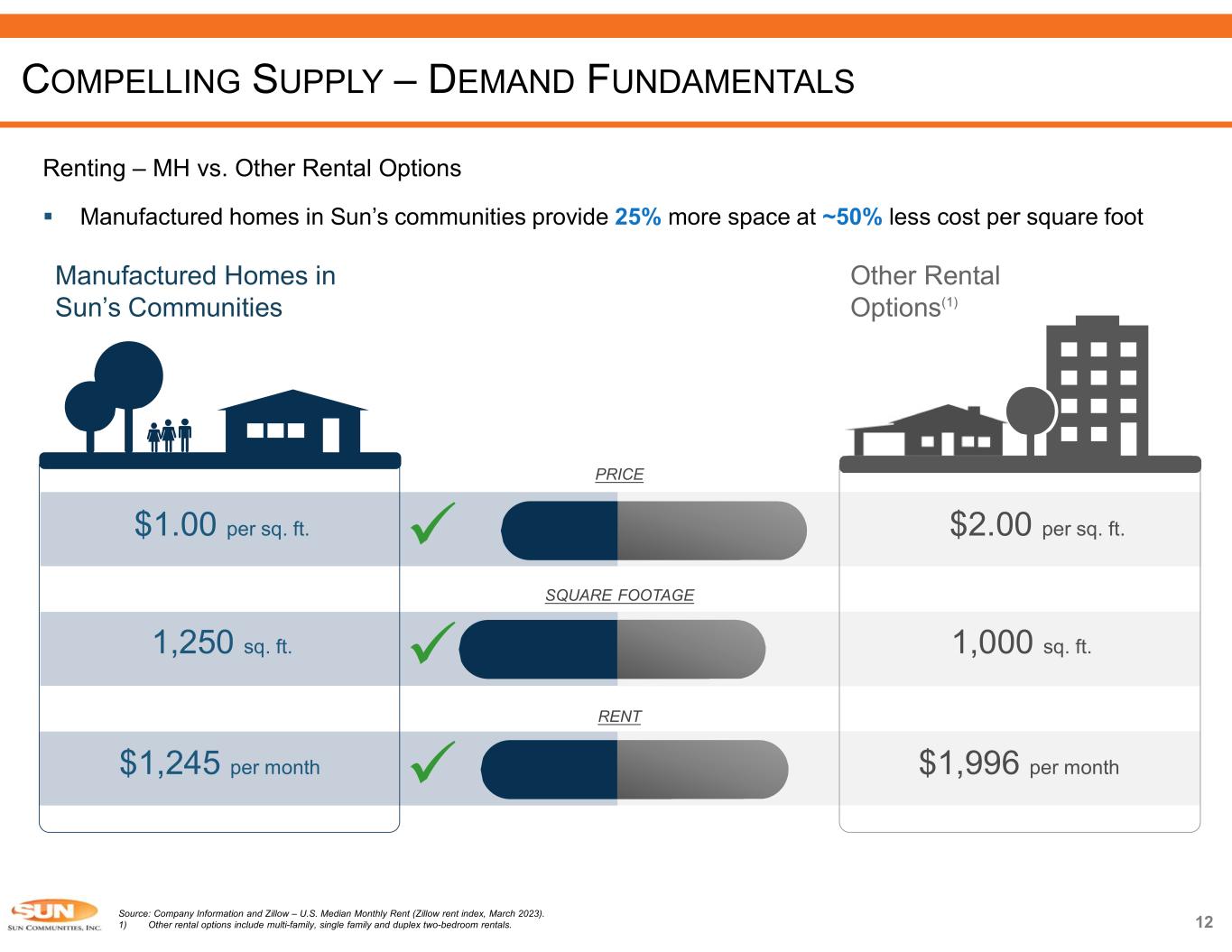 11 Manufactured Housing (MH) – U.S. Residents Moved into MH Communities in Record Numbers US unemployment rate and SUI same property occupancy Source: Company information, RVIA and U.S. Bureau of Labor Statistics. Refer to Sun Communities, Inc. Form 10-Q and Supplemental for the quarter ended March 31, 2023, as well as Press Releases and SEC Filings after March 31, 2023, for additional information. Refer to information regarding non-GAAP financial measures in the attached Appendix. 1) Includes 55 managed and owned parks. 2) As of May 31, 2023. Manufactured Housing (MH) – UK 1,174 1,116 1,299 1,357 1,423 1,618 1,632 1,930 1,921 2,012 2,166 2,131 2,194 2,066 2,368 2,915 1,107 2007 2008 2009 2010 2011 2012 2013 2014 2015 2016 2017 2018 2019 2020 2021 2022 YTD23⁽²⁾ Global Financial Crisis Brexit uncertainty COVID-19 Brexit vote Resilient Through Economic Uncertainty Holiday Home Sales (number of units) WATER OAK COUNTRY CLUB ESTATES – LADY LAKE, FL  Resilient demand through the Global Financial Crisis COMPELLING SUPPLY – DEMAND FUNDAMENTALS 5.8% 9.3% 9.6% 8.9% 8.1% 76% 80% 84% 88% 0% 4% 8% 12% 2008 2009 2010 2011 2012 S U I S am e P ro pe rt y O cc up a nc y U S U n em pl oy m e nt R a te US Unemployment Rate SUI Same Property Occupancy (1) (1)