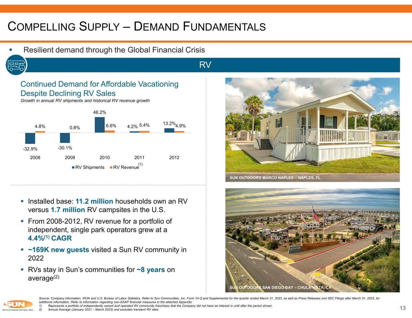 12 Renting – MH vs. Other Rental Options  Manufactured homes in Sun’s communities provide 25% more space at ~50% less cost per square foot Manufactured Homes in Sun’s Communities RENT   $1,245 per month Other Rental Options(1) $1,996 per month SQUARE FOOTAGE PRICE 1,250 sq. ft. 1,000 sq. ft. $1.00 per sq. ft. $2.00 per sq. ft. Source: Company Information and Zillow – U.S. Median Monthly Rent (Zillow rent index, March 2023). 1) Other rental options include multi-family, single family and duplex two-bedroom rentals. COMPELLING SUPPLY – DEMAND FUNDAMENTALS