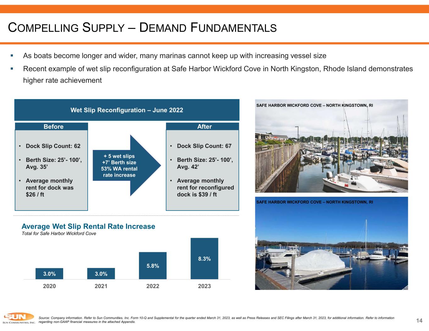 13 RV Continued Demand for Affordable Vacationing Despite Declining RV Sales Growth in annual RV shipments and historical RV revenue growth  Installed base: 11.2 million households own an RV versus 1.7 million RV campsites in the U.S.  From 2008-2012, RV revenue for a portfolio of independent, single park operators grew at a 4.4%(1) CAGR  ~169K new guests visited a Sun RV community in 2022  RVs stay in Sun’s communities for ~8 years on average(2) Source: Company information, RVIA and U.S. Bureau of Labor Statistics. Refer to Sun Communities, Inc. Form 10-Q and Supplemental for the quarter ended March 31, 2023, as well as Press Releases and SEC Filings after March 31, 2023, for additional information. Refer to information regarding non-GAAP financial measures in the attached Appendix. 1) Represents a portfolio of independently owned and operated RV community franchises that the Company did not have an interest in until after the period shown. 2) Annual Average (January 2021 – March 2023) and excludes transient RV sites. SUN OUTDOORS MARCO NAPLES – NAPLES, FL SUN OUTDOORS SAN DIEGO BAY – CHULA VISTA, CA  Resilient demand through the Global Financial Crisis COMPELLING SUPPLY – DEMAND FUNDAMENTALS -32.9% -30.1% 46.2% 4.2% 13.2% 4.8% 0.8% 6.6% 5.4% 4.9% 2008 2009 2010 2011 2012 RV Shipments RV Revenue (1)