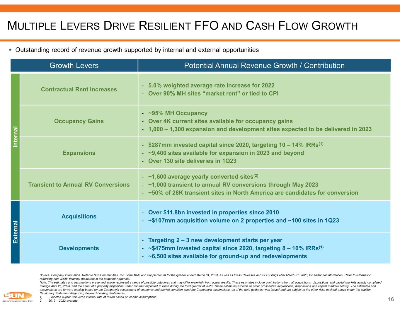 15 Source: Company information and filings of Multi-family REITs listed in footnote (1). Refer to Sun Communities, Inc. Form 10-Q and Supplemental for the quarter ended March 31, 2023, as well as Press Releases and SEC Filings after March 31, 2023, for additional information. Refer to information regarding non-GAAP financial measures in the attached Appendix. Note: These estimates include contributions from all acquisitions, dispositions and capital markets activity completed through April 26, 2023, and the effect of a property disposition under contract expected to close during the third quarter 2023. These estimates exclude all other prospective acquisitions, dispositions and capital markets activity. The estimates and assumptions are forward-looking based on the Company’s assessment of economic and market conditions and the Company’s assumptions as of the date guidance was issued and are subject to the other risks outlined above under the caption Cautionary Statement Regarding Forward-Looking Statements. 1) Multifamily REITs include AVB, CPT, EQR, ESS, MAA and UDR. 2) Reported core / normalized FFO used above except for CPT given lack of availability, for which basic is used instead. 2023E Core FFO/sh represents midpoint of guidance. 3) Figures on right hand side represent total uplift / associated CAGR. Indexed from 2018 90 100 110 120 130 140 150 160 170 180 2018 2019 2020 2021 2022 2023E Sun Communities Multifamily Core / Normalized FFO Per Share Growth(1)(2)(3) +60 / 9.8% +30 / 5.5% SUN’S TRACK RECORD OF STRONG FFO GROWTH  Sun has generated greater FFO per share growth than Multifamily peers  8.6% Core FFO per share growth (10-year CAGR)  5.4% Core FFO per share yield