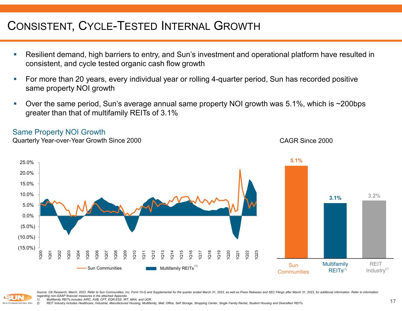 16  Outstanding record of revenue growth supported by internal and external opportunities Growth Levers Potential Annual Revenue Growth / Contribution - 5.0% weighted average rate increase for 2022 - Over 90% MH sites “market rent” or tied to CPI Contractual Rent Increases In te rn a l - ~95% MH Occupancy - Over 4K current sites available for occupancy gains - 1,000 – 1,300 expansion and development sites expected to be delivered in 2023 Occupancy Gains - $287mm invested capital since 2020, targeting 10 – 14% IRRs(1) - ~9,400 sites available for expansion in 2023 and beyond - Over 130 site deliveries in 1Q23 Expansions - ~1,600 average yearly converted sites(2) - ~1,000 transient to annual RV conversions through May 2023 - ~50% of 28K transient sites in North America are candidates for conversion Transient to Annual RV Conversions - Over $11.8bn invested in properties since 2010 - ~$107mm acquisition volume on 2 properties and ~100 sites in 1Q23 Acquisitions E x te rn a l - Targeting 2 – 3 new development starts per year - ~$475mm invested capital since 2020, targeting 8 – 10% IRRs(1) - ~6,500 sites available for ground-up and redevelopments Developments MULTIPLE LEVERS DRIVE RESILIENT FFO AND CASH FLOW GROWTH Source: Company information. Refer to Sun Communities, Inc. Form 10-Q and Supplemental for the quarter ended March 31, 2023, as well as Press Releases and SEC Filings after March 31, 2023, for additional information. Refer to information regarding non-GAAP financial measures in the attached Appendix. Note: The estimates and assumptions presented above represent a range of possible outcomes and may differ materially from actual results. These estimates include contributions from all acquisitions, dispositions and capital markets activity completed through April 26, 2023, and the effect of a property disposition under contract expected to close during the third quarter of 2023. These estimates exclude all other prospective acquisitions, dispositions and capital markets activity. The estimates and assumptions are forward-looking based on the Company’s assessment of economic and market condition sand the Company’s assumptions as of the date guidance was issued and are subject to the other risks outlined above under the caption Cautionary Statement Regarding Forward-Looking Statements. 1) Expected 5-year unlevered internal rate of return based on certain assumptions. 2) 2019 – 2022 average.