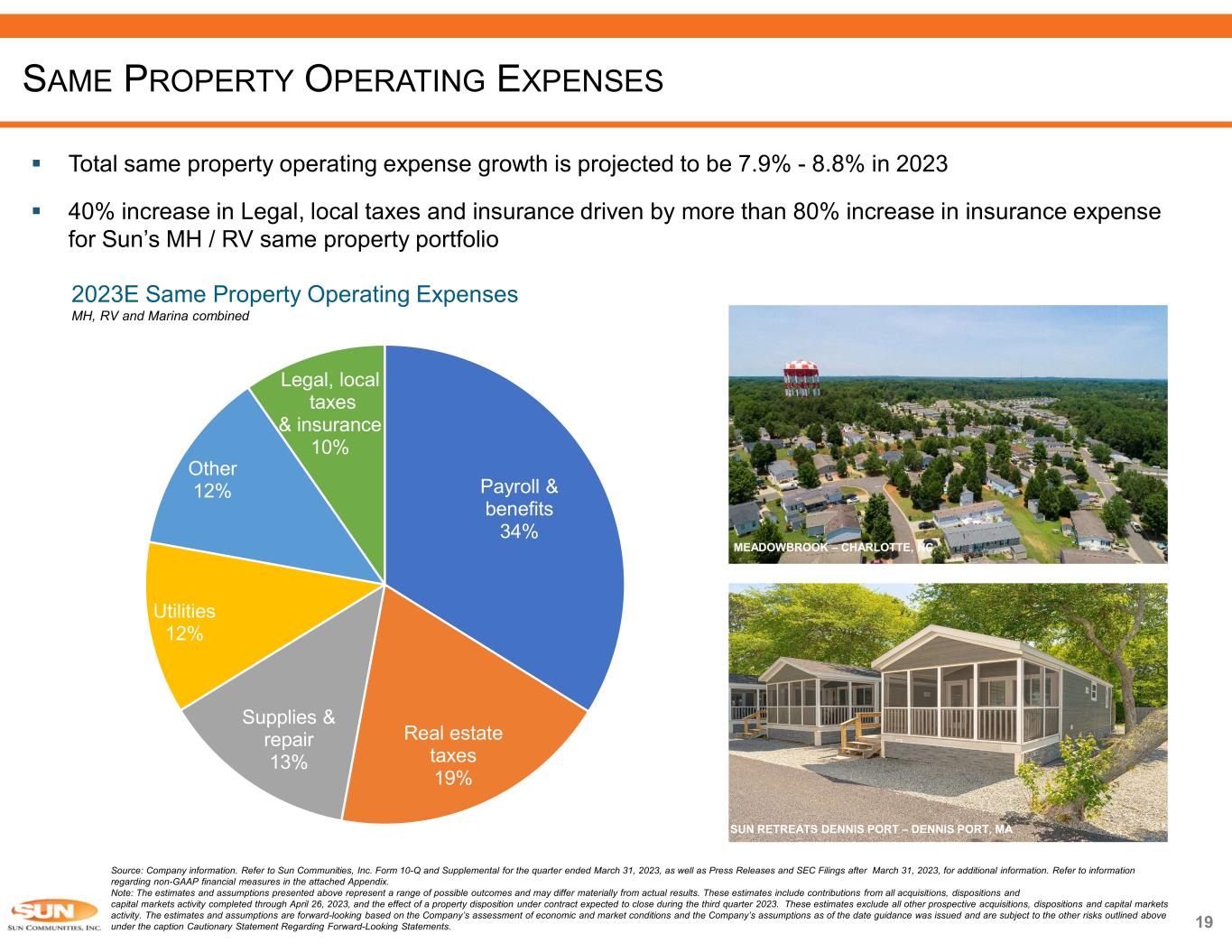 MH Weighted Average Rental Rate Growth 18 RV Weighted Average Rental Rate Growth DRIVERS OF INTERNAL GROWTH Source: Company information. Refer to Sun Communities, Inc. Form 10-Q and Supplemental for the quarter ended March 31, 2023, as well as Press Releases and SEC Filings after March 31, 2023, for additional information. Refer to information regarding non-GAAP financial measures in the attached Appendix. Note: The estimates and assumptions presented above represent a range of possible outcomes and may differ materially from actual results. These estimates include contributions from all acquisitions, dispositions and capital markets activity completed through April 26, 2023, and the effect of a property disposition under contract expected to close during the third quarter 2023. These estimates exclude all other prospective acquisitions, dispositions and capital markets activity. The estimates and assumptions are forward-looking based on the Company’s assessment of economic and market conditions and the Company’s assumptions as of the date guidance was issued and are subject to the other risks outlined above under the caption Cautionary Statement Regarding Forward-Looking Statements. 10-Year Actual Average Rental Rate Growth: 3.6% 10-Year Actual Average Rental Rate Growth: 4.3% Same Property NOI Growth 6.0% 10-Year Actual Average Same Property NOI Growth: 7.2% Ground-Up and Expansion Site Deliveries 1,000 375 650 304 2,133 1,632 2,326 1,346 1,609 2,000 1,000 2013 2014 2015 2016 2017 2018 2019 2020 2021 2022 2023E 1,300 10-Year Actual Average: 1,338 5.9% 7.7% 9.1% 7.1% 6.9% 6.7% 7.3% 4.0% 11.2% 5.8% 5.0% 2013 2014 2015 2016 2017 2018 2019 2020 2021 2022 2023E 2.8% 3.4% 3.4% 3.3% 3.6% 4.0% 4.2% 3.4% 3.4% 4.6% 5.4% 2013 2014 2015 2016 2017 2018 2019 2020 2021 2022 1Q23 CPI-U 5.1% 1.7% 2.0% 2.9% 3.1% 4.2% 5.4% 6.1% 5.4% 4.8% 7.6% 8.4% 2012 2013 2014 2015 2016 2017 2018 2019 2020 2021 2022 1Q23 CPI-U
