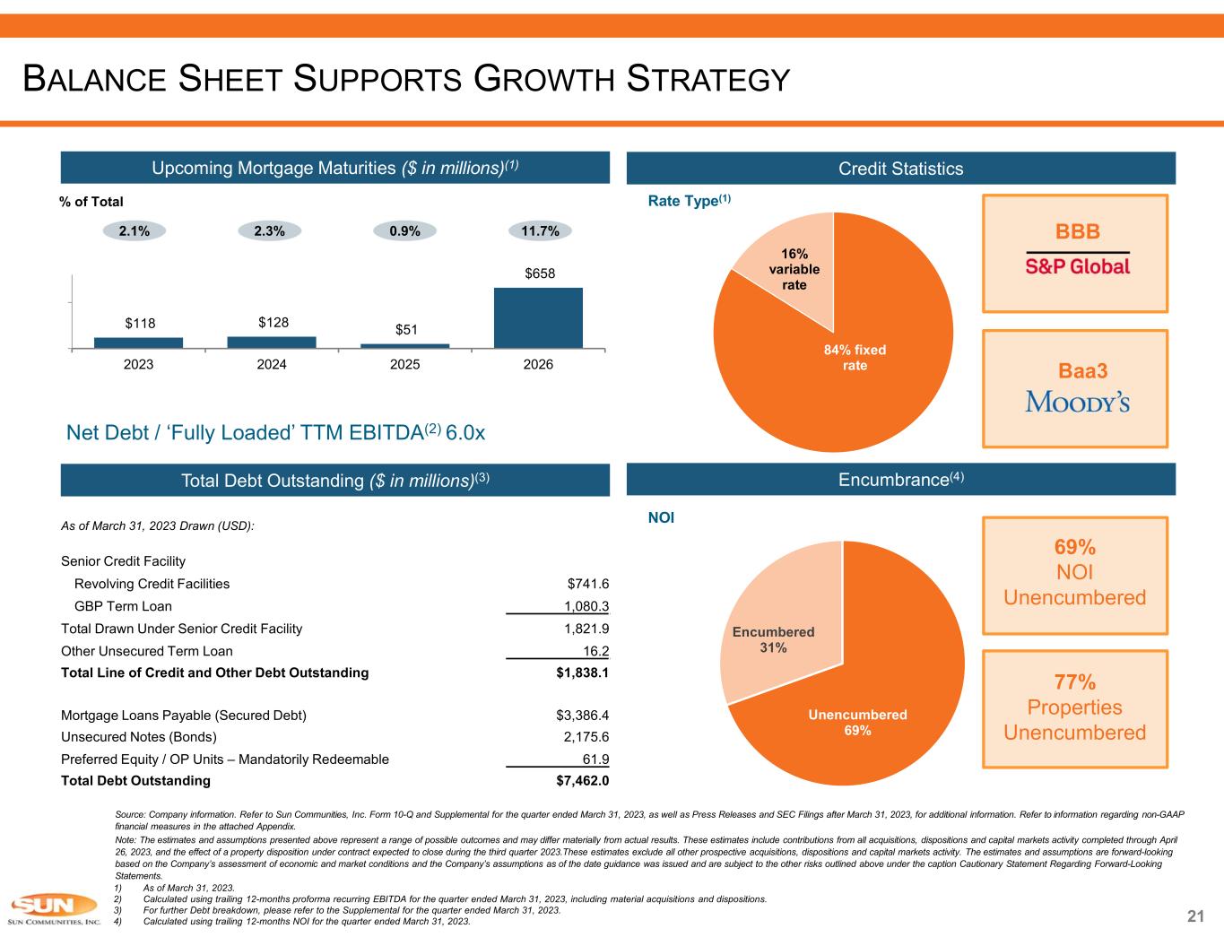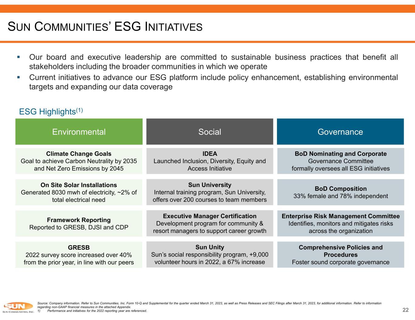 Unencumbered 69% Encumbered 31% 21 Source: Company information. Refer to Sun Communities, Inc. Form 10-Q and Supplemental for the quarter ended March 31, 2023, as well as Press Releases and SEC Filings after March 31, 2023, for additional information. Refer to information regarding non-GAAP financial measures in the attached Appendix. Note: The estimates and assumptions presented above represent a range of possible outcomes and may differ materially from actual results. These estimates include contributions from all acquisitions, dispositions and capital markets activity completed through April 26, 2023, and the effect of a property disposition under contract expected to close during the third quarter 2023.These estimates exclude all other prospective acquisitions, dispositions and capital markets activity. The estimates and assumptions are forward-looking based on the Company’s assessment of economic and market conditions and the Company’s assumptions as of the date guidance was issued and are subject to the other risks outlined above under the caption Cautionary Statement Regarding Forward-Looking Statements. 1) As of March 31, 2023. 2) Calculated using trailing 12-months proforma recurring EBITDA for the quarter ended March 31, 2023, including material acquisitions and dispositions. 3) For further Debt breakdown, please refer to the Supplemental for the quarter ended March 31, 2023. 4) Calculated using trailing 12-months NOI for the quarter ended March 31, 2023. 84% fixed rate 16% variable rate Credit Statistics Rate Type(1) Upcoming Mortgage Maturities ($ in millions)(1) 2.1% 2.3% 0.9% 11.7% % of Total BALANCE SHEET SUPPORTS GROWTH STRATEGY Net Debt / ‘Fully Loaded’ TTM EBITDA(2) 6.0x Encumbrance(4) NOI 69% NOI Unencumbered 77% Properties Unencumbered Total Debt Outstanding ($ in millions)(3) $118 $128 $51 $658 2023 2024 2025 2026 As of March 31, 2023 Drawn (USD): Senior Credit Facility $741.6 Revolving Credit Facilities 1,080.3GBP Term Loan 1,821.9Total Drawn Under Senior Credit Facility 16.2Other Unsecured Term Loan $1,838.1 Total Line of Credit and Other Debt Outstanding $3,386.4 Mortgage Loans Payable (Secured Debt) 2,175.6 Unsecured Notes (Bonds) 61.9Preferred Equity / OP Units – Mandatorily Redeemable $7,462.0 Total Debt Outstanding BBB Baa3