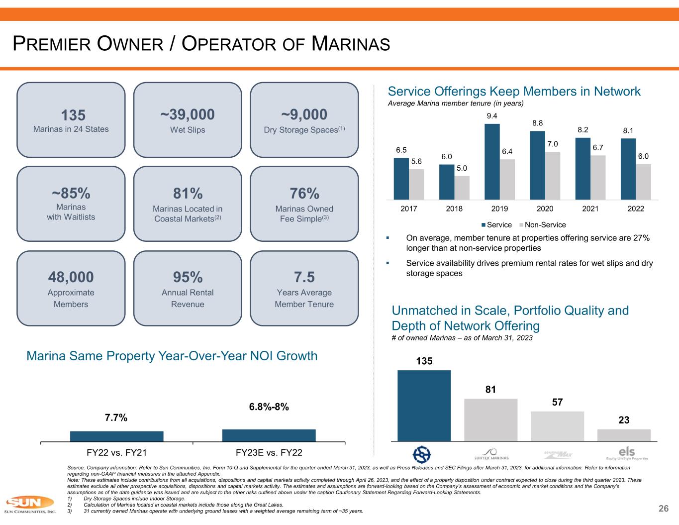 7.7% 6.8%-8% FY22 vs. FY21 FY23E vs. FY22 26 135 Marinas in 24 States ~39,000 Wet Slips ~85% Marinas with Waitlists 81% Marinas Located in Coastal Markets(2) 76% Marinas Owned Fee Simple(3) ~9,000 Dry Storage Spaces(1) 48,000 Approximate Members 95% Annual Rental Revenue 7.5 Years Average Member Tenure Source: Company information. Refer to Sun Communities, Inc. Form 10-Q and Supplemental for the quarter ended March 31, 2023, as well as Press Releases and SEC Filings after March 31, 2023, for additional information. Refer to information regarding non-GAAP financial measures in the attached Appendix. Note: These estimates include contributions from all acquisitions, dispositions and capital markets activity completed through April 26, 2023, and the effect of a property disposition under contract expected to close during the third quarter 2023. These estimates exclude all other prospective acquisitions, dispositions and capital markets activity. The estimates and assumptions are forward-looking based on the Company’s assessment of economic and market conditions and the Company’s assumptions as of the date guidance was issued and are subject to the other risks outlined above under the caption Cautionary Statement Regarding Forward-Looking Statements. 1) Dry Storage Spaces include Indoor Storage. 2) Calculation of Marinas located in coastal markets include those along the Great Lakes. 3) 31 currently owned Marinas operate with underlying ground leases with a weighted average remaining term of ~35 years. Service Offerings Keep Members in Network Average Marina member tenure (in years)  On average, member tenure at properties offering service are 27% longer than at non-service properties  Service availability drives premium rental rates for wet slips and dry storage spaces Marina Same Property Year-Over-Year NOI Growth Unmatched in Scale, Portfolio Quality and Depth of Network Offering # of owned Marinas – as of March 31, 2023 PREMIER OWNER / OPERATOR OF MARINAS 6.5 6.0 9.4 8.8 8.2 8.1 5.6 5.0 6.4 7.0 6.7 6.0 2017 2018 2019 2020 2021 2022 Service Non-Service 135 81 57 23