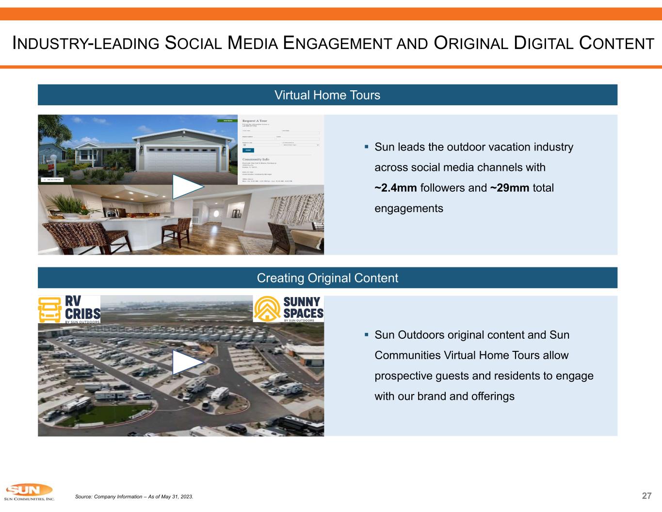 INDUSTRY-LEADING SOCIAL MEDIA ENGAGEMENT AND ORIGINAL DIGITAL CONTENT 27Source: Company Information – As of May 31, 2023.  Sun leads the outdoor vacation industry across social media channels with ~2.4mm followers and ~29mm total engagements Virtual Home Tours Creating Original Content  Sun Outdoors original content and Sun Communities Virtual Home Tours allow prospective guests and residents to engage with our brand and offerings