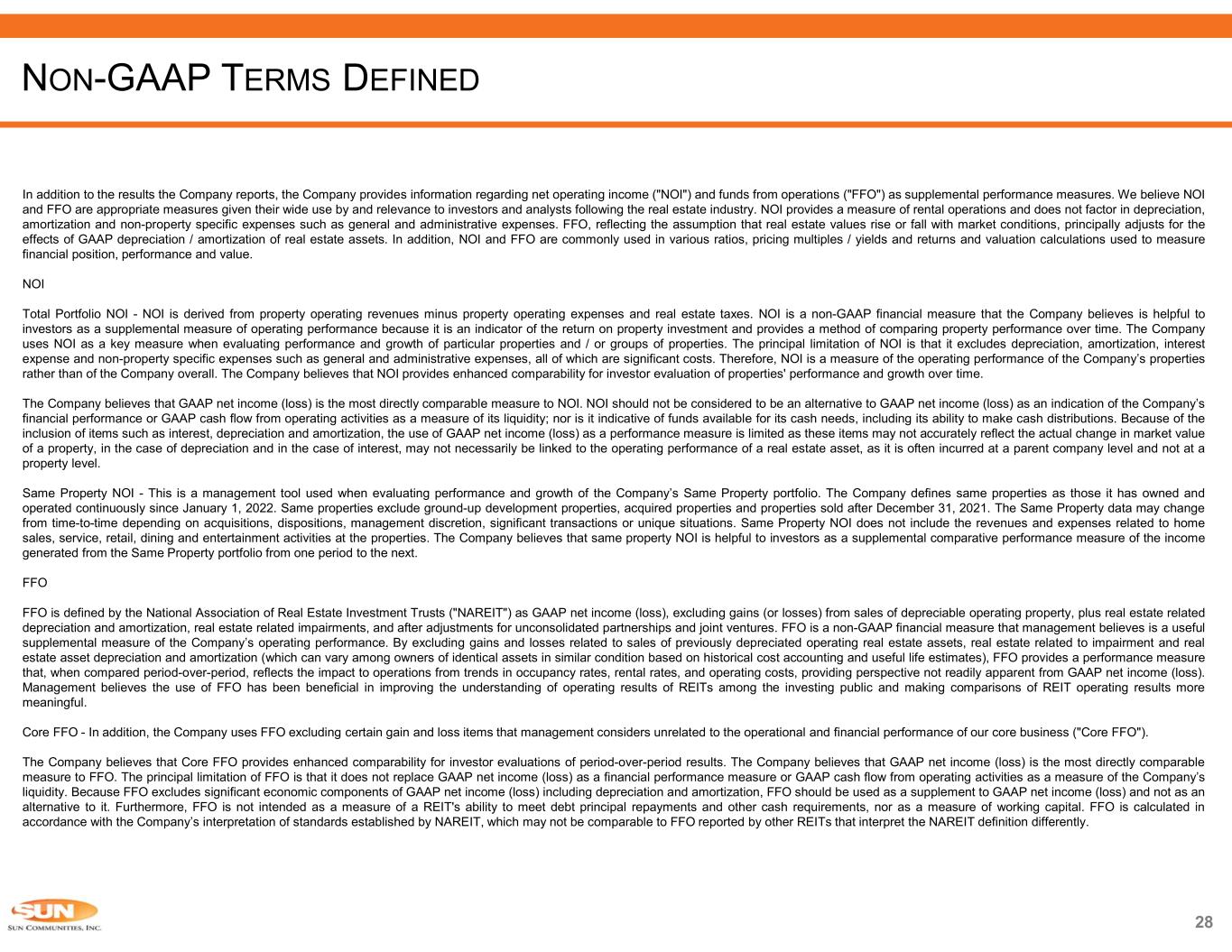 28 In addition to the results the Company reports, the Company provides information regarding net operating income ("NOI") and funds from operations ("FFO") as supplemental performance measures. We believe NOI and FFO are appropriate measures given their wide use by and relevance to investors and analysts following the real estate industry. NOI provides a measure of rental operations and does not factor in depreciation, amortization and non-property specific expenses such as general and administrative expenses. FFO, reflecting the assumption that real estate values rise or fall with market conditions, principally adjusts for the effects of GAAP depreciation / amortization of real estate assets. In addition, NOI and FFO are commonly used in various ratios, pricing multiples / yields and returns and valuation calculations used to measure financial position, performance and value. NOI Total Portfolio NOI - NOI is derived from property operating revenues minus property operating expenses and real estate taxes. NOI is a non-GAAP financial measure that the Company believes is helpful to investors as a supplemental measure of operating performance because it is an indicator of the return on property investment and provides a method of comparing property performance over time. The Company uses NOI as a key measure when evaluating performance and growth of particular properties and / or groups of properties. The principal limitation of NOI is that it excludes depreciation, amortization, interest expense and non-property specific expenses such as general and administrative expenses, all of which are significant costs. Therefore, NOI is a measure of the operating performance of the Company’s properties rather than of the Company overall. The Company believes that NOI provides enhanced comparability for investor evaluation of properties' performance and growth over time. The Company believes that GAAP net income (loss) is the most directly comparable measure to NOI. NOI should not be considered to be an alternative to GAAP net income (loss) as an indication of the Company’s financial performance or GAAP cash flow from operating activities as a measure of its liquidity; nor is it indicative of funds available for its cash needs, including its ability to make cash distributions. Because of the inclusion of items such as interest, depreciation and amortization, the use of GAAP net income (loss) as a performance measure is limited as these items may not accurately reflect the actual change in market value of a property, in the case of depreciation and in the case of interest, may not necessarily be linked to the operating performance of a real estate asset, as it is often incurred at a parent company level and not at a property level. Same Property NOI - This is a management tool used when evaluating performance and growth of the Company’s Same Property portfolio. The Company defines same properties as those it has owned and operated continuously since January 1, 2022. Same properties exclude ground-up development properties, acquired properties and properties sold after December 31, 2021. The Same Property data may change from time-to-time depending on acquisitions, dispositions, management discretion, significant transactions or unique situations. Same Property NOI does not include the revenues and expenses related to home sales, service, retail, dining and entertainment activities at the properties. The Company believes that same property NOI is helpful to investors as a supplemental comparative performance measure of the income generated from the Same Property portfolio from one period to the next. FFO FFO is defined by the National Association of Real Estate Investment Trusts ("NAREIT") as GAAP net income (loss), excluding gains (or losses) from sales of depreciable operating property, plus real estate related depreciation and amortization, real estate related impairments, and after adjustments for unconsolidated partnerships and joint ventures. FFO is a non-GAAP financial measure that management believes is a useful supplemental measure of the Company’s operating performance. By excluding gains and losses related to sales of previously depreciated operating real estate assets, real estate related to impairment and real estate asset depreciation and amortization (which can vary among owners of identical assets in similar condition based on historical cost accounting and useful life estimates), FFO provides a performance measure that, when compared period-over-period, reflects the impact to operations from trends in occupancy rates, rental rates, and operating costs, providing perspective not readily apparent from GAAP net income (loss). Management believes the use of FFO has been beneficial in improving the understanding of operating results of REITs among the investing public and making comparisons of REIT operating results more meaningful. Core FFO - In addition, the Company uses FFO excluding certain gain and loss items that management considers unrelated to the operational and financial performance of our core business ("Core FFO"). The Company believes that Core FFO provides enhanced comparability for investor evaluations of period-over-period results. The Company believes that GAAP net income (loss) is the most directly comparable measure to FFO. The principal limitation of FFO is that it does not replace GAAP net income (loss) as a financial performance measure or GAAP cash flow from operating activities as a measure of the Company’s liquidity. Because FFO excludes significant economic components of GAAP net income (loss) including depreciation and amortization, FFO should be used as a supplement to GAAP net income (loss) and not as an alternative to it. Furthermore, FFO is not intended as a measure of a REIT's ability to meet debt principal repayments and other cash requirements, nor as a measure of working capital. FFO is calculated in accordance with the Company’s interpretati