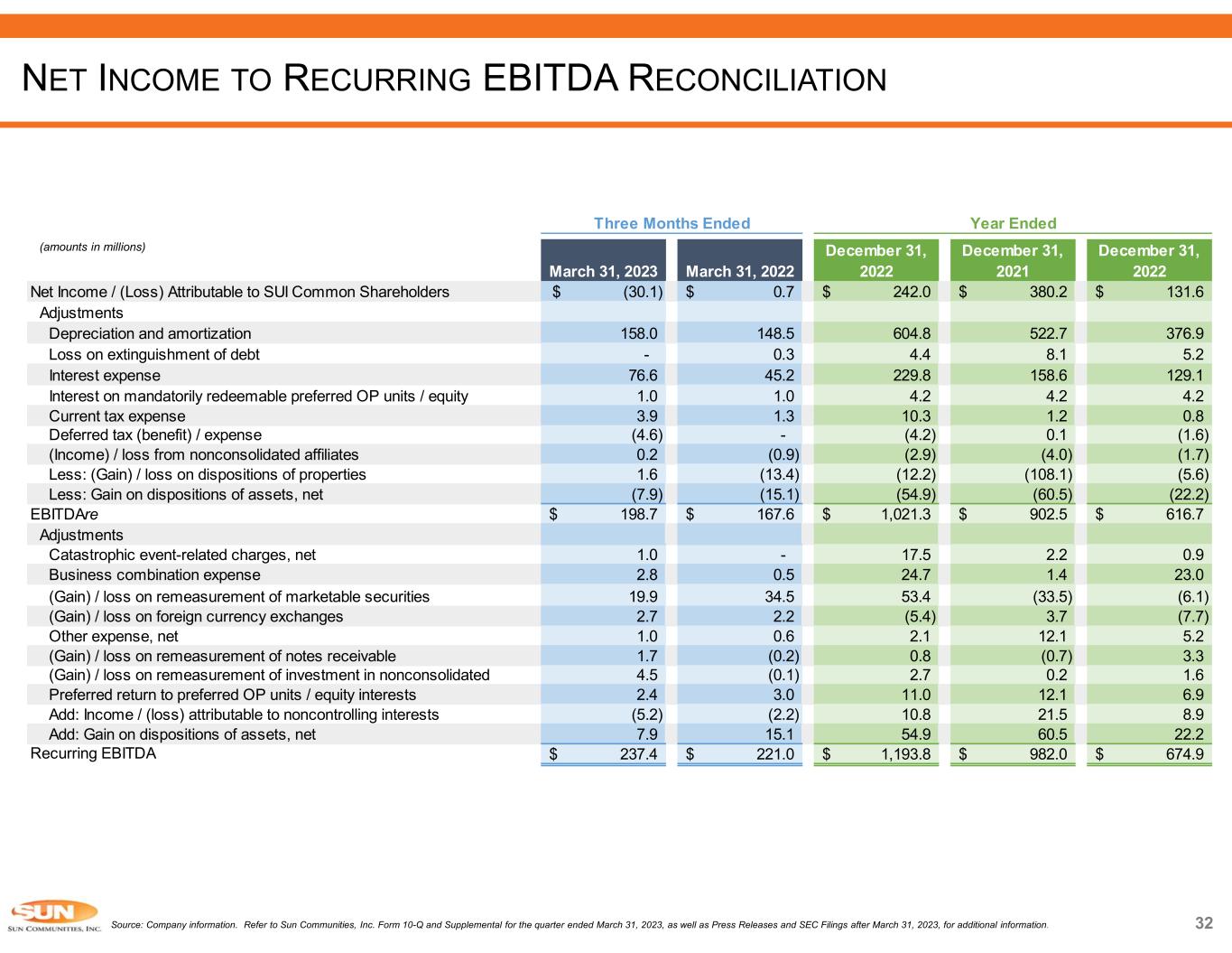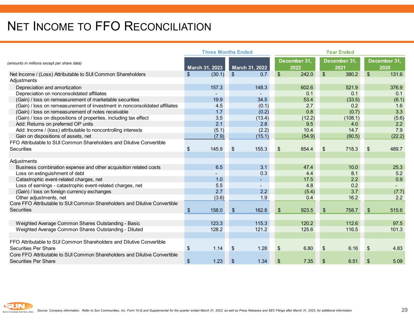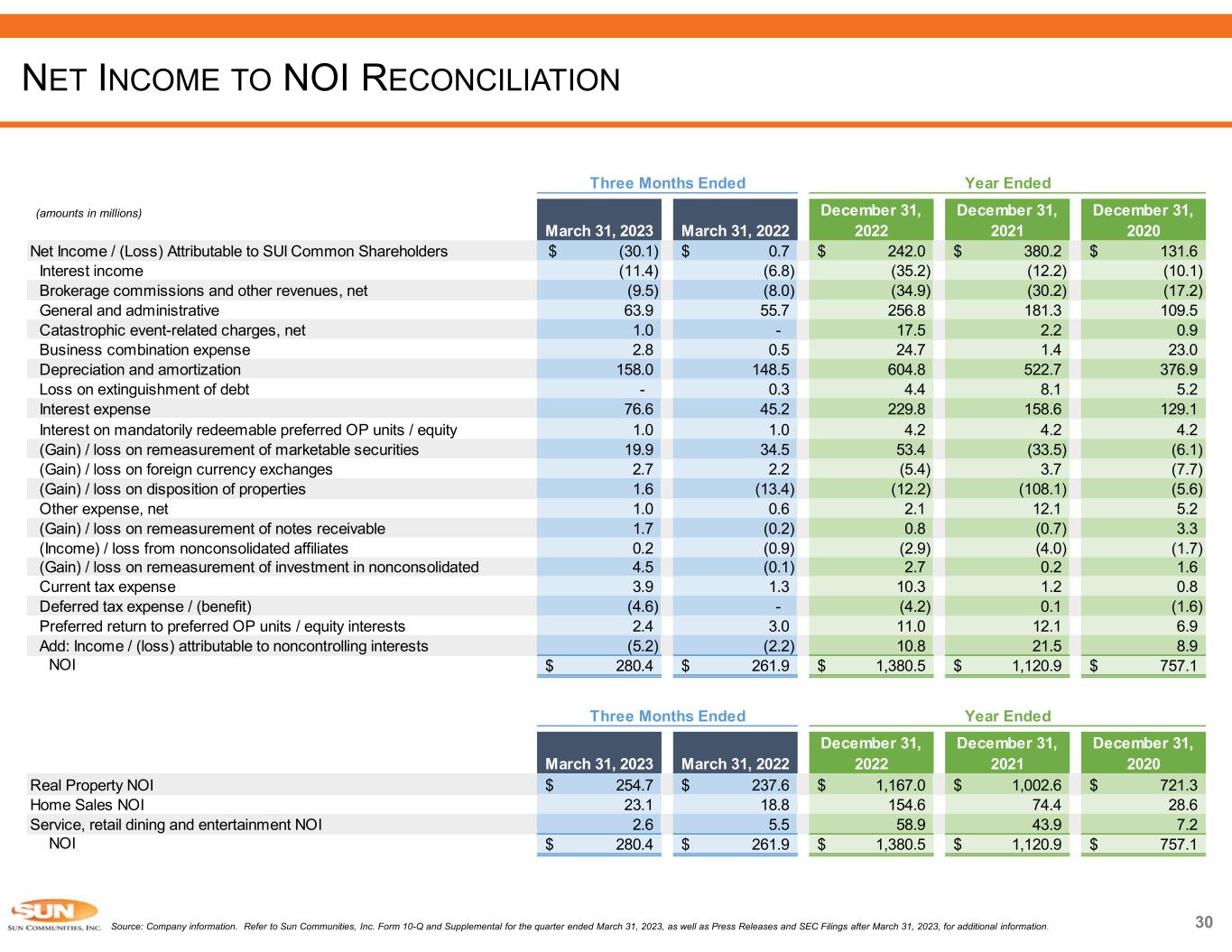 March 31, 2023 March 31, 2022 December 31, 2022 December 31, 2021 December 31, 2020 Net Income / (Loss) Attributable to SUI Common Shareholders (30.1)$ 0.7$ 242.0$ 380.2$ 131.6$ Adjustments Depreciation and amortization 157.3 148.3 602.6 521.9 376.9 Depreciation on nonconsolidated affiliates - - 0.1 0.1 0.1 (Gain) / loss on remeasurement of marketable securities 19.9 34.5 53.4 (33.5) (6.1) (Gain) / loss on remeasurement of investment in nonconsolidated affiliates 4.5 (0.1) 2.7 0.2 1.6 (Gain) / loss on remeasurement of notes receivable 1.7 (0.2) 0.8 (0.7) 3.3 (Gain) / loss on dispositions of properties, including tax effect 3.5 (13.4) (12.2) (108.1) (5.6) Add: Returns on preferred OP units 2.1 2.8 9.5 4.0 2.2 Add: Income / (loss) attributable to noncontrolling interests (5.1) (2.2) 10.4 14.7 7.9 Gain on dispositions of assets, net (7.9) (15.1) (54.9) (60.5) (22.2) FFO Attributable to SUI Common Shareholders and Dilutive Convertible Securities 145.9$ 155.3$ 854.4$ 718.3$ 489.7$ Adjustments Business combination expense and other acquisition related costs 6.5 3.1 47.4 10.0 25.3 Loss on extinguishment of debt - 0.3 4.4 8.1 5.2 Catastrophic event-related charges, net 1.0 - 17.5 2.2 0.9 Loss of earnings - catastrophic event-related charges, net 5.5 - 4.8 0.2 - (Gain) / loss on foreign currency exchanges 2.7 2.2 (5.4) 3.7 (7.7) Other adjustments, net (3.6) 1.9 0.4 16.2 2.2 Core FFO Attributable to SUI Common Shareholders and Dilutive Convertible Securities 158.0$ 162.8$ 923.5$ 758.7$ 515.6$ Weighted Average Common Shares Outstanding - Basic 123.3 115.3 120.2 112.6 97.5 Weighted Average Common Shares Outstanding - Diluted 128.2 121.2 125.6 116.5 101.3 FFO Attributable to SUI Common Shareholders and Dilutive Convertible Securities Per Share 1.14$ 1.28$ 6.80$ 6.16$ 4.83$ Core FFO Attributable to SUI Common Shareholders and Dilutive Convertible Securities Per Share 1.23$ 1.34$ 7.35$ 6.51$ 5.09$ Year EndedThree Months Ended 29 (amounts in millions except per share data) Source: Company information. Refer to Sun Communities, Inc. Form 10-Q and Supplemental for the quarter ended March 31, 2023, as well as Press Releases and SEC Filings after March 31, 2023, for additional information. NET INCOME TO FFO RECONCILIATION