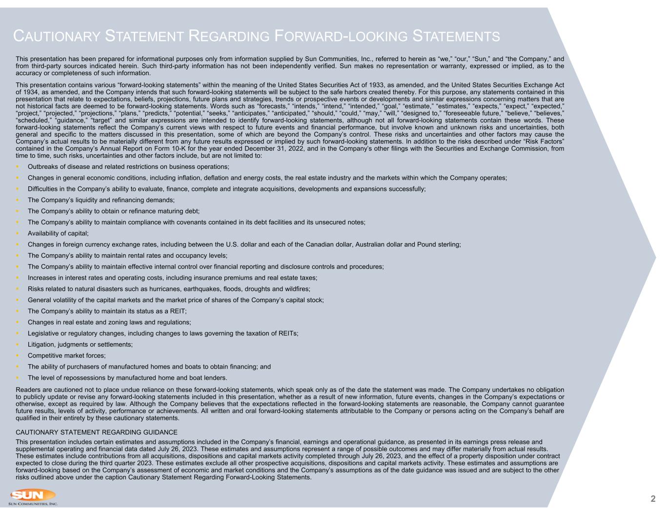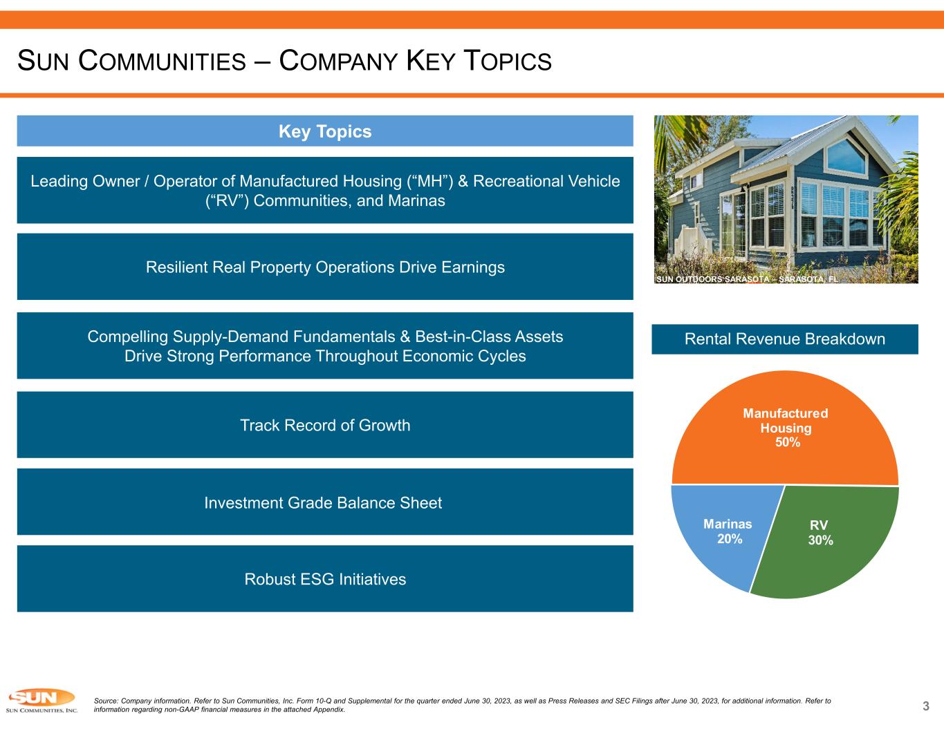 2 This presentation has been prepared for informational purposes only from information supplied by Sun Communities, Inc., referred to herein as “we,” “our,” “Sun,” and “the Company,” and from third-party sources indicated herein. Such third-party information has not been independently verified. Sun makes no representation or warranty, expressed or implied, as to the accuracy or completeness of such information. This presentation contains various “forward-looking statements” within the meaning of the United States Securities Act of 1933, as amended, and the United States Securities Exchange Act of 1934, as amended, and the Company intends that such forward-looking statements will be subject to the safe harbors created thereby. For this purpose, any statements contained in this presentation that relate to expectations, beliefs, projections, future plans and strategies, trends or prospective events or developments and similar expressions concerning matters that are not historical facts are deemed to be forward-looking statements. Words such as “forecasts,” “intends,” “intend,” “intended,” “goal,” “estimate,” “estimates,” “expects,” “expect,” “expected,” “project,” “projected,” “projections,” “plans,” “predicts,” “potential,” “seeks,” “anticipates,” “anticipated,” “should,” “could,” “may,” “will,” “designed to,” “foreseeable future,” “believe,” “believes,” “scheduled,” “guidance,” “target” and similar expressions are intended to identify forward-looking statements, although not all forward-looking statements contain these words. These forward-looking statements reflect the Company’s current views with respect to future events and financial performance, but involve known and unknown risks and uncertainties, both general and specific to the matters discussed in this presentation, some of which are beyond the Company’s control. These risks and uncertainties and other factors may cause the Company’s actual results to be materially different from any future results expressed or implied by such forward-looking statements. In addition to the risks described under “Risk Factors” contained in the Company’s Annual Report on Form 10-K for the year ended December 31, 2022, and in the Company’s other filings with the Securities and Exchange Commission, from time to time, such risks, uncertainties and other factors include, but are not limited to:  Outbreaks of disease and related restrictions on business operations;  Changes in general economic conditions, including inflation, deflation and energy costs, the real estate industry and the markets within which the Company operates;  Difficulties in the Company’s ability to evaluate, finance, complete and integrate acquisitions, developments and expansions successfully;  The Company’s liquidity and refinancing demands;  The Company’s ability to obtain or refinance maturing debt;  The Company’s ability to maintain compliance with covenants contained in its debt facilities and its unsecured notes;  Availability of capital;  Changes in foreign currency exchange rates, including between the U.S. dollar and each of the Canadian dollar, Australian dollar and Pound sterling;  The Company’s ability to maintain rental rates and occupancy levels;  The Company’s ability to maintain effective internal control over financial reporting and disclosure controls and procedures;  Increases in interest rates and operating costs, including insurance premiums and real estate taxes;  Risks related to natural disasters such as hurricanes, earthquakes, floods, droughts and wildfires;  General volatility of the capital markets and the market price of shares of the Company’s capital stock;  The Company’s ability to maintain its status as a REIT;  Changes in real estate and zoning laws and regulations;  Legislative or regulatory changes, including changes to laws governing the taxation of REITs;  Litigation, judgments or settlements;  Competitive market forces;  The ability of purchasers of manufactured homes and boats to obtain financing; and  The level of repossessions by manufactured home and boat lenders. Readers are cautioned not to place undue reliance on these forward-looking statements, which speak only as of the date the statement was made. The Company undertakes no obligation to publicly update or revise any forward-looking statements included in this presentation, whether as a result of new information, future events, changes in the Company’s expectations or otherwise, except as required by law. Although the Company believes that the expectations reflected in the forward-looking statements are reasonable, the Company cannot guarantee future results, levels of activity, performance or achievements. All written and oral forward-looking statements attributable to the Company or persons acting on the Company’s behalf are qualified in their entirety by these cautionary statements. CAUTIONARY STATEMENT REGARDING GUIDANCE This presentation includes certain estimates and assumptions included in the Company’s financial, earnings and operational guidance, as presented in its earnings press release and supplemental operating and financial data dated July 26, 2023. These estimates and assumptions represent a range of possible outcomes and may differ materially from actual results. These estimates include contributions from all acquisitions, dispositions and capital markets activity completed through July 26, 2023, and the effect of a property disposition under contract expected to close during the third quarter 2023. These estimates exclude all other prospective acquisitions, dispositions and capital markets activity. These estimates and assumptions are forward-looking based on the Company’s assessment of economic and market conditions and the Company