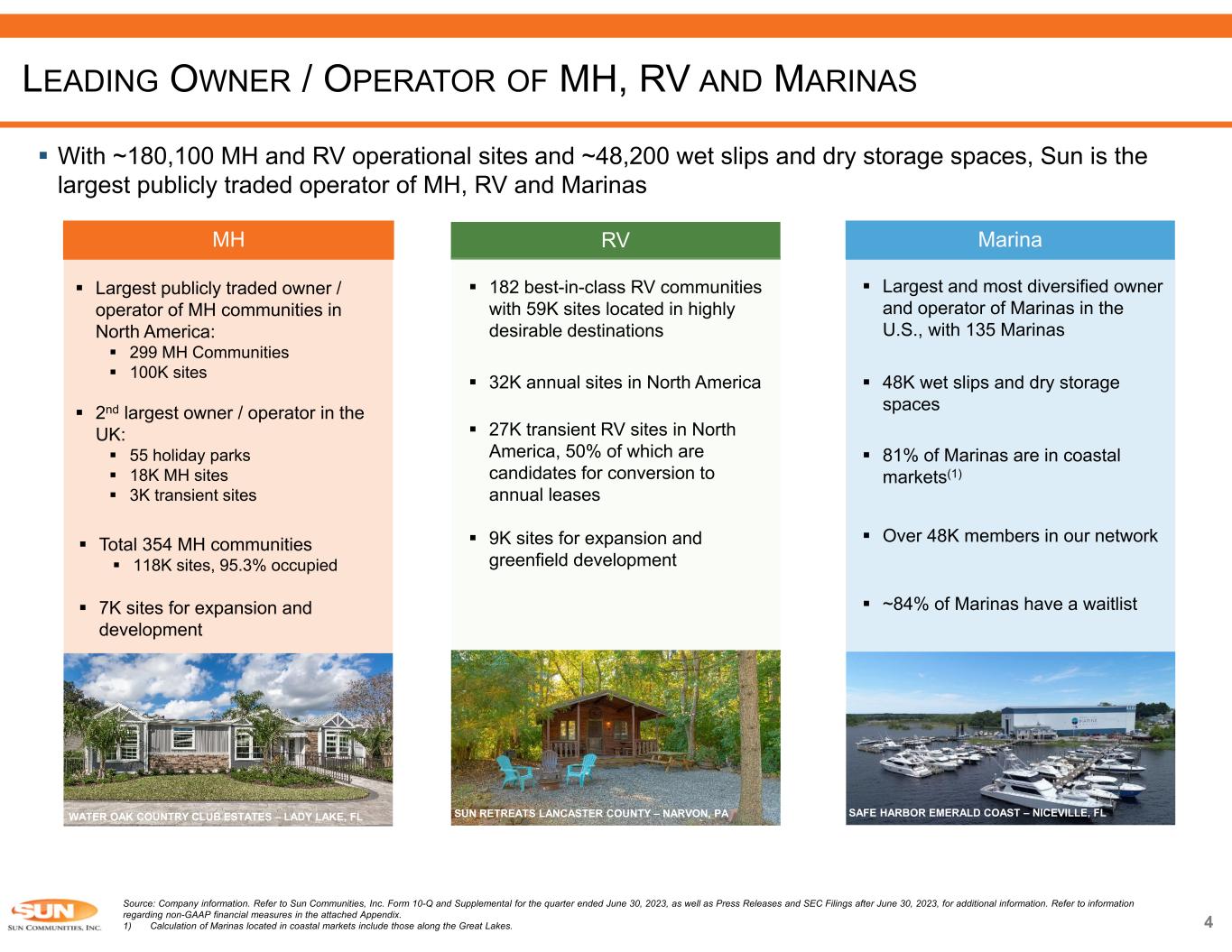 Source: Company information. Refer to Sun Communities, Inc. Form 10-Q and Supplemental for the quarter ended June 30, 2023, as well as Press Releases and SEC Filings after June 30, 2023, for additional information. Refer to information regarding non-GAAP financial measures in the attached Appendix. SUN COMMUNITIES – COMPANY KEY TOPICS Resilient Real Property Operations Drive Earnings Leading Owner / Operator of Manufactured Housing (“MH”) & Recreational Vehicle (“RV”) Communities, and Marinas Compelling Supply-Demand Fundamentals & Best-in-Class Assets Drive Strong Performance Throughout Economic Cycles Track Record of Growth Investment Grade Balance Sheet 3 Key Topics Manufactured Housing 50% RV 30% Marinas 20% Rental Revenue Breakdown Robust ESG Initiatives SUN OUTDOORS SARASOTA – SARASOTA, FL