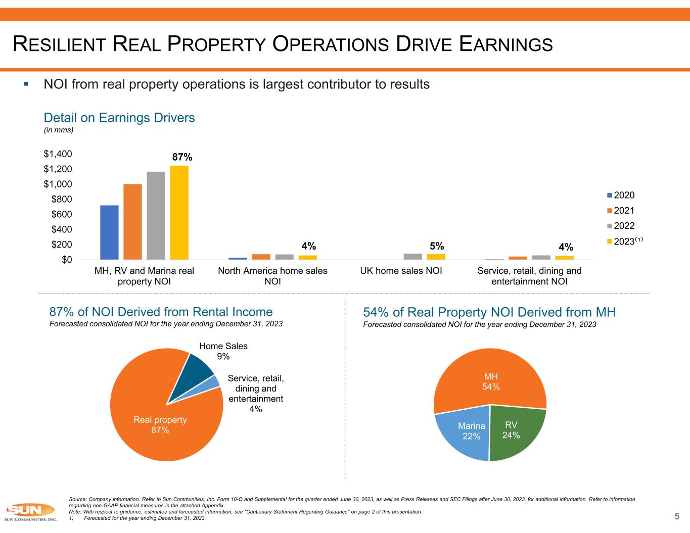 4  With ~180,100 MH and RV operational sites and ~48,200 wet slips and dry storage spaces, Sun is the largest publicly traded operator of MH, RV and Marinas Source: Company information. Refer to Sun Communities, Inc. Form 10-Q and Supplemental for the quarter ended June 30, 2023, as well as Press Releases and SEC Filings after June 30, 2023, for additional information. Refer to information regarding non-GAAP financial measures in the attached Appendix. 1) Calculation of Marinas located in coastal markets include those along the Great Lakes. MH RV  Largest publicly traded owner / operator of MH communities in North America:  299 MH Communities  100K sites  182 best-in-class RV communities with 59K sites located in highly desirable destinations  Largest and most diversified owner and operator of Marinas in the U.S., with 135 Marinas WATER OAK COUNTRY CLUB ESTATES – LADY LAKE, FL Marina SAFE HARBOR EMERALD COAST – NICEVILLE, FLSUN RETREATS LANCASTER COUNTY – NARVON, PA  32K annual sites in North America  27K transient RV sites in North America, 50% of which are candidates for conversion to annual leases  9K sites for expansion and greenfield development  Total 354 MH communities  118K sites, 95.3% occupied  7K sites for expansion and development  2nd largest owner / operator in the UK:  55 holiday parks  18K MH sites  3K transient sites  48K wet slips and dry storage spaces  Over 48K members in our network  81% of Marinas are in coastal markets(1) LEADING OWNER / OPERATOR OF MH, RV AND MARINAS  ~84% of Marinas have a waitlist