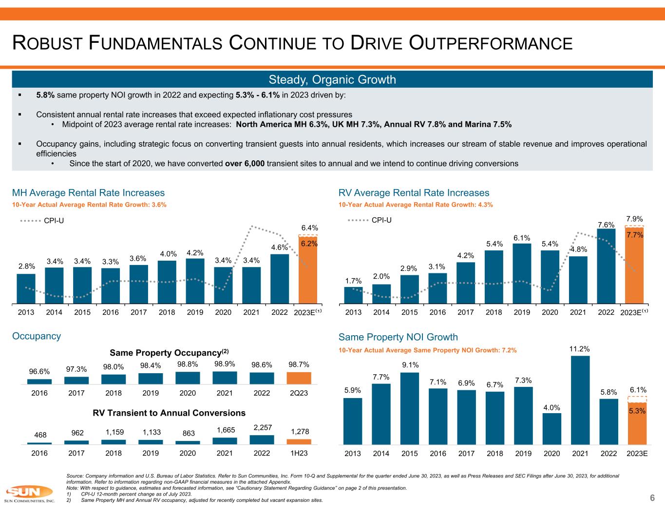 Source: Company information. Refer to Sun Communities, Inc. Form 10-Q and Supplemental for the quarter ended June 30, 2023, as well as Press Releases and SEC Filings after June 30, 2023, for additional information. Refer to information regarding non-GAAP financial measures in the attached Appendix. Note: With respect to guidance, estimates and forecasted information, see “Cautionary Statement Regarding Guidance” on page 2 of this presentation. 1) Forecasted for the year ending December 31, 2023. RESILIENT REAL PROPERTY OPERATIONS DRIVE EARNINGS Real property 87% Home Sales 9% Service, retail, dining and entertainment 4% 54% of Real Property NOI Derived from MH Forecasted consolidated NOI for the year ending December 31, 2023 87% of NOI Derived from Rental Income Forecasted consolidated NOI for the year ending December 31, 2023 MH 54% RV 24% Marina 22% 5 Detail on Earnings Drivers (in mms) $0 $200 $400 $600 $800 $1,000 $1,200 $1,400 MH, RV and Marina real property NOI North America home sales NOI UK home sales NOI Service, retail, dining and entertainment NOI 2020 2021 2022 2023⁽¹⁾  NOI from real property operations is largest contributor to results 87% 4% 5% 4%