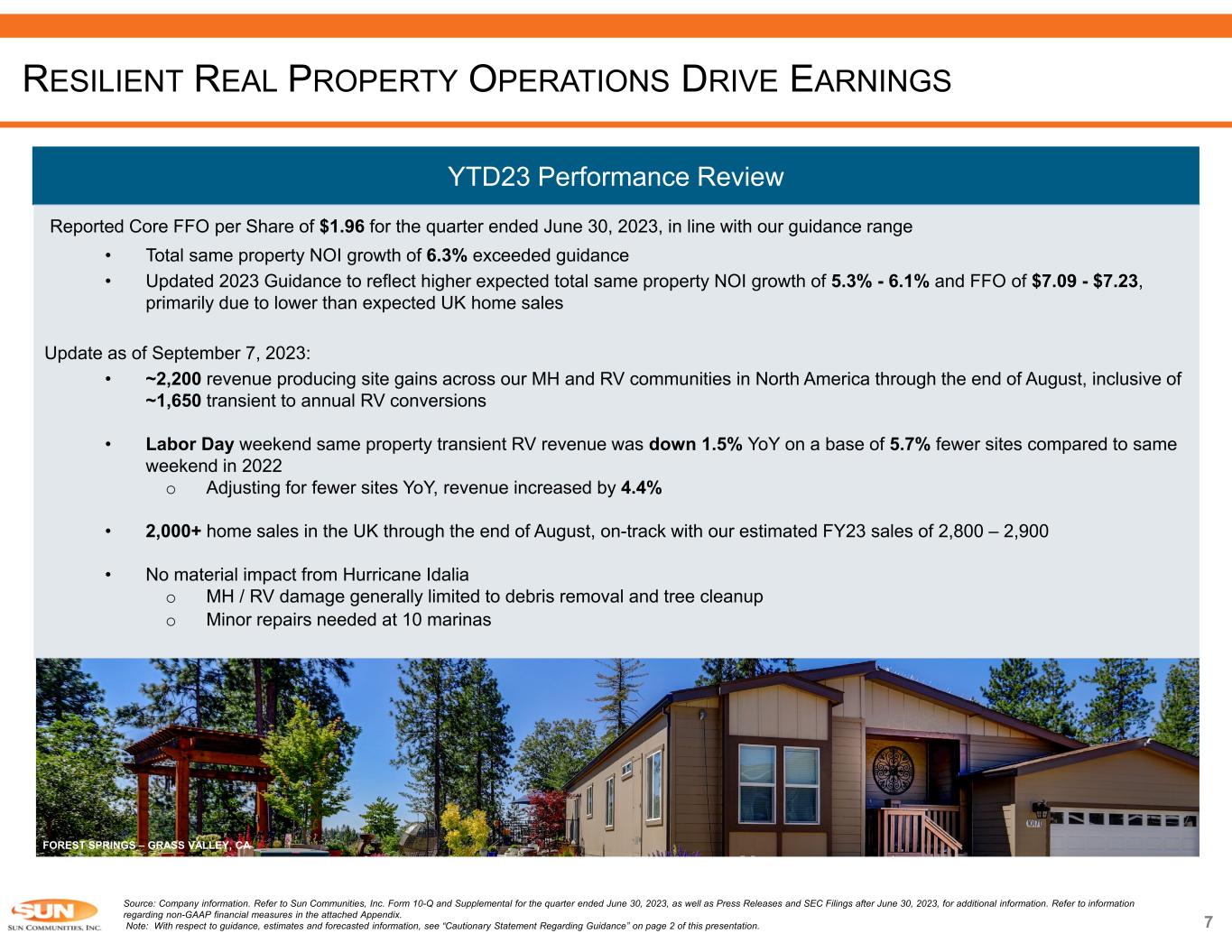 Source: Company information and U.S. Bureau of Labor Statistics. Refer to Sun Communities, Inc. Form 10-Q and Supplemental for the quarter ended June 30, 2023, as well as Press Releases and SEC Filings after June 30, 2023, for additional information. Refer to information regarding non-GAAP financial measures in the attached Appendix. Note: With respect to guidance, estimates and forecasted information, see “Cautionary Statement Regarding Guidance” on page 2 of this presentation. 1) CPI-U 12-month percent change as of July 2023. 2) Same Property MH and Annual RV occupancy, adjusted for recently completed but vacant expansion sites. ROBUST FUNDAMENTALS CONTINUE TO DRIVE OUTPERFORMANCE  5.8% same property NOI growth in 2022 and expecting 5.3% - 6.1% in 2023 driven by:  Consistent annual rental rate increases that exceed expected inflationary cost pressures • Midpoint of 2023 average rental rate increases: North America MH 6.3%, UK MH 7.3%, Annual RV 7.8% and Marina 7.5%  Occupancy gains, including strategic focus on converting transient guests into annual residents, which increases our stream of stable revenue and improves operational efficiencies • Since the start of 2020, we have converted over 6,000 transient sites to annual and we intend to continue driving conversions Steady, Organic Growth 6 MH Average Rental Rate Increases RV Average Rental Rate Increases Occupancy 5.9% 7.7% 9.1% 7.1% 6.9% 6.7% 7.3% 4.0% 11.2% 5.8% 5.3% 2013 2014 2015 2016 2017 2018 2019 2020 2021 2022 2023E 6.1% Same Property NOI Growth 2.8% 3.4% 3.4% 3.3% 3.6% 4.0% 4.2% 3.4% 3.4% 4.6% 6.2% 2013 2014 2015 2016 2017 2018 2019 2020 2021 2022 2023E⁽¹⁾ CPI-U 1.7% 2.0% 2.9% 3.1% 4.2% 5.4% 6.1% 5.4% 4.8% 7.6% 7.7% 2013 2014 2015 2016 2017 2018 2019 2020 2021 2022 2023E⁽¹⁾ CPI-U 6.4% 7.9% 10-Year Actual Average Same Property NOI Growth: 7.2% 10-Year Actual Average Rental Rate Growth: 3.6% 10-Year Actual Average Rental Rate Growth: 4.3% 468 962 1,159 1,133 863 1,665 2,257 1,278 2016 2017 2018 2019 2020 2021 2022 1H23 RV Transient to Annual Conversions 96.6% 97.3% 98.0% 98.4% 98.8% 98.9% 98.6% 98.7% 2016 2017 2018 2019 2020 2021 2022 2Q23 Same Property Occupancy(2)