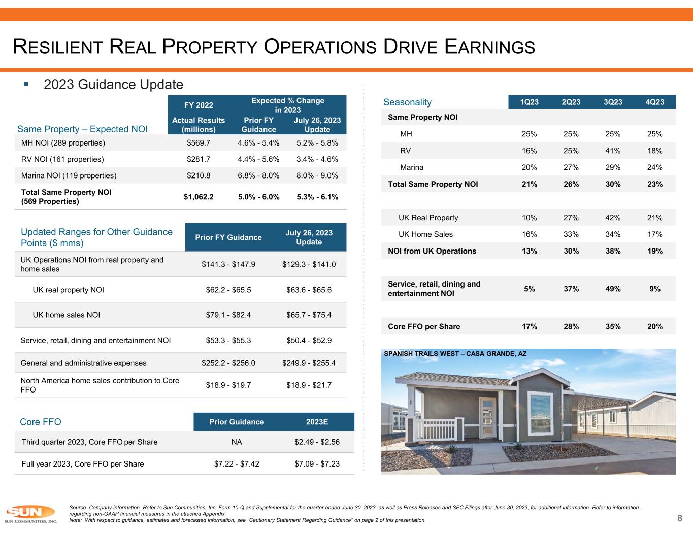 7 YTD23 Performance Review Reported Core FFO per Share of $1.96 for the quarter ended June 30, 2023, in line with our guidance range • Total same property NOI growth of 6.3% exceeded guidance • Updated 2023 Guidance to reflect higher expected total same property NOI growth of 5.3% - 6.1% and FFO of $7.09 - $7.23, primarily due to lower than expected UK home sales Update as of September 7, 2023: • ~2,200 revenue producing site gains across our MH and RV communities in North America through the end of August, inclusive of ~1,650 transient to annual RV conversions • Labor Day weekend same property transient RV revenue was down 1.5% YoY on a base of 5.7% fewer sites compared to same weekend in 2022 o Adjusting for fewer sites YoY, revenue increased by 4.4% • 2,000+ home sales in the UK through the end of August, on-track with our estimated FY23 sales of 2,800 – 2,900 • No material impact from Hurricane Idalia o MH / RV damage generally limited to debris removal and tree cleanup o Minor repairs needed at 10 marinas Source: Company information. Refer to Sun Communities, Inc. Form 10-Q and Supplemental for the quarter ended June 30, 2023, as well as Press Releases and SEC Filings after June 30, 2023, for additional information. Refer to information regarding non-GAAP financial measures in the attached Appendix. Note: With respect to guidance, estimates and forecasted information, see “Cautionary Statement Regarding Guidance” on page 2 of this presentation. RESILIENT REAL PROPERTY OPERATIONS DRIVE EARNINGS FOREST SPRINGS – GRASS VALLEY, CA