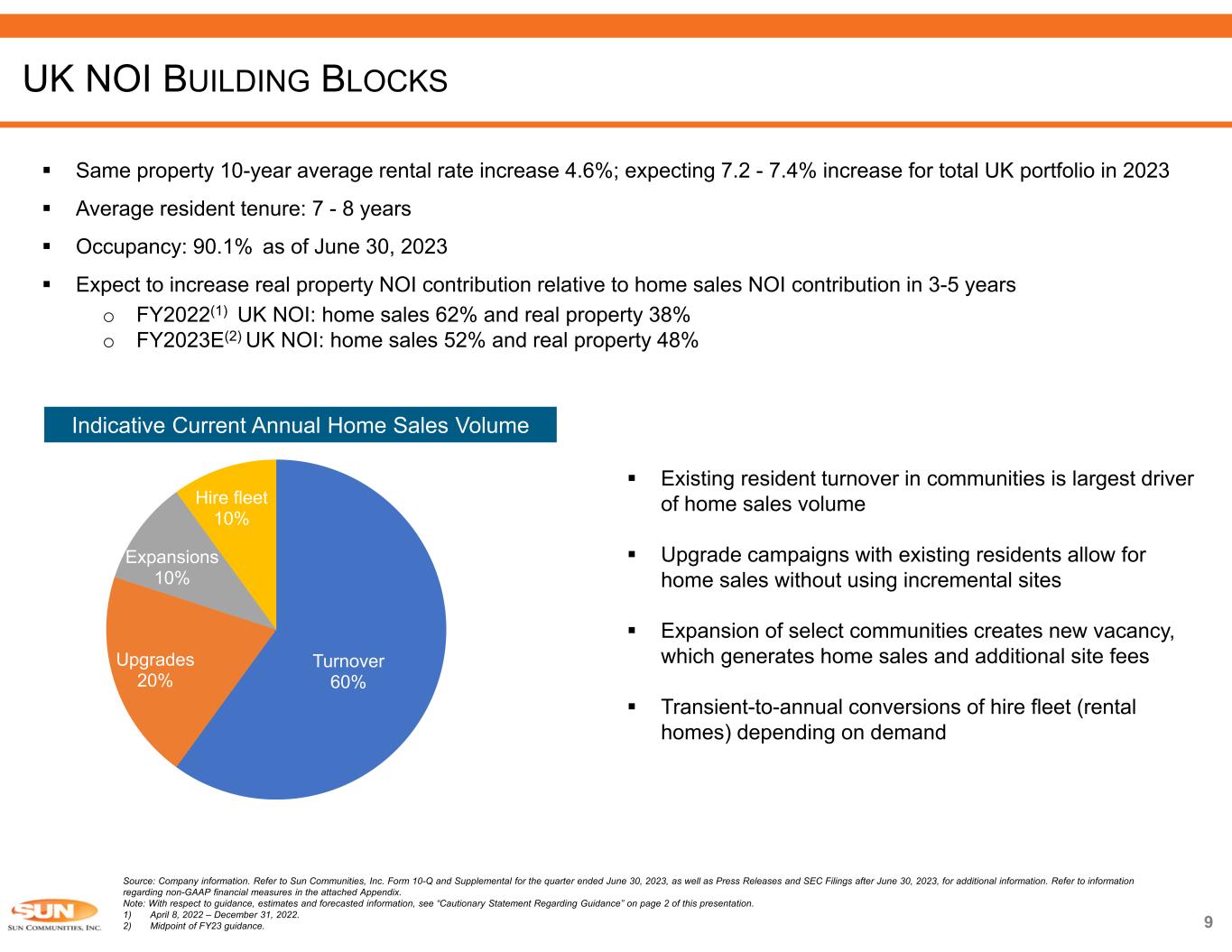 Source: Company information. Refer to Sun Communities, Inc. Form 10-Q and Supplemental for the quarter ended June 30, 2023, as well as Press Releases and SEC Filings after June 30, 2023, for additional information. Refer to information regarding non-GAAP financial measures in the attached Appendix. Note: With respect to guidance, estimates and forecasted information, see “Cautionary Statement Regarding Guidance” on page 2 of this presentation. 4Q233Q232Q231Q23Seasonality Same Property NOI 25%25%25%25%MH 18%41%25%16%RV 24%29%27%20%Marina 23%30%26%21%Total Same Property NOI 21%42%27%10%UK Real Property 17%34%33%16%UK Home Sales 19%38%30%13%NOI from UK Operations 9%49%37%5%Service, retail, dining and entertainment NOI 20%35%28%17%Core FFO per Share 2023EPrior GuidanceCore FFO $2.49 - $2.56NAThird quarter 2023, Core FFO per Share $7.09 - $7.23$7.22 - $7.42Full year 2023, Core FFO per Share Expected % Change in 2023FY 2022 Same Property – Expected NOI July 26, 2023 Update Prior FY Guidance Actual Results (millions) 5.2% - 5.8%4.6% - 5.4%$569.7MH NOI (289 properties) 3.4% - 4.6%4.4% - 5.6%$281.7RV NOI (161 properties) 8.0% - 9.0%6.8% - 8.0%$210.8Marina NOI (119 properties) 5.3% - 6.1%5.0% - 6.0%$1,062.2Total Same Property NOI (569 Properties) RESILIENT REAL PROPERTY OPERATIONS DRIVE EARNINGS July 26, 2023 UpdatePrior FY GuidanceUpdated Ranges for Other Guidance Points ($ mms)ted $129.3 - $141.0$141.3 - $147.9UK Operations NOI from real property and home sales $63.6 - $65.6$62.2 - $65.5UK real property NOI $65.7 - $75.4$79.1 - $82.4UK home sales NOI $50.4 - $52.9$53.3 - $55.3Service, retail, dining and entertainment NOI $249.9 - $255.4$252.2 - $256.0General and administrative expenses $18.9 - $21.7$18.9 - $19.7North America home sales contribution to Core FFO SPANISH TRAILS WEST – CASA GRANDE, AZ  2023 Guidance Update 8