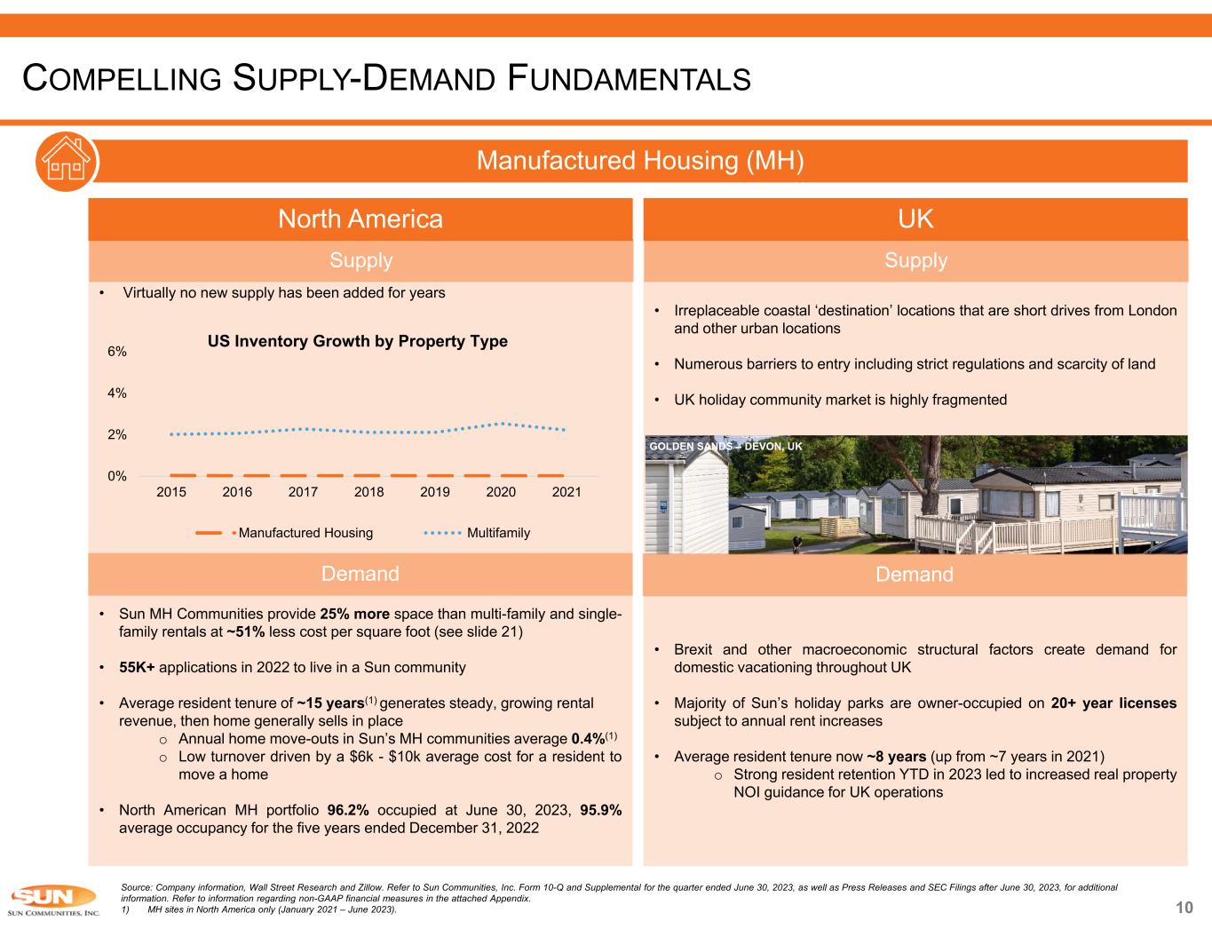 9  Same property 10-year average rental rate increase 4.6%; expecting 7.2 - 7.4% increase for total UK portfolio in 2023  Average resident tenure: 7 - 8 years  Occupancy: 90.1% as of June 30, 2023  Expect to increase real property NOI contribution relative to home sales NOI contribution in 3-5 years o FY2022(1) UK NOI: home sales 62% and real property 38% o FY2023E(2) UK NOI: home sales 52% and real property 48%  Existing resident turnover in communities is largest driver of home sales volume  Upgrade campaigns with existing residents allow for home sales without using incremental sites  Expansion of select communities creates new vacancy, which generates home sales and additional site fees  Transient-to-annual conversions of hire fleet (rental homes) depending on demand Turnover 60% Upgrades 20% Expansions 10% Hire fleet 10% Source: Company information. Refer to Sun Communities, Inc. Form 10-Q and Supplemental for the quarter ended June 30, 2023, as well as Press Releases and SEC Filings after June 30, 2023, for additional information. Refer to information regarding non-GAAP financial measures in the attached Appendix. Note: With respect to guidance, estimates and forecasted information, see “Cautionary Statement Regarding Guidance” on page 2 of this presentation. 1) April 8, 2022 – December 31, 2022. 2) Midpoint of FY23 guidance. UK NOI BUILDING BLOCKS Indicative Current Annual Home Sales Volume