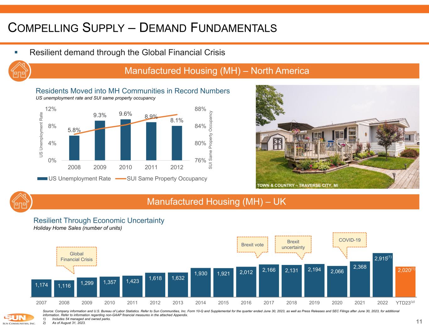 10 Manufactured Housing (MH) Source: Company information, Wall Street Research and Zillow. Refer to Sun Communities, Inc. Form 10-Q and Supplemental for the quarter ended June 30, 2023, as well as Press Releases and SEC Filings after June 30, 2023, for additional information. Refer to information regarding non-GAAP financial measures in the attached Appendix. 1) MH sites in North America only (January 2021 – June 2023). COMPELLING SUPPLY-DEMAND FUNDAMENTALS North America UK 0% 2% 4% 6% 2015 2016 2017 2018 2019 2020 2021 US Inventory Growth by Property Type Manufactured Housing Multifamily GOLDEN SANDS – DEVON, UK • Irreplaceable coastal ‘destination’ locations that are short drives from London and other urban locations • Numerous barriers to entry including strict regulations and scarcity of land • UK holiday community market is highly fragmented • Brexit and other macroeconomic structural factors create demand for domestic vacationing throughout UK • Majority of Sun’s holiday parks are owner-occupied on 20+ year licenses subject to annual rent increases • Average resident tenure now ~8 years (up from ~7 years in 2021) o Strong resident retention YTD in 2023 led to increased real property NOI guidance for UK operations • Virtually no new supply has been added for years • Sun MH Communities provide 25% more space than multi-family and single- family rentals at ~51% less cost per square foot (see slide 21) • 55K+ applications in 2022 to live in a Sun community • Average resident tenure of ~15 years(1) generates steady, growing rental revenue, then home generally sells in place o Annual home move-outs in Sun’s MH communities average 0.4%(1) o Low turnover driven by a $6k - $10k average cost for a resident to move a home • North American MH portfolio 96.2% occupied at June 30, 2023, 95.9% average occupancy for the five years ended December 31, 2022 Supply Demand Supply Demand