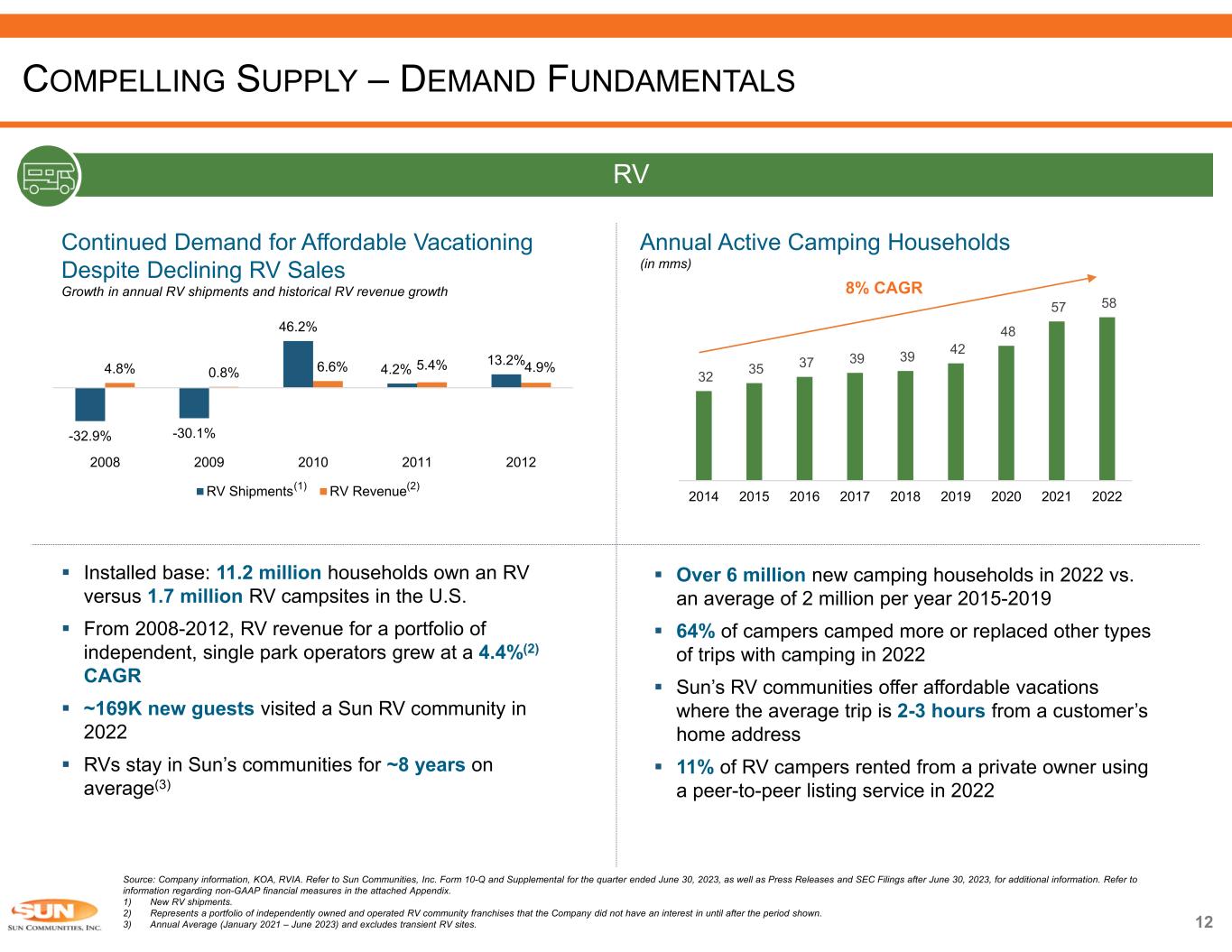 11 Manufactured Housing (MH) – North America Residents Moved into MH Communities in Record Numbers US unemployment rate and SUI same property occupancy Source: Company information and U.S. Bureau of Labor Statistics. Refer to Sun Communities, Inc. Form 10-Q and Supplemental for the quarter ended June 30, 2023, as well as Press Releases and SEC Filings after June 30, 2023, for additional information. Refer to information regarding non-GAAP financial measures in the attached Appendix. 1) Includes 54 managed and owned parks. 2) As of August 31, 2023. Manufactured Housing (MH) – UK 1,174 1,116 1,299 1,357 1,423 1,618 1,632 1,930 1,921 2,012 2,166 2,131 2,194 2,066 2,368 2,915 2,020 2007 2008 2009 2010 2011 2012 2013 2014 2015 2016 2017 2018 2019 2020 2021 2022 YTD23⁽²⁾ Global Financial Crisis Brexit uncertainty COVID-19 Brexit vote Resilient Through Economic Uncertainty Holiday Home Sales (number of units) TOWN & COUNTRY – TRAVERSE CITY, MI  Resilient demand through the Global Financial Crisis COMPELLING SUPPLY – DEMAND FUNDAMENTALS 5.8% 9.3% 9.6% 8.9% 8.1% 76% 80% 84% 88% 0% 4% 8% 12% 2008 2009 2010 2011 2012 SU I S am e Pr op er ty O cc up an cy U S U ne m pl oy m en t R at e US Unemployment Rate SUI Same Property Occupancy (1) (1)