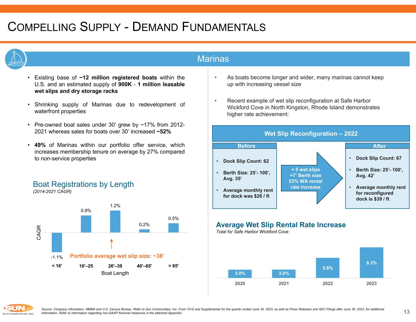 12 RV Continued Demand for Affordable Vacationing Despite Declining RV Sales Growth in annual RV shipments and historical RV revenue growth  Installed base: 11.2 million households own an RV versus 1.7 million RV campsites in the U.S.  From 2008-2012, RV revenue for a portfolio of independent, single park operators grew at a 4.4%(2) CAGR  ~169K new guests visited a Sun RV community in 2022  RVs stay in Sun’s communities for ~8 years on average(3) Source: Company information, KOA, RVIA. Refer to Sun Communities, Inc. Form 10-Q and Supplemental for the quarter ended June 30, 2023, as well as Press Releases and SEC Filings after June 30, 2023, for additional information. Refer to information regarding non-GAAP financial measures in the attached Appendix. 1) New RV shipments. 2) Represents a portfolio of independently owned and operated RV community franchises that the Company did not have an interest in until after the period shown. 3) Annual Average (January 2021 – June 2023) and excludes transient RV sites. SUN OUTDOORS MYRTLE BEACH – CONWAY, SC COMPELLING SUPPLY – DEMAND FUNDAMENTALS -32.9% -30.1% 46.2% 4.2% 13.2%4.8% 0.8% 6.6% 5.4% 4.9% 2008 2009 2010 2011 2012 RV Shipments RV Revenue(2)  Over 6 million new camping households in 2022 vs. an average of 2 million per year 2015-2019  64% of campers camped more or replaced other types of trips with camping in 2022  Sun’s RV communities offer affordable vacations where the average trip is 2-3 hours from a customer’s home address  11% of RV campers rented from a private owner using a peer-to-peer listing service in 2022 32 35 37 39 39 42 48 57 58 2014 2015 2016 2017 2018 2019 2020 2021 2022 Annual Active Camping Households (in mms) 8% CAGR (1)