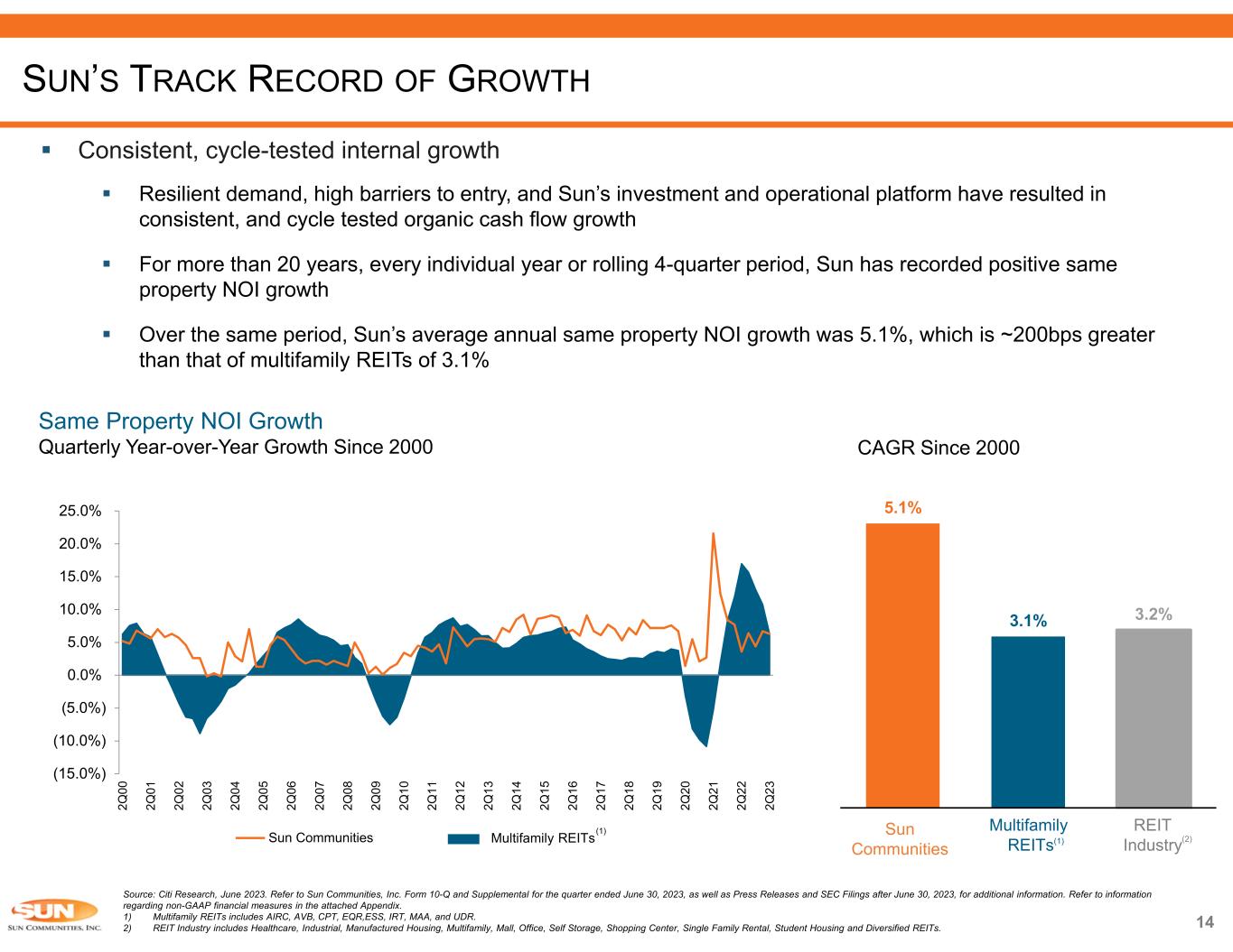 13Source: Company information, NMMA and U.S. Census Bureau. Refer to Sun Communities, Inc. Form 10-Q and Supplemental for the quarter ended June 30, 2023, as well as Press Releases and SEC Filings after June 30, 2023, for additional information. Refer to information regarding non-GAAP financial measures in the attached Appendix. • Existing base of ~12 million registered boats within the U.S. and an estimated supply of 900K - 1 million leasable wet slips and dry storage racks • Shrinking supply of Marinas due to redevelopment of waterfront properties • Pre-owned boat sales under 30’ grew by ~17% from 2012- 2021 whereas sales for boats over 30’ increased ~52% • 49% of Marinas within our portfolio offer service, which increases membership tenure on average by 27% compared to non-service properties COMPELLING SUPPLY - DEMAND FUNDAMENTALS Boat Registrations by Length (2014-2021 CAGR) -1.1% 0.9% 1.2% 0.2% 0.5% < 16' 16'–25 26'–39 40'–65' > 65' C AG R Boat Length Portfolio average wet slip size: ~38’ • Dock Slip Count: 67 • Berth Size: 25’- 100’, Avg. 42’ • Average monthly rent for reconfigured dock is $39 / ft Wet Slip Reconfiguration – 2022 • Dock Slip Count: 62 • Berth Size: 25’- 100’, Avg. 35’ • Average monthly rent for dock was $26 / ft + 5 wet slips +7’ Berth size 53% WA rental rate increase Before After Average Wet Slip Rental Rate Increase Total for Safe Harbor Wickford Cove 3.0% 3.0% 5.8% 8.3% 2020 2021 2022 2023 • As boats become longer and wider, many marinas cannot keep up with increasing vessel size • Recent example of wet slip reconfiguration at Safe Harbor Wickford Cove in North Kingston, Rhode Island demonstrates higher rate achievement: Marinas