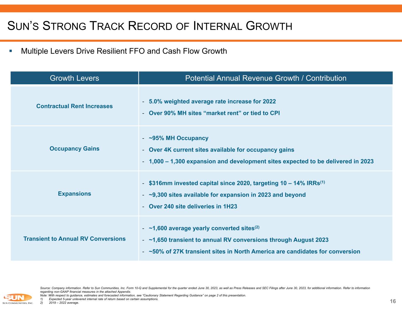 15 Source: Company information and filings of Multi-family REITs listed in footnote (1). Refer to Sun Communities, Inc. Form 10-Q and Supplemental for the quarter ended June 30, 2023, as well as Press Releases and SEC Filings after June 30, 2023, for additional information. Refer to information regarding non-GAAP financial measures in the attached Appendix. Note: With respect to guidance, estimates and forecasted information, see “Cautionary Statement Regarding Guidance” on page 2 of this presentation. 1) Multifamily REITs include AVB, CPT, EQR, ESS, MAA and UDR. 2) Reported core / normalized FFO used above except for CPT given lack of availability, for which basic is used instead. 2023E Core FFO/sh represents midpoint of guidance. 3) Figures on right hand side represent total uplift / associated CAGR. Indexed from 2018 90 100 110 120 130 140 150 160 170 180 2018 2019 2020 2021 2022 2023E Sun Communities Multifamily Core / Normalized FFO Per Share Growth(1)(2)(3) +56 / 9.3% +31 / 5.6% SUN’S TRACK RECORD OF GROWTH  Strong FFO Growth  Sun has generated greater FFO per share growth than Multifamily peers  8.3% Core FFO per share growth (10-year CAGR)  6.0% Core FFO per share yield