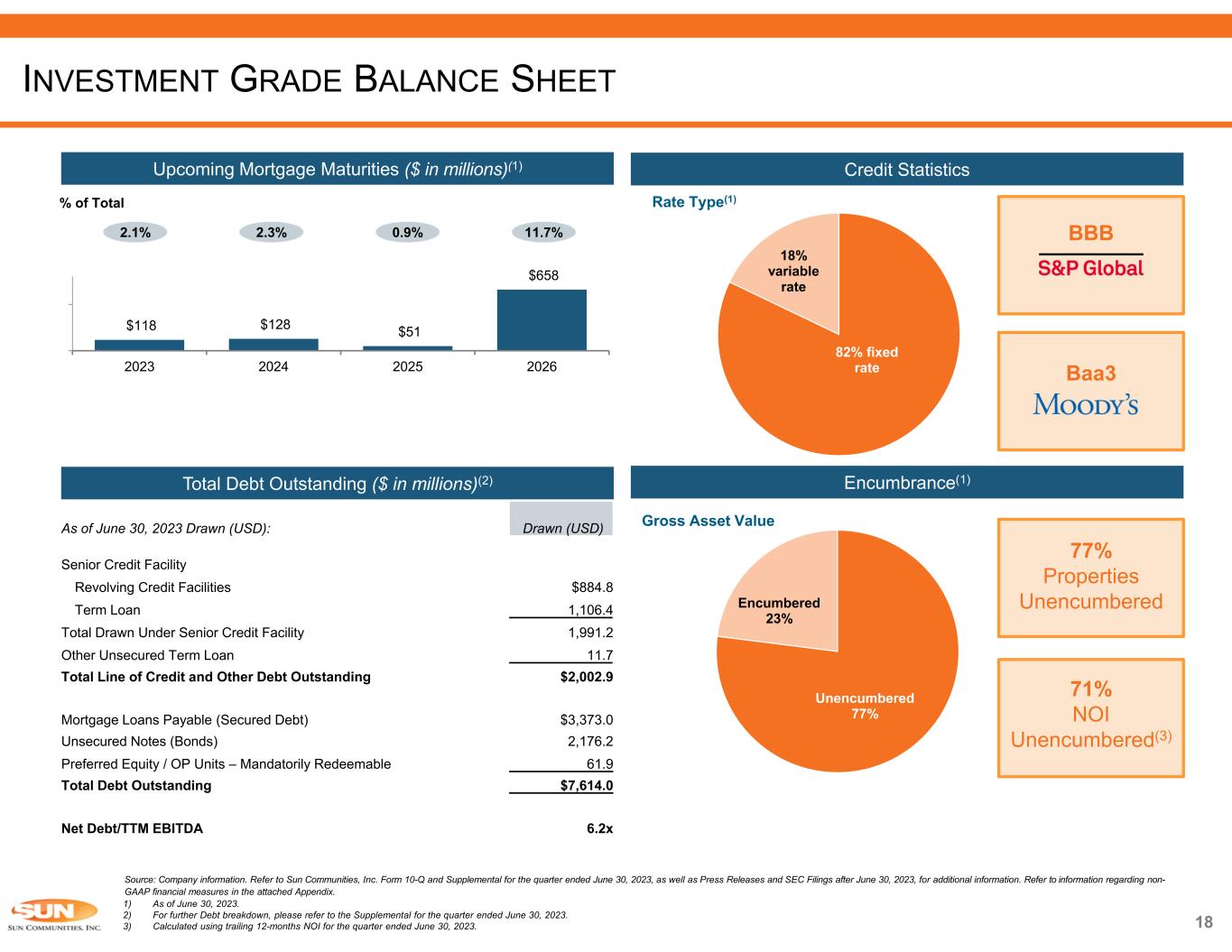 Payroll & benefits 34% Real estate taxes 19% Supplies & repair 13% Utilities 12% Other 12% Legal, local taxes & insurance 10% 17 SUN’S TRACK RECORD OF GROWTH 2023E Same Property Operating Expenses MH, RV and Marina combined MAJESTIC OAKS – ZEPHYRHILLS, FL SAFE HARBOR PIER 77 – BRADENTON, FL Source: Company information. Refer to Sun Communities, Inc. Form 10-Q and Supplemental for the quarter ended June 30, 2023, as well as Press Releases and SEC Filings after June 30, 2023, for additional information. Refer to information regarding non-GAAP financial measures in the attached Appendix. Note: With respect to guidance, estimates and forecasted information, see “Cautionary Statement Regarding Guidance” on page 2 of this presentation.  Operating efficiencies support strong same property NOI results  Same property operating expense growth is projected to be 7.2 – 7.9% in 2023, despite 80% increase in insurance expense for Sun’s MH/RV same property portfolio