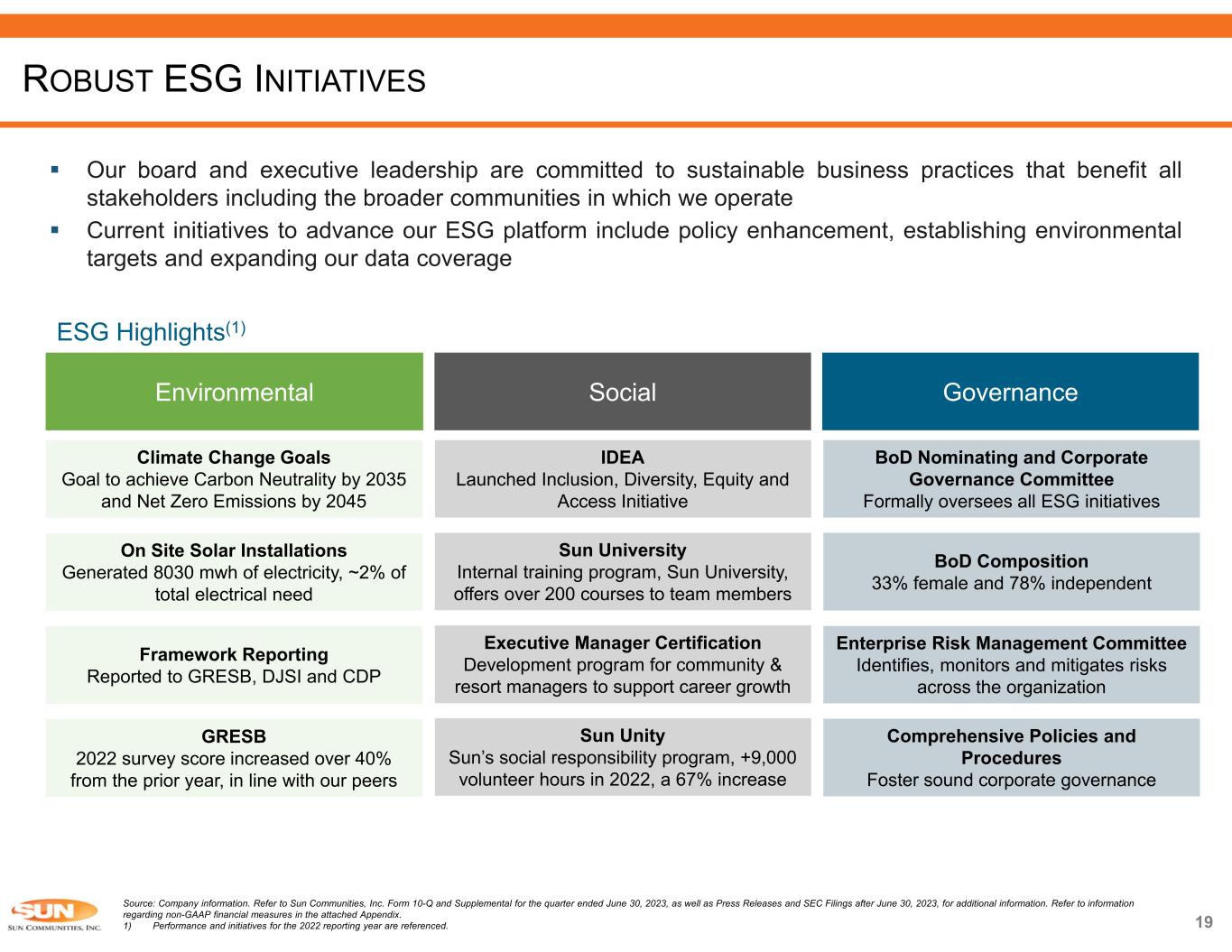 Unencumbered 77% Encumbered 23% 18 Source: Company information. Refer to Sun Communities, Inc. Form 10-Q and Supplemental for the quarter ended June 30, 2023, as well as Press Releases and SEC Filings after June 30, 2023, for additional information. Refer to information regarding non- GAAP financial measures in the attached Appendix. 1) As of June 30, 2023. 2) For further Debt breakdown, please refer to the Supplemental for the quarter ended June 30, 2023. 3) Calculated using trailing 12-months NOI for the quarter ended June 30, 2023. 82% fixed rate 18% variable rate Credit Statistics Rate Type(1) Upcoming Mortgage Maturities ($ in millions)(1) 2.1% 2.3% 0.9% 11.7% % of Total INVESTMENT GRADE BALANCE SHEET Encumbrance(1) Gross Asset Value 71% NOI Unencumbered(3) 77% Properties Unencumbered Total Debt Outstanding ($ in millions)(2) $118 $128 $51 $658 2023 2024 2025 2026 Drawn (USD)As of June 30, 2023 Drawn (USD): Senior Credit Facility $884.8 Revolving Credit Facilities 1,106.4Term Loan 1,991.2Total Drawn Under Senior Credit Facility 11.7Other Unsecured Term Loan $2,002.9 Total Line of Credit and Other Debt Outstanding $3,373.0 Mortgage Loans Payable (Secured Debt) 2,176.2 Unsecured Notes (Bonds) 61.9Preferred Equity / OP Units – Mandatorily Redeemable $7,614.0 Total Debt Outstanding 6.2xNet Debt/TTM EBITDA BBB Baa3