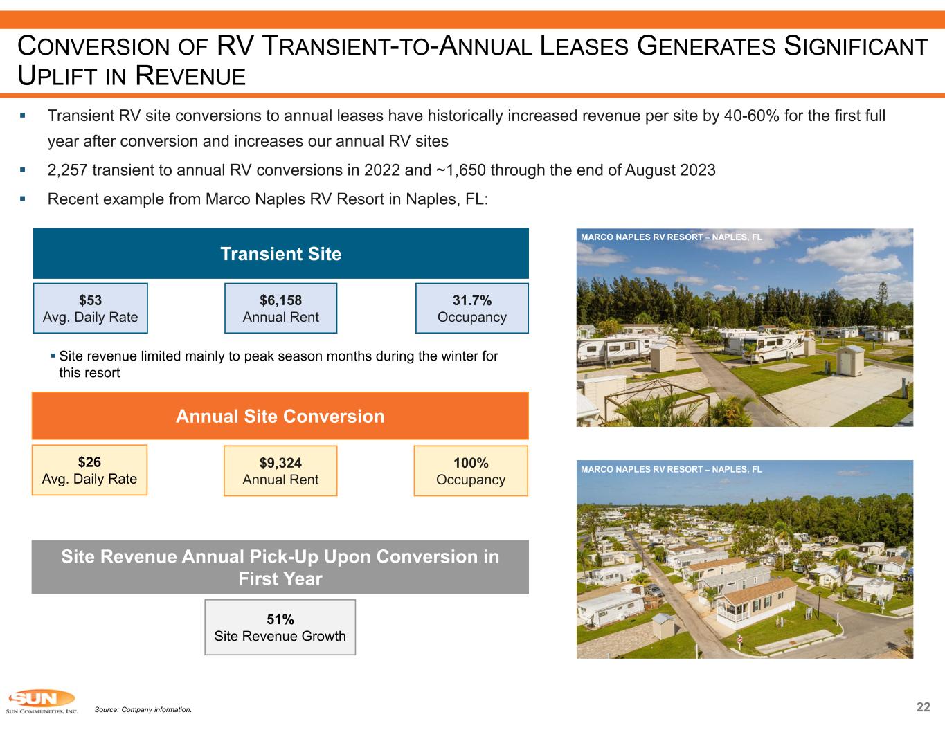 Transient Site  Site revenue limited mainly to peak season months during the winter for this resort 31.7% Occupancy $53 Avg. Daily Rate $6,158 Annual Rent Annual Site Conversion 100% Occupancy $26 Avg. Daily Rate $9,324 Annual Rent Site Revenue Annual Pick-Up Upon Conversion in First Year 51% Site Revenue Growth  Transient RV site conversions to annual leases have historically increased revenue per site by 40-60% for the first full year after conversion and increases our annual RV sites  2,257 transient to annual RV conversions in 2022 and ~1,650 through the end of August 2023  Recent example from Marco Naples RV Resort in Naples, FL: Source: Company information. MARCO NAPLES RV RESORT – NAPLES, FL MARCO NAPLES RV RESORT – NAPLES, FL CONVERSION OF RV TRANSIENT-TO-ANNUAL LEASES GENERATES SIGNIFICANT UPLIFT IN REVENUE 22