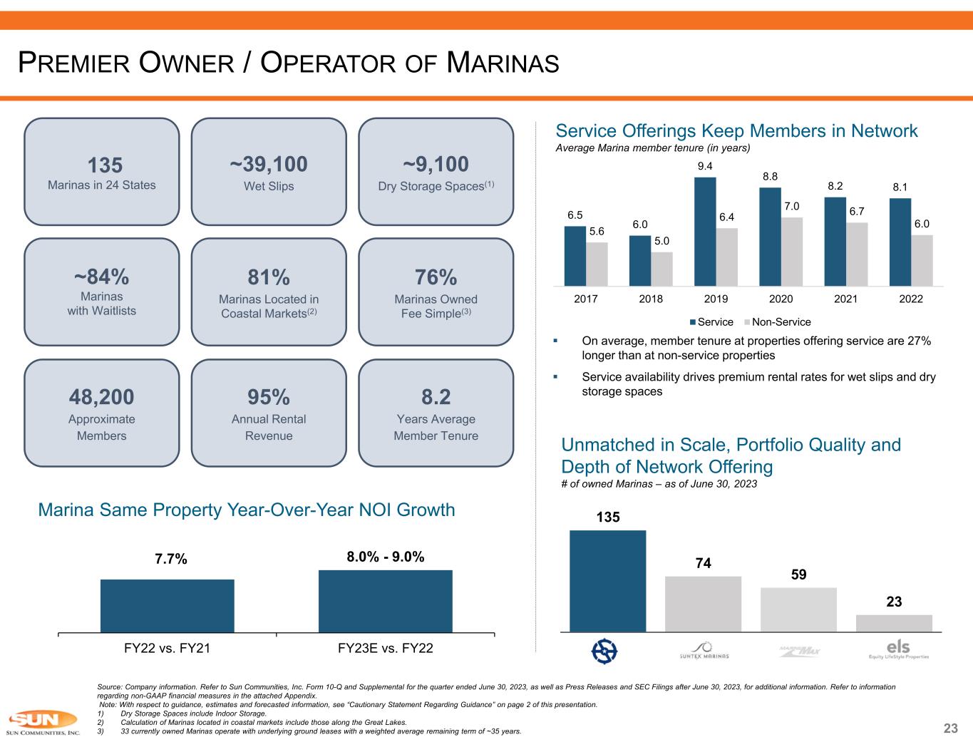 7.7% 8.0% - 9.0% FY22 vs. FY21 FY23E vs. FY22 23 135 Marinas in 24 States ~39,100 Wet Slips ~84% Marinas with Waitlists 81% Marinas Located in Coastal Markets(2) 76% Marinas Owned Fee Simple(3) ~9,100 Dry Storage Spaces(1) 48,200 Approximate Members 95% Annual Rental Revenue 8.2 Years Average Member Tenure Source: Company information. Refer to Sun Communities, Inc. Form 10-Q and Supplemental for the quarter ended June 30, 2023, as well as Press Releases and SEC Filings after June 30, 2023, for additional information. Refer to information regarding non-GAAP financial measures in the attached Appendix. Note: With respect to guidance, estimates and forecasted information, see “Cautionary Statement Regarding Guidance” on page 2 of this presentation. 1) Dry Storage Spaces include Indoor Storage. 2) Calculation of Marinas located in coastal markets include those along the Great Lakes. 3) 33 currently owned Marinas operate with underlying ground leases with a weighted average remaining term of ~35 years. Service Offerings Keep Members in Network Average Marina member tenure (in years)  On average, member tenure at properties offering service are 27% longer than at non-service properties  Service availability drives premium rental rates for wet slips and dry storage spaces Marina Same Property Year-Over-Year NOI Growth Unmatched in Scale, Portfolio Quality and Depth of Network Offering # of owned Marinas – as of June 30, 2023 PREMIER OWNER / OPERATOR OF MARINAS 6.5 6.0 9.4 8.8 8.2 8.1 5.6 5.0 6.4 7.0 6.7 6.0 2017 2018 2019 2020 2021 2022 Service Non-Service 135 74 59 23