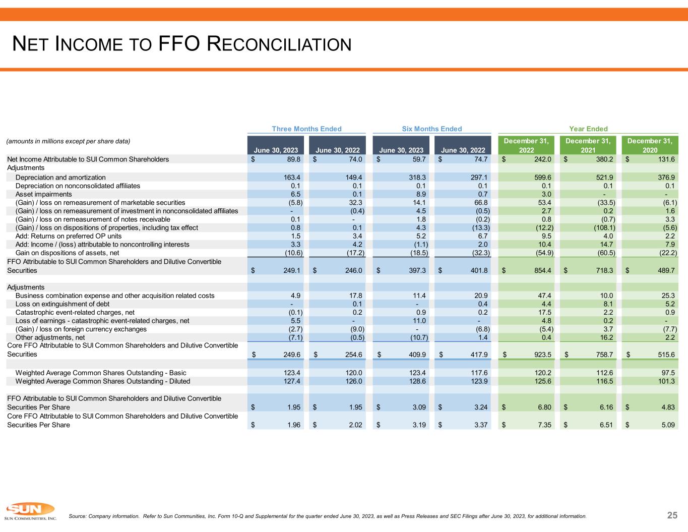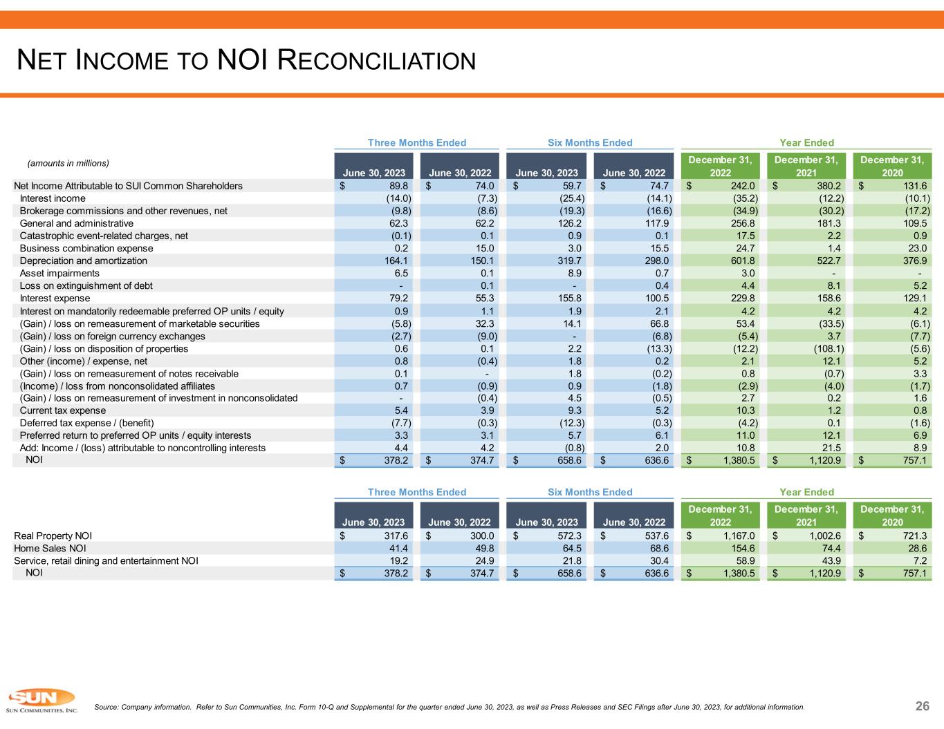 25 (amounts in millions except per share data) Source: Company information. Refer to Sun Communities, Inc. Form 10-Q and Supplemental for the quarter ended June 30, 2023, as well as Press Releases and SEC Filings after June 30, 2023, for additional information. NET INCOME TO FFO RECONCILIATION June 30, 2023 June 30, 2022 June 30, 2023 June 30, 2022 December 31, 2022 December 31, 2021 December 31, 2020 Net Income Attributable to SUI Common Shareholders 89.8$ 74.0$ 59.7$ 74.7$ 242.0$ 380.2$ 131.6$ Adjustments Depreciation and amortization 163.4 149.4 318.3 297.1 599.6 521.9 376.9 Depreciation on nonconsolidated affiliates 0.1 0.1 0.1 0.1 0.1 0.1 0.1 Asset impairments 6.5 0.1 8.9 0.7 3.0 - - (Gain) / loss on remeasurement of marketable securities (5.8) 32.3 14.1 66.8 53.4 (33.5) (6.1) (Gain) / loss on remeasurement of investment in nonconsolidated affiliates - (0.4) 4.5 (0.5) 2.7 0.2 1.6 (Gain) / loss on remeasurement of notes receivable 0.1 - 1.8 (0.2) 0.8 (0.7) 3.3 (Gain) / loss on dispositions of properties, including tax effect 0.8 0.1 4.3 (13.3) (12.2) (108.1) (5.6) Add: Returns on preferred OP units 1.5 3.4 5.2 6.7 9.5 4.0 2.2 Add: Income / (loss) attributable to noncontrolling interests 3.3 4.2 (1.1) 2.0 10.4 14.7 7.9 Gain on dispositions of assets, net (10.6) (17.2) (18.5) (32.3) (54.9) (60.5) (22.2) FFO Attributable to SUI Common Shareholders and Dilutive Convertible Securities 249.1$ 246.0$ 397.3$ 401.8$ 854.4$ 718.3$ 489.7$ Adjustments Business combination expense and other acquisition related costs 4.9 17.8 11.4 20.9 47.4 10.0 25.3 Loss on extinguishment of debt - 0.1 - 0.4 4.4 8.1 5.2 Catastrophic event-related charges, net (0.1) 0.2 0.9 0.2 17.5 2.2 0.9 Loss of earnings - catastrophic event-related charges, net 5.5 - 11.0 - 4.8 0.2 - (Gain) / loss on foreign currency exchanges (2.7) (9.0) - (6.8) (5.4) 3.7 (7.7) Other adjustments, net (7.1) (0.5) (10.7) 1.4 0.4 16.2 2.2 Core FFO Attributable to SUI Common Shareholders and Dilutive Convertible Securities 249.6$ 254.6$ 409.9$ 417.9$ 923.5$ 758.7$ 515.6$ Weighted Average Common Shares Outstanding - Basic 123.4 120.0 123.4 117.6 120.2 112.6 97.5 Weighted Average Common Shares Outstanding - Diluted 127.4 126.0 128.6 123.9 125.6 116.5 101.3 FFO Attributable to SUI Common Shareholders and Dilutive Convertible Securities Per Share 1.95$ 1.95$ 3.09$ 3.24$ 6.80$ 6.16$ 4.83$ Core FFO Attributable to SUI Common Shareholders and Dilutive Convertible Securities Per Share 1.96$ 2.02$ 3.19$ 3.37$ 7.35$ 6.51$ 5.09$ Year EndedSix Months EndedThree Months Ended
