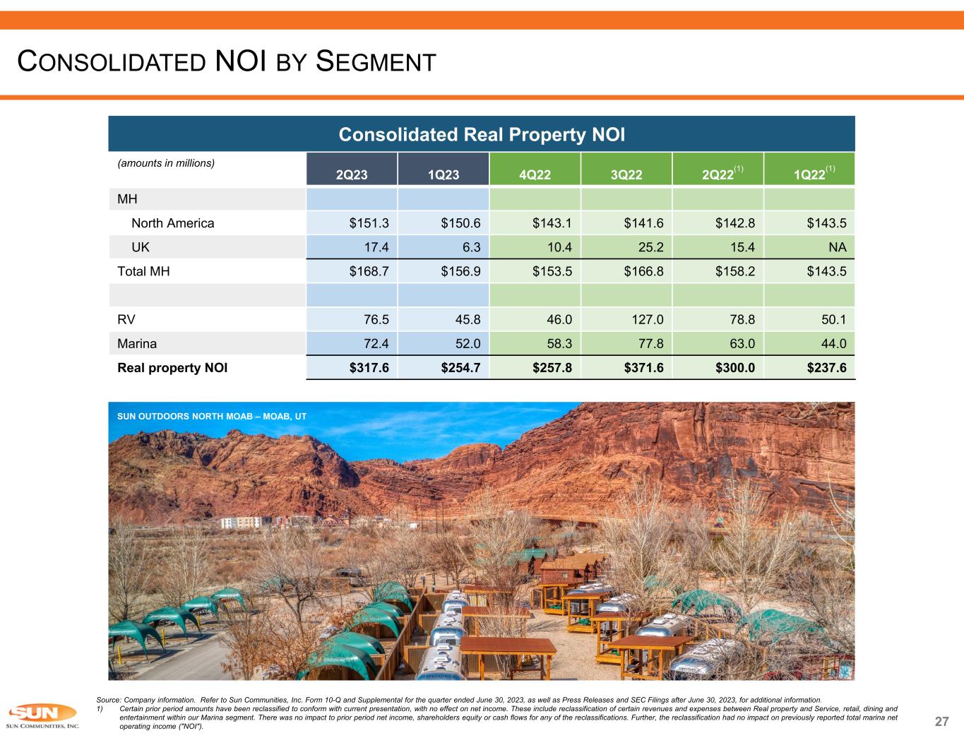 26 (amounts in millions) Source: Company information. Refer to Sun Communities, Inc. Form 10-Q and Supplemental for the quarter ended June 30, 2023, as well as Press Releases and SEC Filings after June 30, 2023, for additional information. NET INCOME TO NOI RECONCILIATION June 30, 2023 June 30, 2022 June 30, 2023 June 30, 2022 December 31, 2022 December 31, 2021 December 31, 2020 Net Income Attributable to SUI Common Shareholders 89.8$ 74.0$ 59.7$ 74.7$ 242.0$ 380.2$ 131.6$ Interest income (14.0) (7.3) (25.4) (14.1) (35.2) (12.2) (10.1) Brokerage commissions and other revenues, net (9.8) (8.6) (19.3) (16.6) (34.9) (30.2) (17.2) General and administrative 62.3 62.2 126.2 117.9 256.8 181.3 109.5 Catastrophic event-related charges, net (0.1) 0.1 0.9 0.1 17.5 2.2 0.9 Business combination expense 0.2 15.0 3.0 15.5 24.7 1.4 23.0 Depreciation and amortization 164.1 150.1 319.7 298.0 601.8 522.7 376.9 Asset impairments 6.5 0.1 8.9 0.7 3.0 - - Loss on extinguishment of debt - 0.1 - 0.4 4.4 8.1 5.2 Interest expense 79.2 55.3 155.8 100.5 229.8 158.6 129.1 Interest on mandatorily redeemable preferred OP units / equity 0.9 1.1 1.9 2.1 4.2 4.2 4.2 (Gain) / loss on remeasurement of marketable securities (5.8) 32.3 14.1 66.8 53.4 (33.5) (6.1) (Gain) / loss on foreign currency exchanges (2.7) (9.0) - (6.8) (5.4) 3.7 (7.7) (Gain) / loss on disposition of properties 0.6 0.1 2.2 (13.3) (12.2) (108.1) (5.6) Other (income) / expense, net 0.8 (0.4) 1.8 0.2 2.1 12.1 5.2 (Gain) / loss on remeasurement of notes receivable 0.1 - 1.8 (0.2) 0.8 (0.7) 3.3 (Income) / loss from nonconsolidated affiliates 0.7 (0.9) 0.9 (1.8) (2.9) (4.0) (1.7) (Gain) / loss on remeasurement of investment in nonconsolidated - (0.4) 4.5 (0.5) 2.7 0.2 1.6 Current tax expense 5.4 3.9 9.3 5.2 10.3 1.2 0.8 Deferred tax expense / (benefit) (7.7) (0.3) (12.3) (0.3) (4.2) 0.1 (1.6) Preferred return to preferred OP units / equity interests 3.3 3.1 5.7 6.1 11.0 12.1 6.9 Add: Income / (loss) attributable to noncontrolling interests 4.4 4.2 (0.8) 2.0 10.8 21.5 8.9 NOI 378.2$ 374.7$ 658.6$ 636.6$ 1,380.5$ 1,120.9$ 757.1$ June 30, 2023 June 30, 2022 June 30, 2023 June 30, 2022 December 31, 2022 December 31, 2021 December 31, 2020 Real Property NOI 317.6$ 300.0$ 572.3$ 537.6$ 1,167.0$ 1,002.6$ 721.3$ Home Sales NOI 41.4 49.8 64.5 68.6 154.6 74.4 28.6 Service, retail dining and entertainment NOI 19.2 24.9 21.8 30.4 58.9 43.9 7.2 NOI 378.2$ 374.7$ 658.6$ 636.6$ 1,380.5$ 1,120.9$ 757.1$ Year Ended Year Ended Three Months Ended Three Months Ended Six Months Ended Six Months Ended