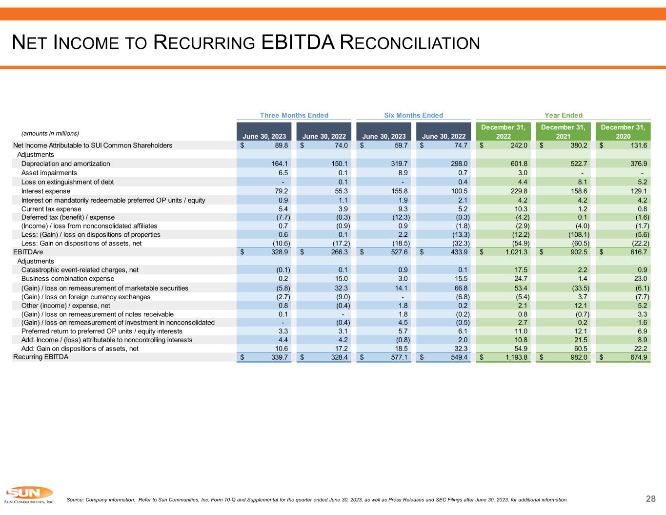 28 (amounts in millions) Source: Company information. Refer to Sun Communities, Inc. Form 10-Q and Supplemental for the quarter ended June 30, 2023, as well as Press Releases and SEC Filings after June 30, 2023, for additional information. NET INCOME TO RECURRING EBITDA RECONCILIATION June 30, 2023 June 30, 2022 June 30, 2023 June 30, 2022 December 31, 2022 December 31, 2021 December 31, 2020 Net Income Attributable to SUI Common Shareholders 89.8$ 74.0$ 59.7$ 74.7$ 242.0$ 380.2$ 131.6$ Adjustments Depreciation and amortization 164.1 150.1 319.7 298.0 601.8 522.7 376.9 Asset impairments 6.5 0.1 8.9 0.7 3.0 - - Loss on extinguishment of debt - 0.1 - 0.4 4.4 8.1 5.2 Interest expense 79.2 55.3 155.8 100.5 229.8 158.6 129.1 Interest on mandatorily redeemable preferred OP units / equity 0.9 1.1 1.9 2.1 4.2 4.2 4.2 Current tax expense 5.4 3.9 9.3 5.2 10.3 1.2 0.8 Deferred tax (benefit) / expense (7.7) (0.3) (12.3) (0.3) (4.2) 0.1 (1.6) (Income) / loss from nonconsolidated affiliates 0.7 (0.9) 0.9 (1.8) (2.9) (4.0) (1.7) Less: (Gain) / loss on dispositions of properties 0.6 0.1 2.2 (13.3) (12.2) (108.1) (5.6) Less: Gain on dispositions of assets, net (10.6) (17.2) (18.5) (32.3) (54.9) (60.5) (22.2) EBITDAre 328.9$ 266.3$ 527.6$ 433.9$ 1,021.3$ 902.5$ 616.7$ Adjustments Catastrophic event-related charges, net (0.1) 0.1 0.9 0.1 17.5 2.2 0.9 Business combination expense 0.2 15.0 3.0 15.5 24.7 1.4 23.0 (Gain) / loss on remeasurement of marketable securities (5.8) 32.3 14.1 66.8 53.4 (33.5) (6.1) (Gain) / loss on foreign currency exchanges (2.7) (9.0) - (6.8) (5.4) 3.7 (7.7) Other (income) / expense, net 0.8 (0.4) 1.8 0.2 2.1 12.1 5.2 (Gain) / loss on remeasurement of notes receivable 0.1 - 1.8 (0.2) 0.8 (0.7) 3.3 (Gain) / loss on remeasurement of investment in nonconsolidated - (0.4) 4.5 (0.5) 2.7 0.2 1.6 Preferred return to preferred OP units / equity interests 3.3 3.1 5.7 6.1 11.0 12.1 6.9 Add: Income / (loss) attributable to noncontrolling interests 4.4 4.2 (0.8) 2.0 10.8 21.5 8.9 Add: Gain on dispositions of assets, net 10.6 17.2 18.5 32.3 54.9 60.5 22.2 Recurring EBITDA 339.7$ 328.4$ 577.1$ 549.4$ 1,193.8$ 982.0$ 674.9$ Year EndedThree Months Ended Six Months Ended