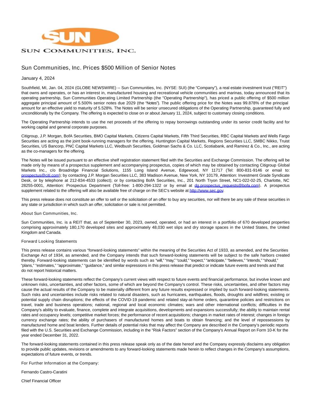 Sun Communities, Inc. Prices $500 Million of Senior Notes January 4, 2024 Southfield, MI, Jan. 04, 2024 (GLOBE NEWSWIRE) -- Sun Communities, Inc. (NYSE: SUI) (the “Company”), a real estate investment trust (“REIT”) that owns and operates, or has an interest in, manufactured housing and recreational vehicle communities and marinas, today announced that its operating partnership, Sun Communities Operating Limited Partnership (the "Operating Partnership"), has priced a public offering of $500 million aggregate principal amount of 5.500% senior notes due 2029 (the “Notes”). The public offering price for the Notes was 99.878% of the principal amount for an effective yield to maturity of 5.528%. The Notes will be senior unsecured obligations of the Operating Partnership, guaranteed fully and unconditionally by the Company. The offering is expected to close on or about January 11, 2024, subject to customary closing conditions. The Operating Partnership intends to use the net proceeds of the offering to repay borrowings outstanding under its senior credit facility and for working capital and general corporate purposes. Citigroup, J.P. Morgan, BofA Securities, BMO Capital Markets, Citizens Capital Markets, Fifth Third Securities, RBC Capital Markets and Wells Fargo Securities are acting as the joint book-running managers for the offering. Huntington Capital Markets, Regions Securities LLC, SMBC Nikko, Truist Securities, US Bancorp, PNC Capital Markets LLC, Wedbush Securities, Goldman Sachs & Co. LLC, Scotiabank, and Ramirez & Co., Inc., are acting as the co-managers for the offering. The Notes will be issued pursuant to an effective shelf registration statement filed with the Securities and Exchange Commission. The offering will be made only by means of a prospectus supplement and accompanying prospectus, copies of which may be obtained by contacting Citigroup Global Markets Inc., c/o Broadridge Financial Solutions, 1155 Long Island Avenue, Edgewood, NY 11717 (Tel: 800-831-9146 or email to: prospectus@citi.com); by contacting J.P. Morgan Securities LLC, 383 Madison Avenue, New York, NY 10179, Attention: Investment Grade Syndicate Desk, or by telephone at 212-834-4533 (collect); or by contacting BofA Securities, Inc., 201 North Tryon Street, NC1-022-02-25, Charlotte, NC 28255-0001, Attention: Prospectus Department (Toll-free: 1-800-294-1322 or by email at dg.prospectus_requests@bofa.com). A prospectus supplement related to the offering will also be available free of charge on the SEC's website at http://www.sec.gov. This press release does not constitute an offer to sell or the solicitation of an offer to buy any securities, nor will there be any sale of these securities in any state or jurisdiction in which such an offer, solicitation or sale is not permitted. About Sun Communities, Inc. Sun Communities, Inc. is a REIT that, as of September 30, 2023, owned, operated, or had an interest in a portfolio of 670 developed properties comprising approximately 180,170 developed sites and approximately 48,030 wet slips and dry storage spaces in the United States, the United Kingdom and Canada. Forward Looking Statements This press release contains various “forward-looking statements” within the meaning of the Securities Act of 1933, as amended, and the Securities Exchange Act of 1934, as amended, and the Company intends that such forward-looking statements will be subject to the safe harbors created thereby. Forward-looking statements can be identified by words such as “will,” “may,” “could,” “expect,” “anticipate,” “believes,” “intends,” “should,” “plans,” “estimates,” “approximate,” “guidance,” and similar expressions in this press release that predict or indicate future events and trends and that do not report historical matters. These forward-looking statements reflect the Company's current views with respect to future events and financial performance, but involve known and unknown risks, uncertainties, and other factors, some of which are beyond the Company's control. These risks, uncertainties, and other factors may cause the actual results of the Company to be materially different from any future results expressed or implied by such forward-looking statements. Such risks and uncertainties include risks related to natural disasters, such as hurricanes, earthquakes, floods, droughts and wildfires; existing or potential supply chain disruptions; the effects of the COVID-19 pandemic and related stay-at-home orders, quarantine policies and restrictions on travel, trade and business operations; national, regional and local economic climates; wars and other international conflicts; difficulties in the Company's ability to evaluate, finance, complete and integrate acquisitions, developments and expansions successfully; the ability to maintain rental rates and occupancy levels; competitive market forces; the performance of recent acquisitions; changes in market rates of interest; changes in foreign currency exchange rates; the ability of purchasers of manufactured homes and boats to obtain financing; and the level of repossessions by manufactured home and boat lenders. Further details of potential risks that may affect the Company are described in the Company’s periodic reports filed with the U.S. Securities and Exchange Commission, including in the “Risk Factors” section of the Company's Annual Report on Form 10-K for the year ended December 31, 2022. The forward-looking statements contained in this press release speak only as of the date hereof and the Company expressly disclaims any obligation to provide public updates, revisions or amendments to any forward-looking statements made herein to reflect changes in the Company's assumptions, expectations of future events, or trends. For Further Information at the Company: Fernando Castro-Caratini Chief Financial Officer