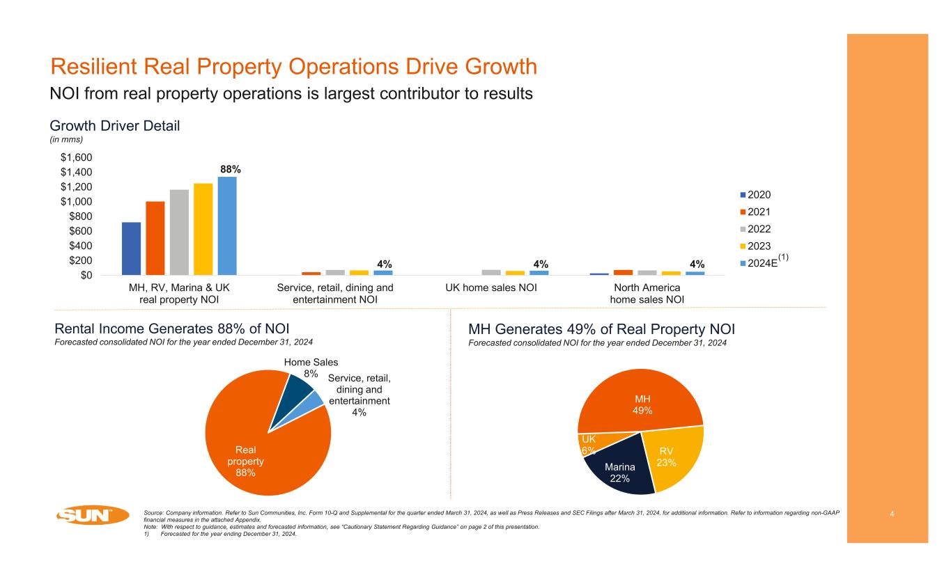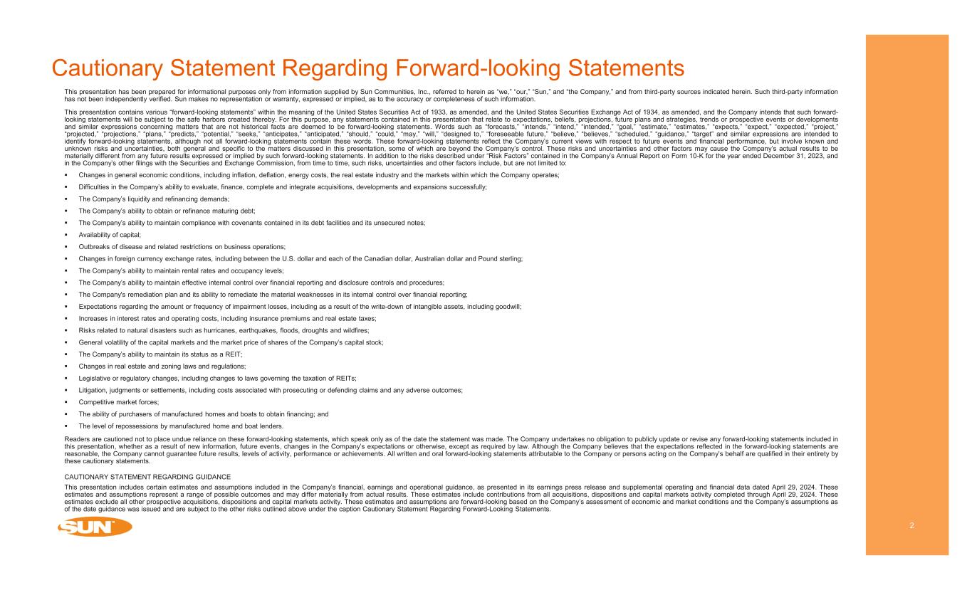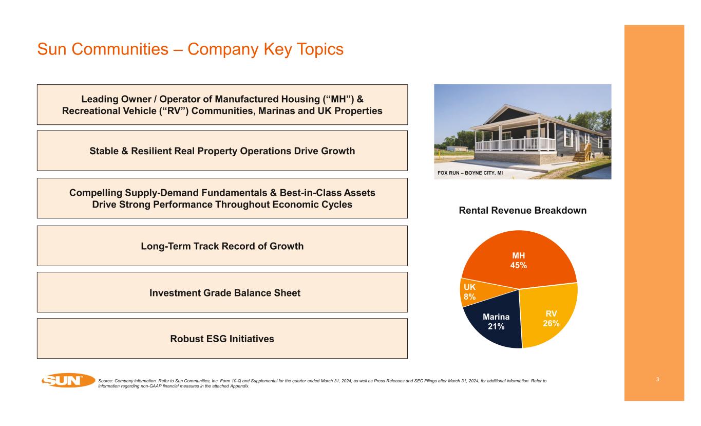 Cautionary Statement Regarding Forward-looking Statements 2 This presentation has been prepared for informational purposes only from information supplied by Sun Communities, Inc., referred to herein as “we,” “our,” “Sun,” and “the Company,” and from third-party sources indicated herein. Such third-party information has not been independently verified. Sun makes no representation or warranty, expressed or implied, as to the accuracy or completeness of such information. This presentation contains various “forward-looking statements” within the meaning of the United States Securities Act of 1933, as amended, and the United States Securities Exchange Act of 1934, as amended, and the Company intends that such forward- looking statements will be subject to the safe harbors created thereby. For this purpose, any statements contained in this presentation that relate to expectations, beliefs, projections, future plans and strategies, trends or prospective events or developments and similar expressions concerning matters that are not historical facts are deemed to be forward-looking statements. Words such as “forecasts,” “intends,” “intend,” “intended,” “goal,” “estimate,” “estimates,” “expects,” “expect,” “expected,” “project,” “projected,” “projections,” “plans,” “predicts,” “potential,” “seeks,” “anticipates,” “anticipated,” “should,” “could,” “may,” “will,” “designed to,” “foreseeable future,” “believe,” “believes,” “scheduled,” “guidance,” “target” and similar expressions are intended to identify forward-looking statements, although not all forward-looking statements contain these words. These forward-looking statements reflect the Company’s current views with respect to future events and financial performance, but involve known and unknown risks and uncertainties, both general and specific to the matters discussed in this presentation, some of which are beyond the Company’s control. These risks and uncertainties and other factors may cause the Company’s actual results to be materially different from any future results expressed or implied by such forward-looking statements. In addition to the risks described under “Risk Factors” contained in the Company’s Annual Report on Form 10-K for the year ended December 31, 2023, and in the Company’s other filings with the Securities and Exchange Commission, from time to time, such risks, uncertainties and other factors include, but are not limited to: Changes in general economic conditions, including inflation, deflation, energy costs, the real estate industry and the markets within which the Company operates; Difficulties in the Company’s ability to evaluate, finance, complete and integrate acquisitions, developments and expansions successfully; The Company’s liquidity and refinancing demands; The Company’s ability to obtain or refinance maturing debt; The Company’s ability to maintain compliance with covenants contained in its debt facilities and its unsecured notes; Availability of capital; Outbreaks of disease and related restrictions on business operations; Changes in foreign currency exchange rates, including between the U.S. dollar and each of the Canadian dollar, Australian dollar and Pound sterling; The Company’s ability to maintain rental rates and occupancy levels; The Company’s ability to maintain effective internal control over financial reporting and disclosure controls and procedures; The Company's remediation plan and its ability to remediate the material weaknesses in its internal control over financial reporting; Expectations regarding the amount or frequency of impairment losses, including as a result of the write-down of intangible assets, including goodwill; Increases in interest rates and operating costs, including insurance premiums and real estate taxes; Risks related to natural disasters such as hurricanes, earthquakes, floods, droughts and wildfires; General volatility of the capital markets and the market price of shares of the Company’s capital stock; The Company’s ability to maintain its status as a REIT; Changes in real estate and zoning laws and regulations; Legislative or regulatory changes, including changes to laws governing the taxation of REITs; Litigation, judgments or settlements, including costs associated with prosecuting or defending claims and any adverse outcomes; Competitive market forces; The ability of purchasers of manufactured homes and boats to obtain financing; and The level of repossessions by manufactured home and boat lenders. Readers are cautioned not to place undue reliance on these forward-looking statements, which speak only as of the date the statement was made. The Company undertakes no obligation to publicly update or revise any forward-looking statements included in this presentation, whether as a result of new information, future events, changes in the Company’s expectations or otherwise, except as required by law. Although the Company believes that the expectations reflected in the forward-looking statements are reasonable, the Company cannot guarantee future results, levels of activity, performance or achievements. All written and oral forward-looking statements attributable to the Company or persons acting on the Company’s behalf are qualified in their entirety by these cautionary statements. CAUTIONARY STATEMENT REGARDING GUIDANCE This presentation includes certain estimates and assumptions included in the Company’s financial, earnings and operational guidance, as presented in its earnings press release and supplemental operating and financial data dated April 29, 2024. These estimates and assumptions represent a range of possible outcomes and may differ materially from actual results. These estimates include contributions from all acquisitions, dispositions and capital markets activity completed through April 29,