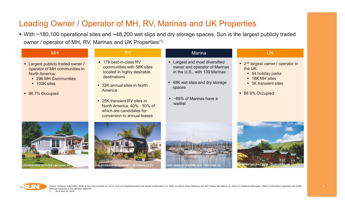 $0 $200 $400 $600 $800 $1,000 $1,200 $1,400 $1,600 MH, RV, Marina & UK real property NOI Service, retail, dining and entertainment NOI UK home sales NOI North America home sales NOI 2020 2021 2022 2023 2024E Real property 88% Home Sales 8% Service, retail, dining and entertainment 4% Resilient Real Property Operations Drive Growth 4 NOI from real property operations is largest contributor to results MH 49% RV 23%Marina 22% UK 6% Growth Driver Detail (in mms) Rental Income Generates 88% of NOI Forecasted consolidated NOI for the year ended December 31, 2024 MH Generates 49% of Real Property NOI Forecasted consolidated NOI for the year ended December 31, 2024 Source: Company information. Refer to Sun Communities, Inc. Form 10-Q and Supplemental for the quarter ended March 31, 2024, as well as Press Releases and SEC Filings after March 31, 2024, for additional information. Refer to information regarding non-GAAP financial measures in the attached Appendix. Note: With respect to guidance, estimates and forecasted information, see “Cautionary Statement Regarding Guidance” on page 2 of this presentation. 1) Forecasted for the year ending December 31, 2024. 88% 4% 4% 4% (1)