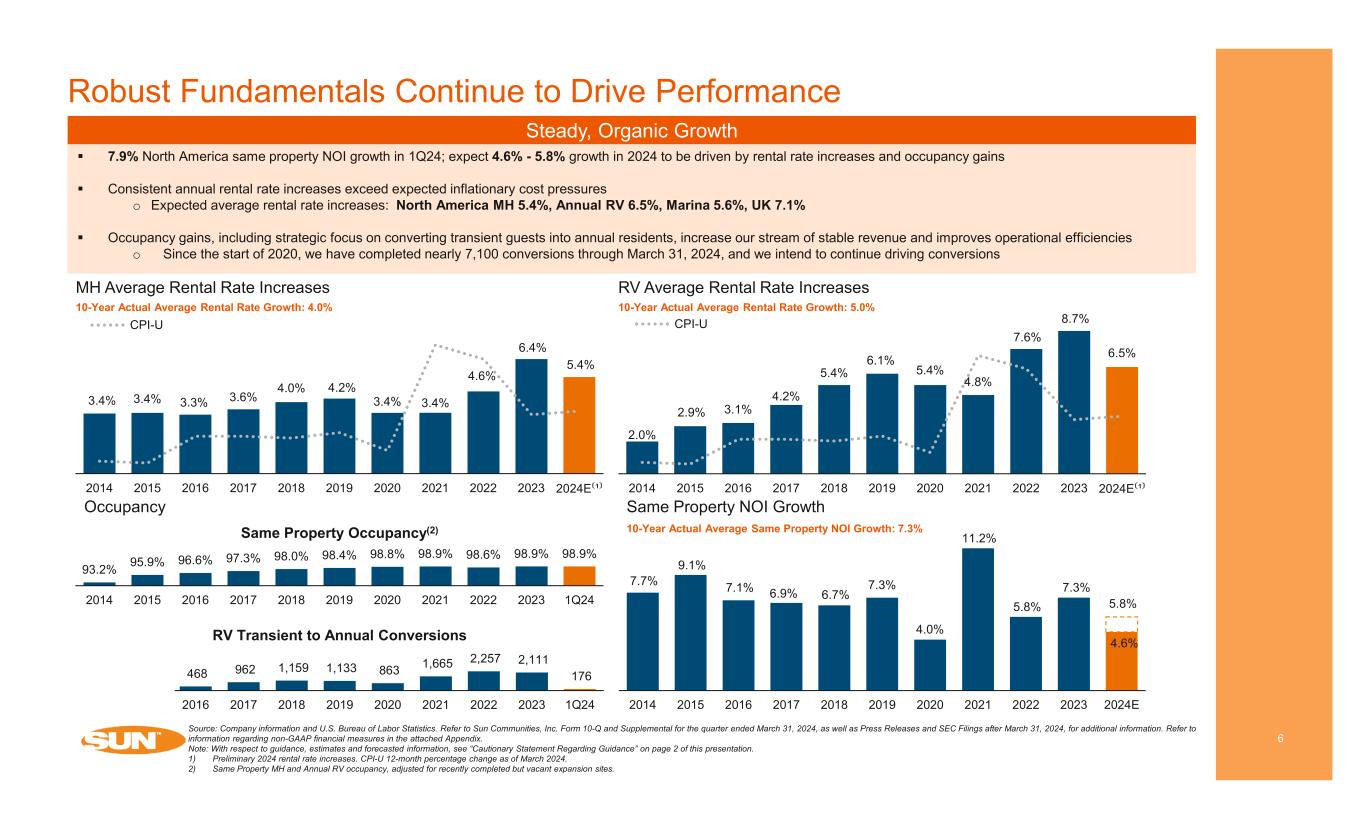 5 With ~180,100 operational sites and ~48,200 wet slips and dry storage spaces, Sun is the largest publicly traded owner / operator of MH, RV, Marinas and UK Properties(1) Leading Owner / Operator of MH, RV, Marinas and UK Properties MH Largest publicly traded owner / operator of MH communities in North America: 296 MH Communities 100K sites 96.7% Occupied 2nd largest owner / operator in the UK: 54 holiday parks 18K MH sites 3K transient sites RV 179 best-in-class RV communities with 58K sites located in highly desirable destinations 33K annual sites in North America 25K transient RV sites in North America, 40% - 50% of which are candidates for conversion to annual leases SUN RETREATS GLEN HAVEN – ZEPHYRHILLS, FL Largest and most diversified owner and operator of Marinas in the U.S., with 139 Marinas Marina 48K wet slips and dry storage spaces ~89% of Marinas have a waitlist SAFE HARBOR VENTURA ISLE – VENTURA, CACOUNTRYSIDE ESTATES – MCKEAN, PA Source: Company information. Refer to Sun Communities, Inc. Form 10-Q and Supplemental for the quarter ended March 31, 2024, as well as Press Releases and SEC Filings after March 31, 2024, for additional information. Refer to information regarding non-GAAP financial measures in the attached Appendix. 1) As of April 30, 2024. UK CHANTRY HOLIDAY PARK – YORKSHIRE, UK 88.9% Occupied